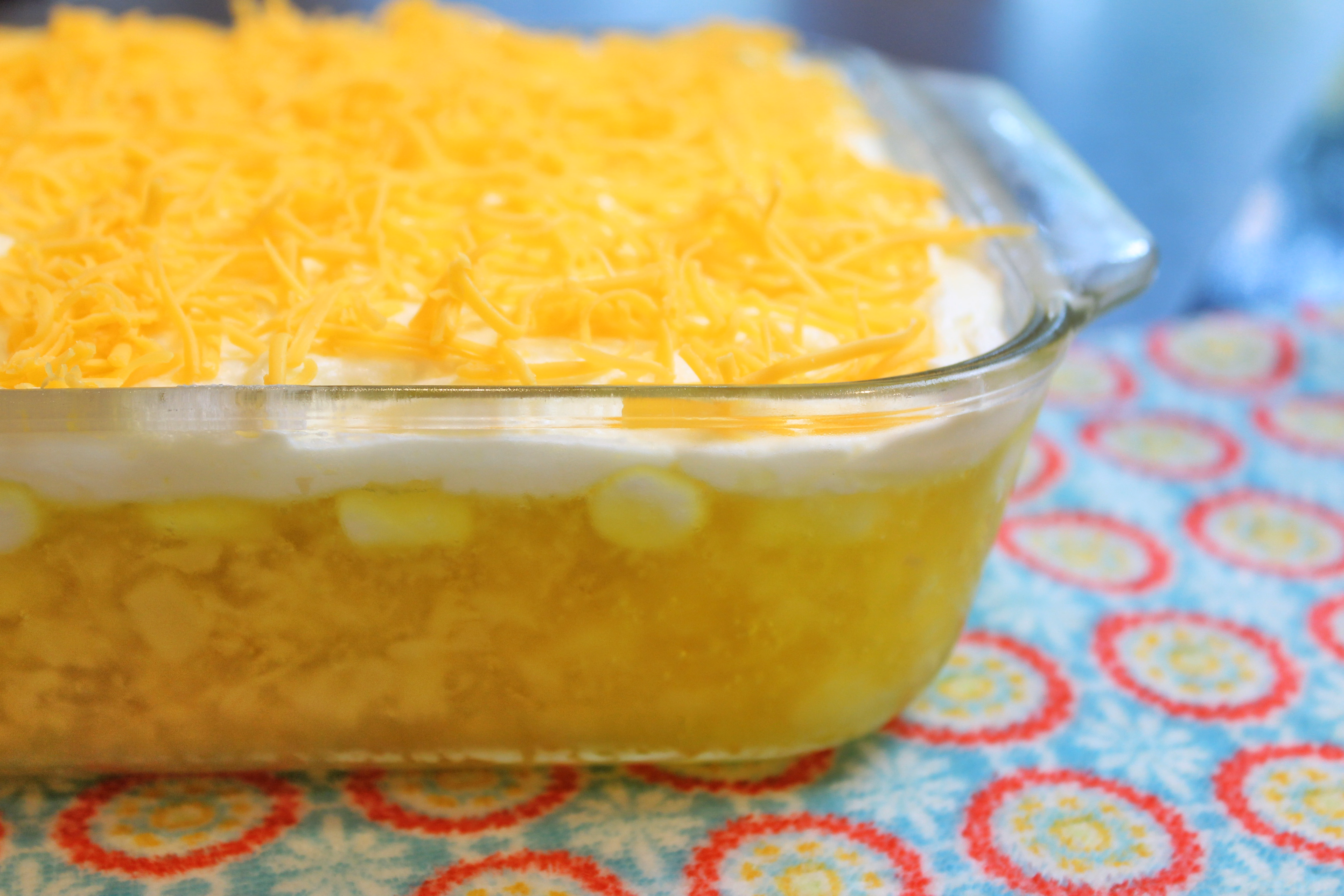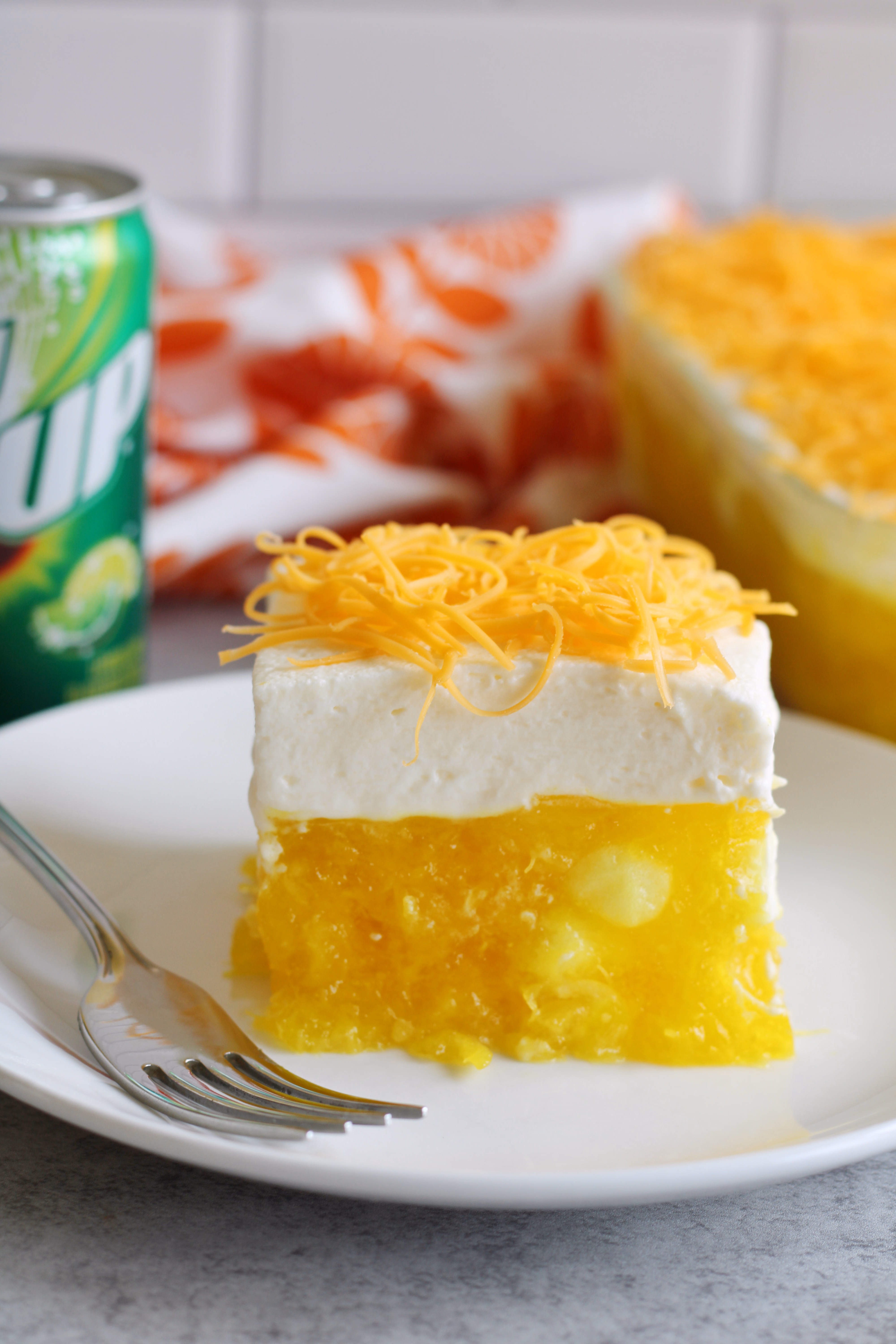 For a fun and unique side dish, you need to try this 7up salad! Made with soda mixed into the pineapple gelatin layer, it has a fun fizzy taste. The topping is to die for. It's like a delicious and light homemade pineapple pudding. Top the whole thing with a sprinkling of cheddar cheese..... and you will not believe the awesome combination of flavors! This reminds me of my childhood and Thanksgiving dinners. 7up Salad was often on the menu and was like a dessert along with the meal - even before the pies came out!