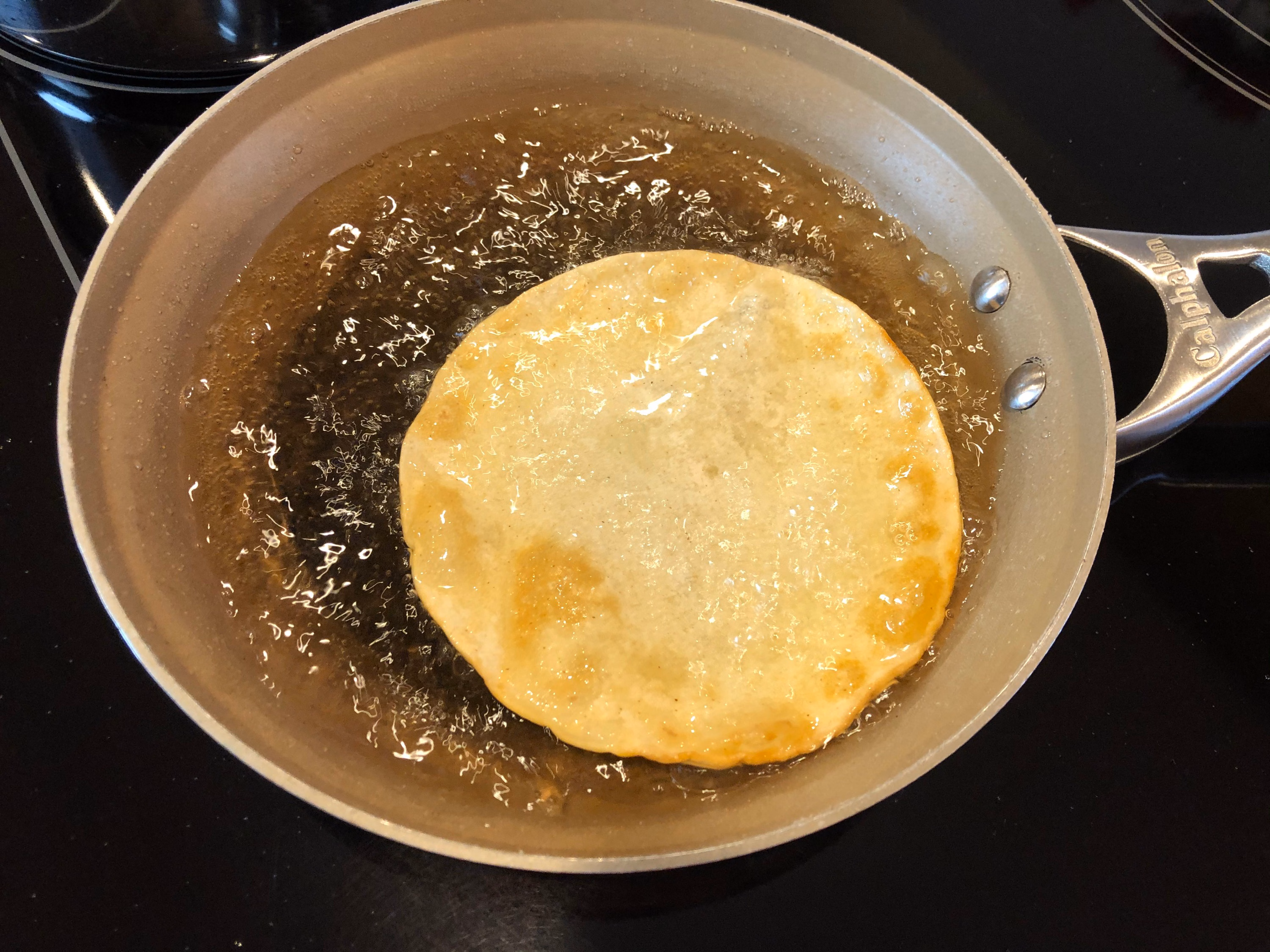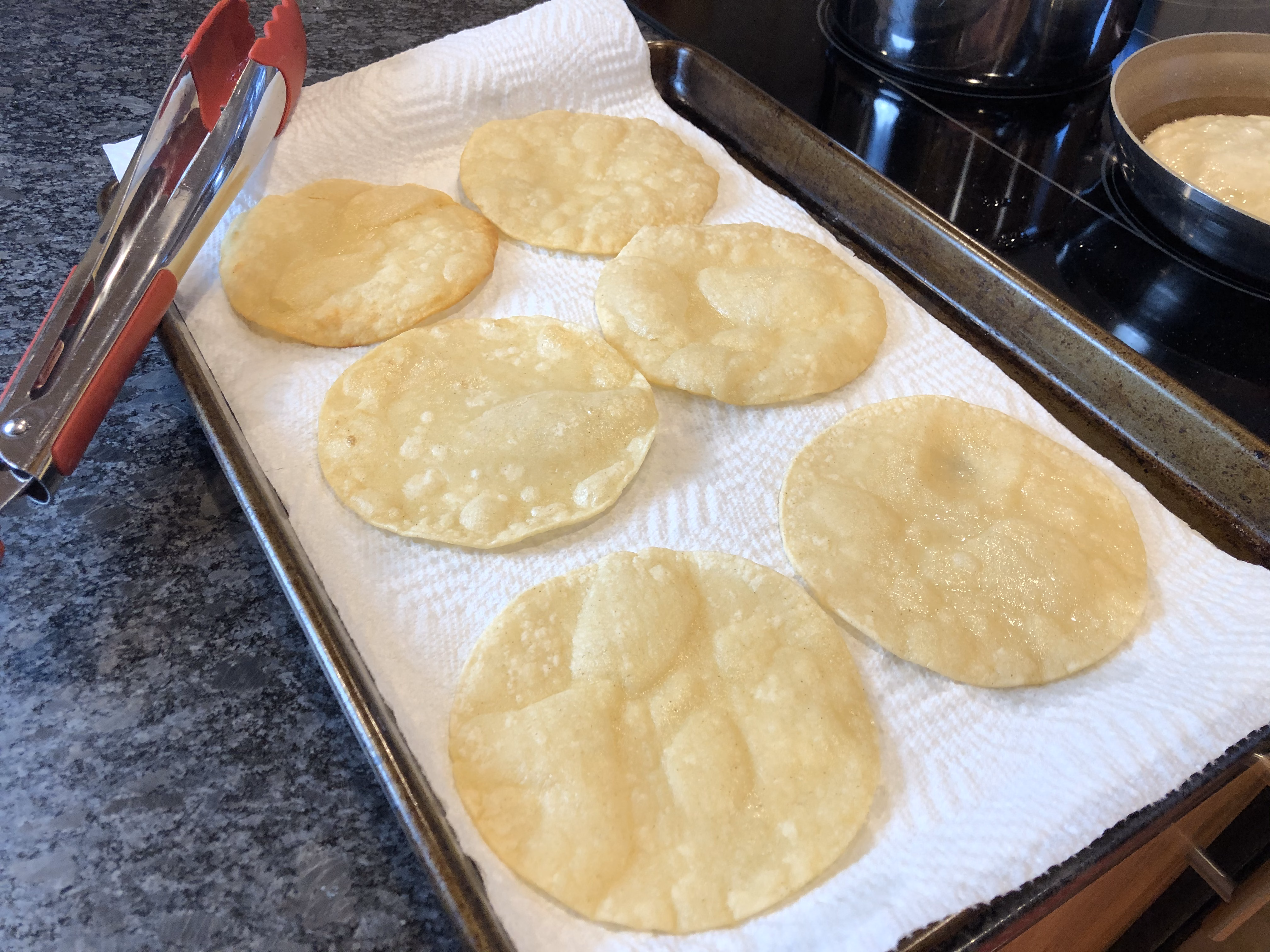 Start frying the tortillas one at a time. It will only take a minute per side to get them to a point of not being flimsy. We aren't going for too much browning here. Be sure to flip them over and fry both sides.