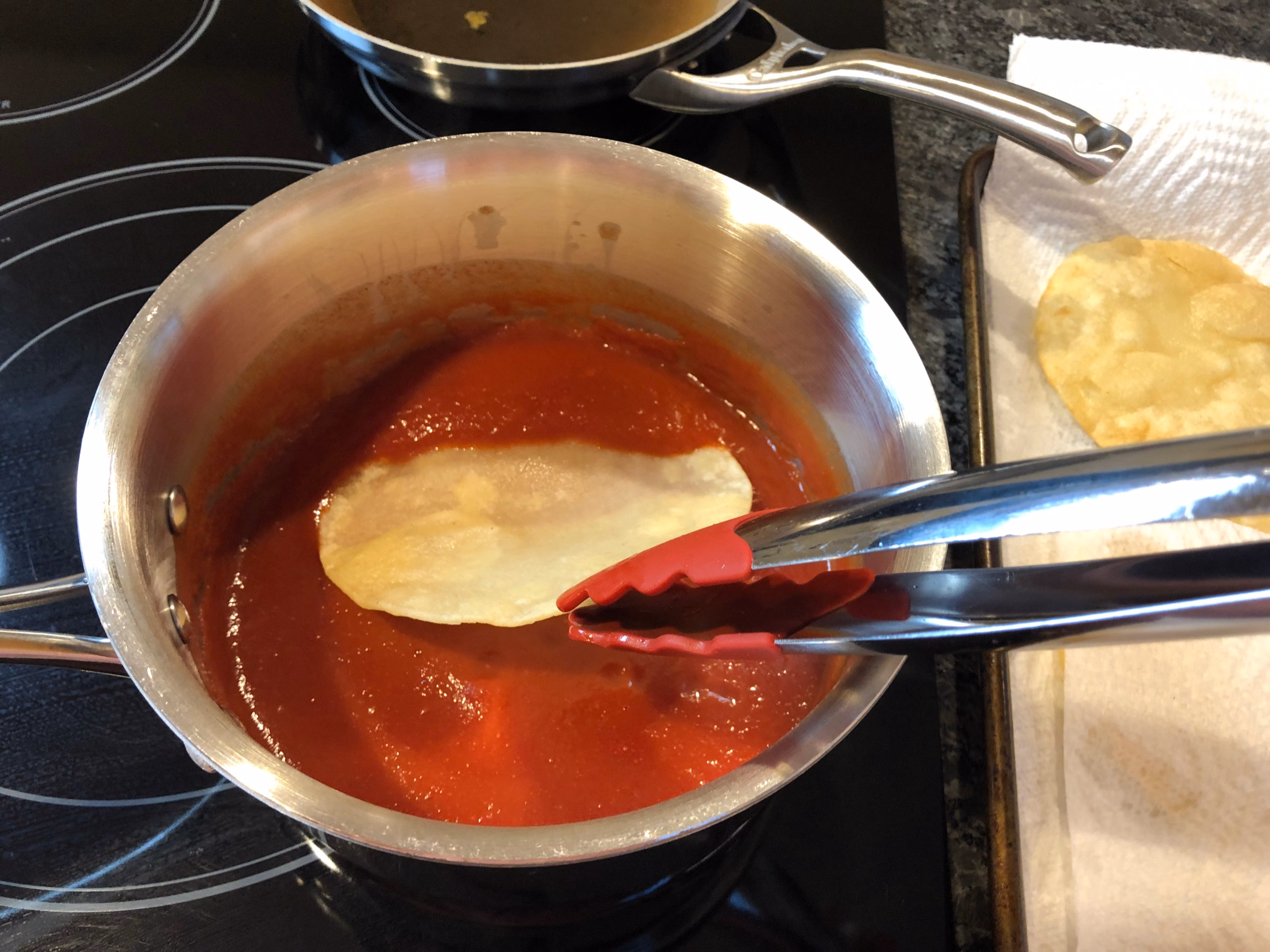 When all the tortillas are fried, get your dinner plates and start assembling. Dip each tortilla in the tomato sauce so that it is covered with sauce on both sides.