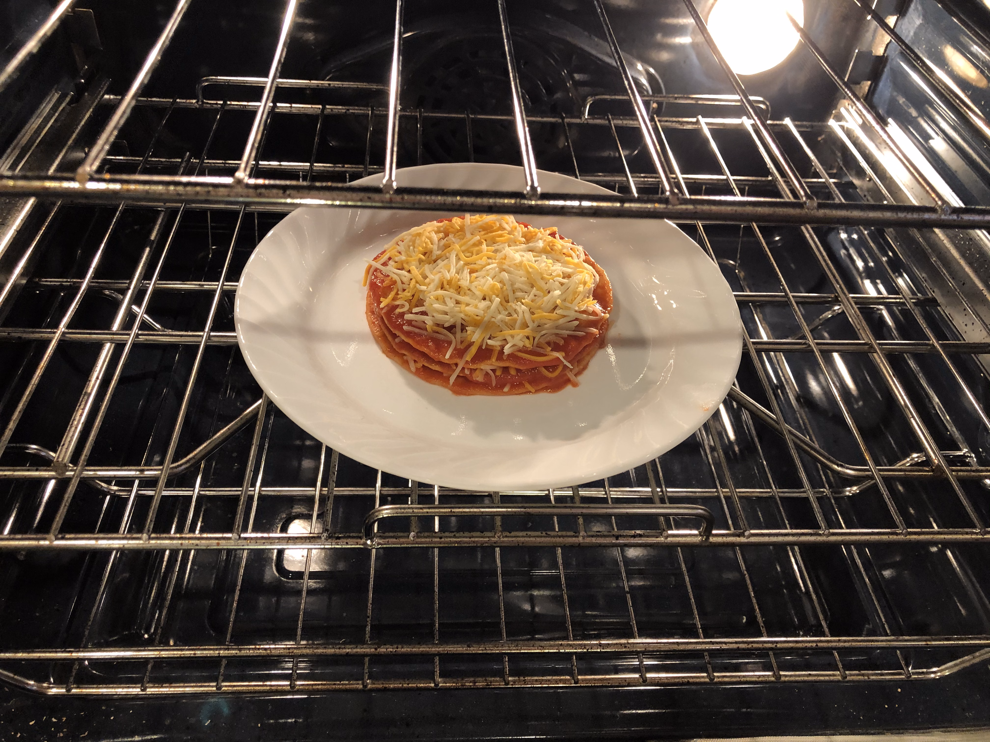 As you stack the sauced tortillas, sprinkle cheese between each layer and then top with cheese at the end.
