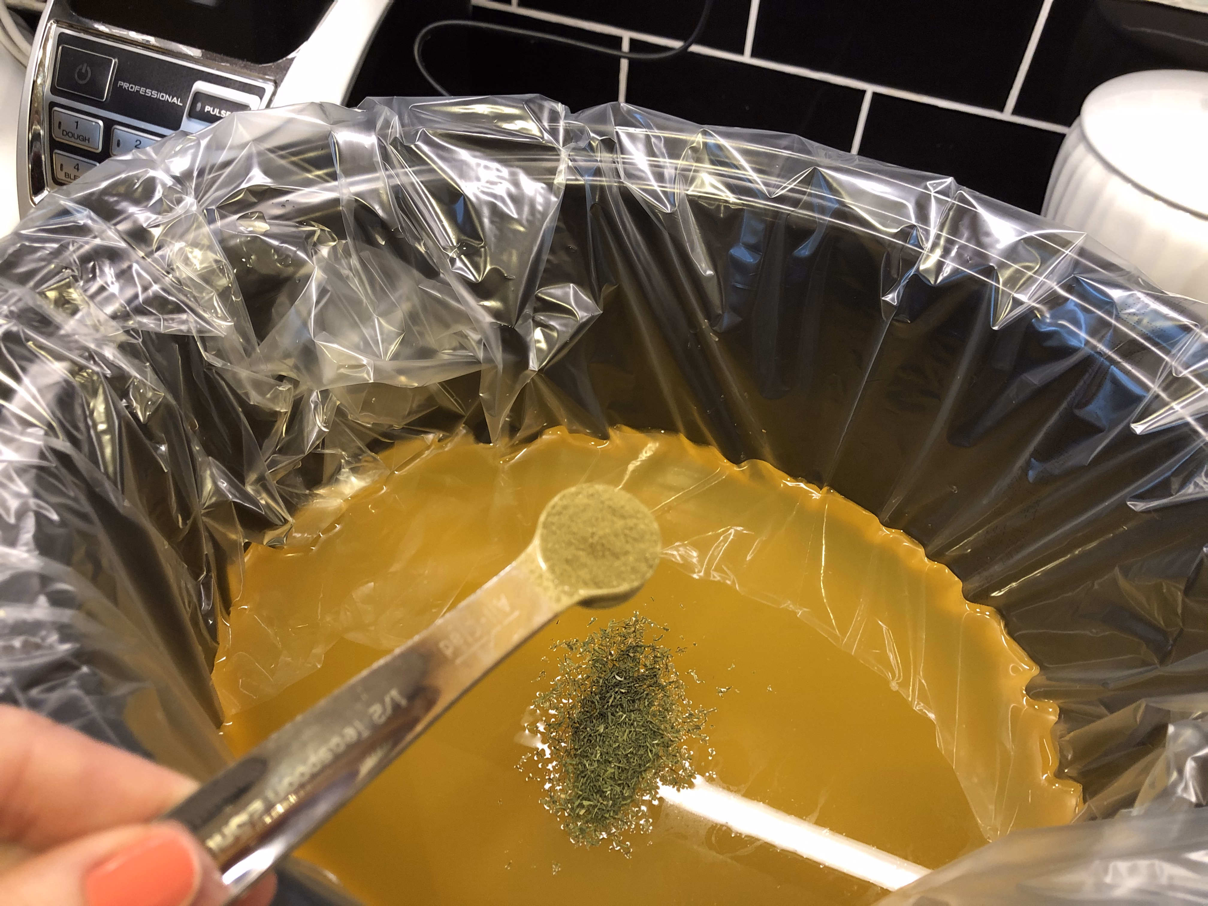 Pour the chicken broth and seasonings into the slow cooker. You need 4 cups chicken broth (32 oz. ). Add 1/2 teaspoon dill weed, 1/2 teaspoon thyme, and 1 teaspoon salt.