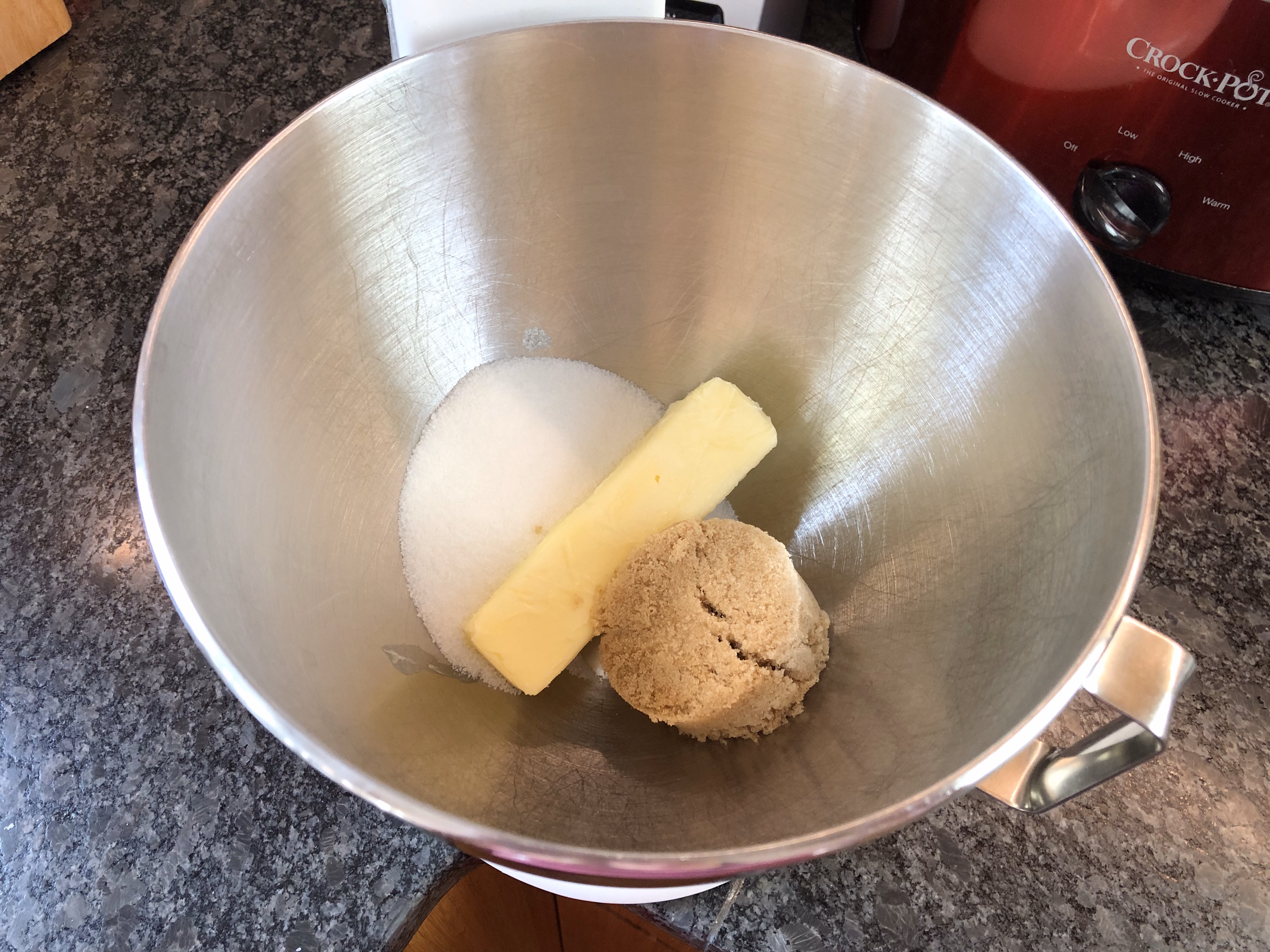 In a mixing bowl, cream together the softened butter and 1/2 cup brown and white sugars.
