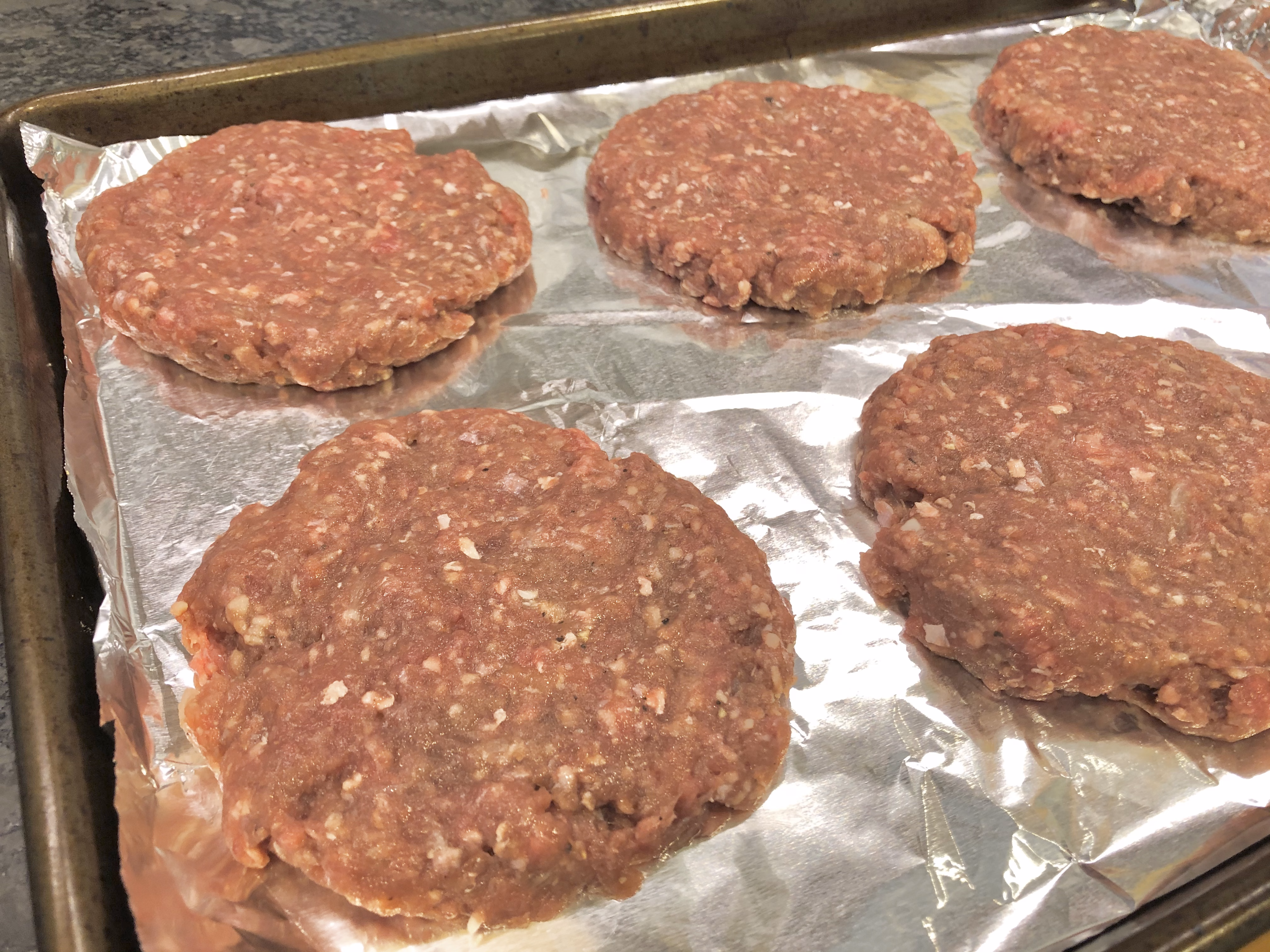 Mix thoroughly, then divide into 5 equal portions. Shape into patties. Place the patties on a cookie sheet covered with foil.