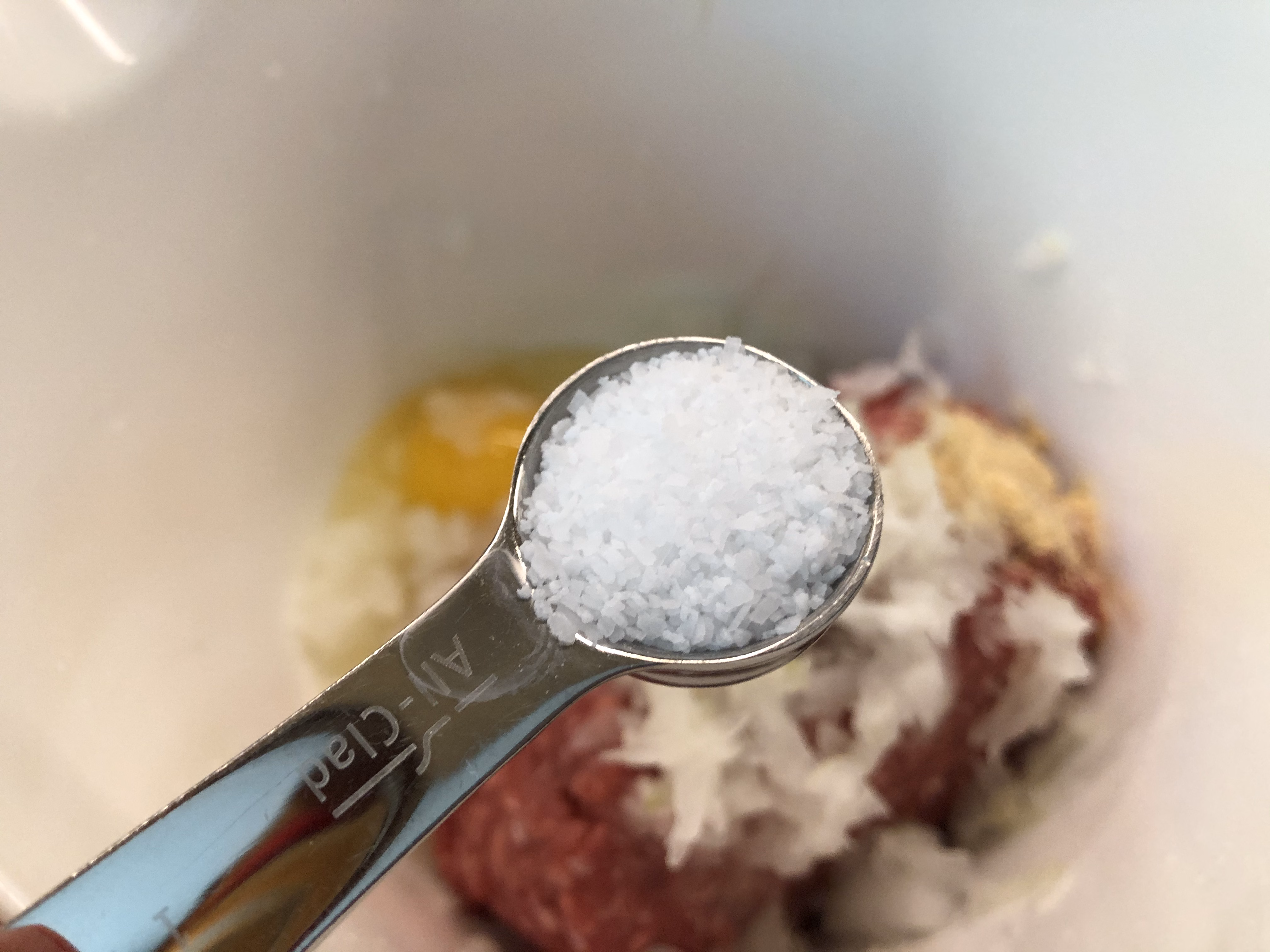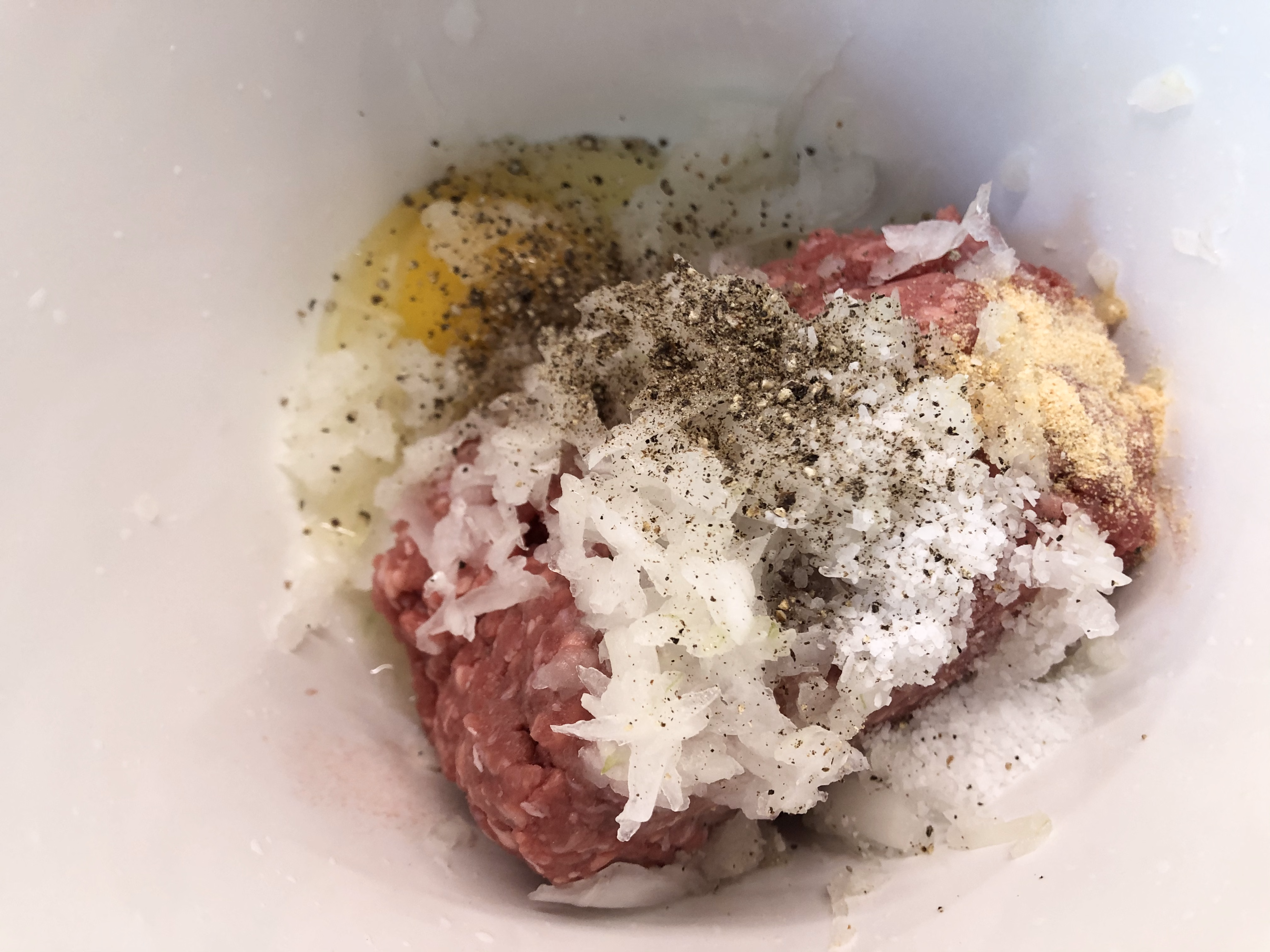In a large mixing bowl, add the ground beef and egg. Using a cheese grater, grate 1/2 of an onion into the bowl.