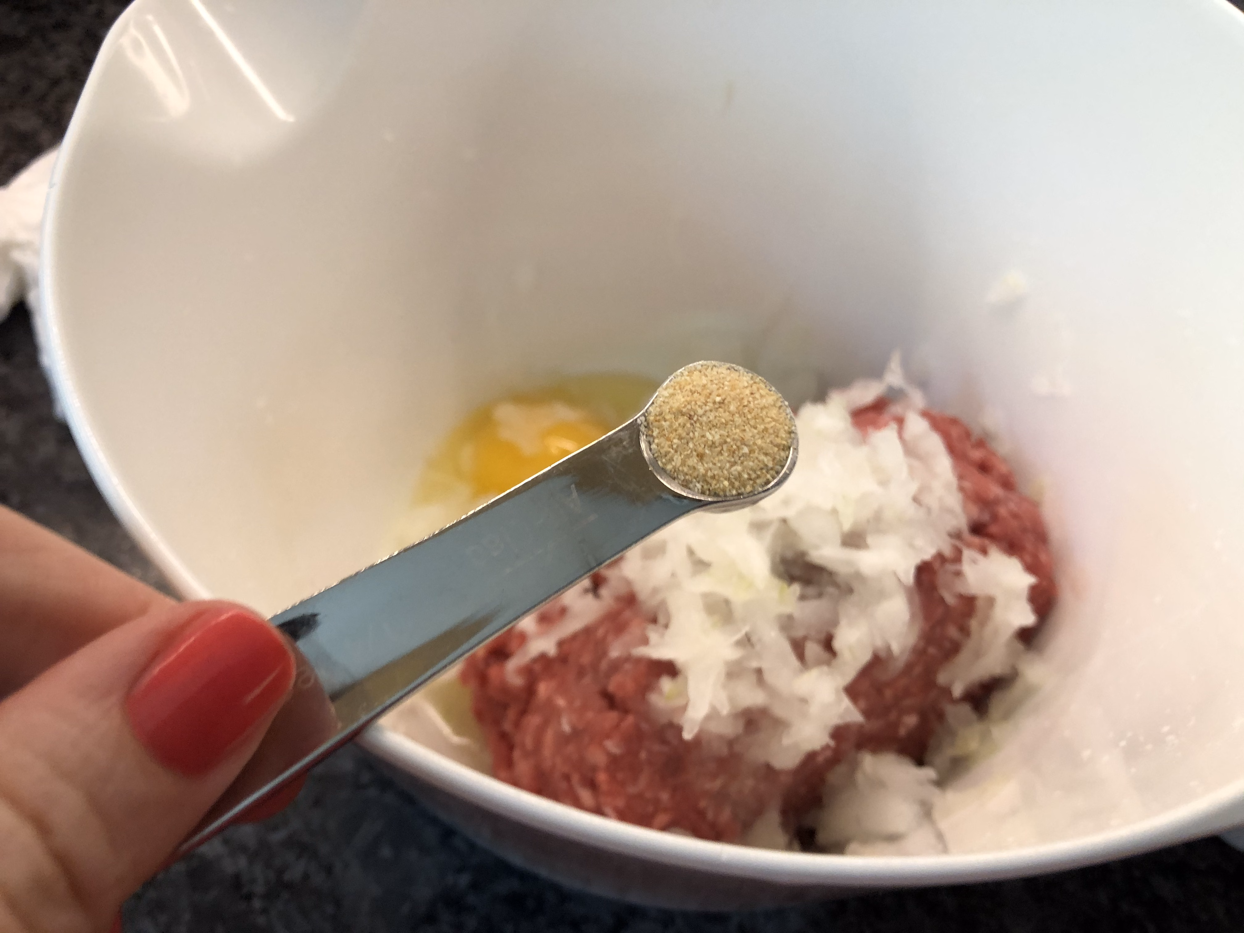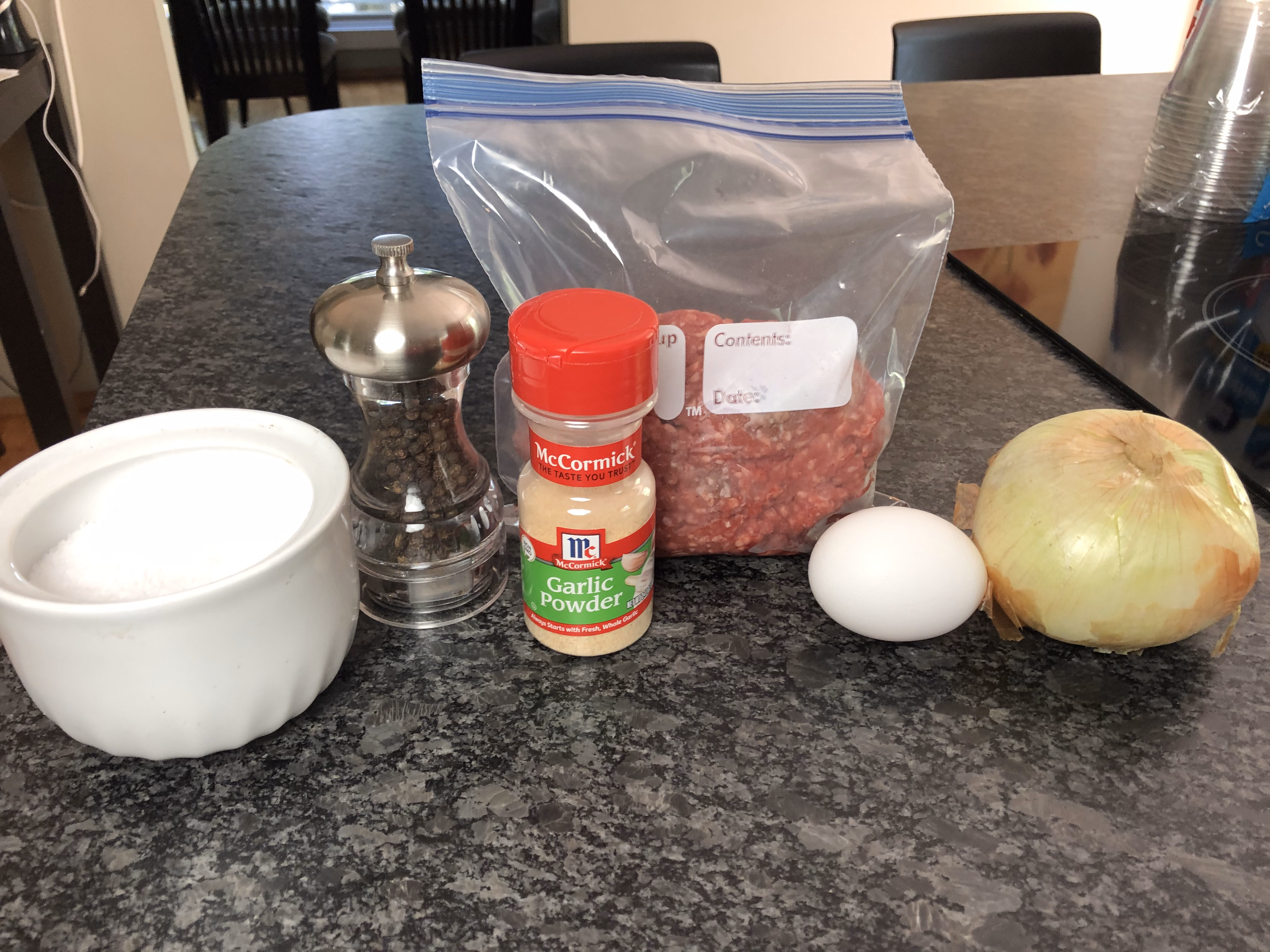Gather your ingredients. You will need a pound of ground beef, a yellow or sweet onion, an egg, garlic powder, salt, and black pepper.