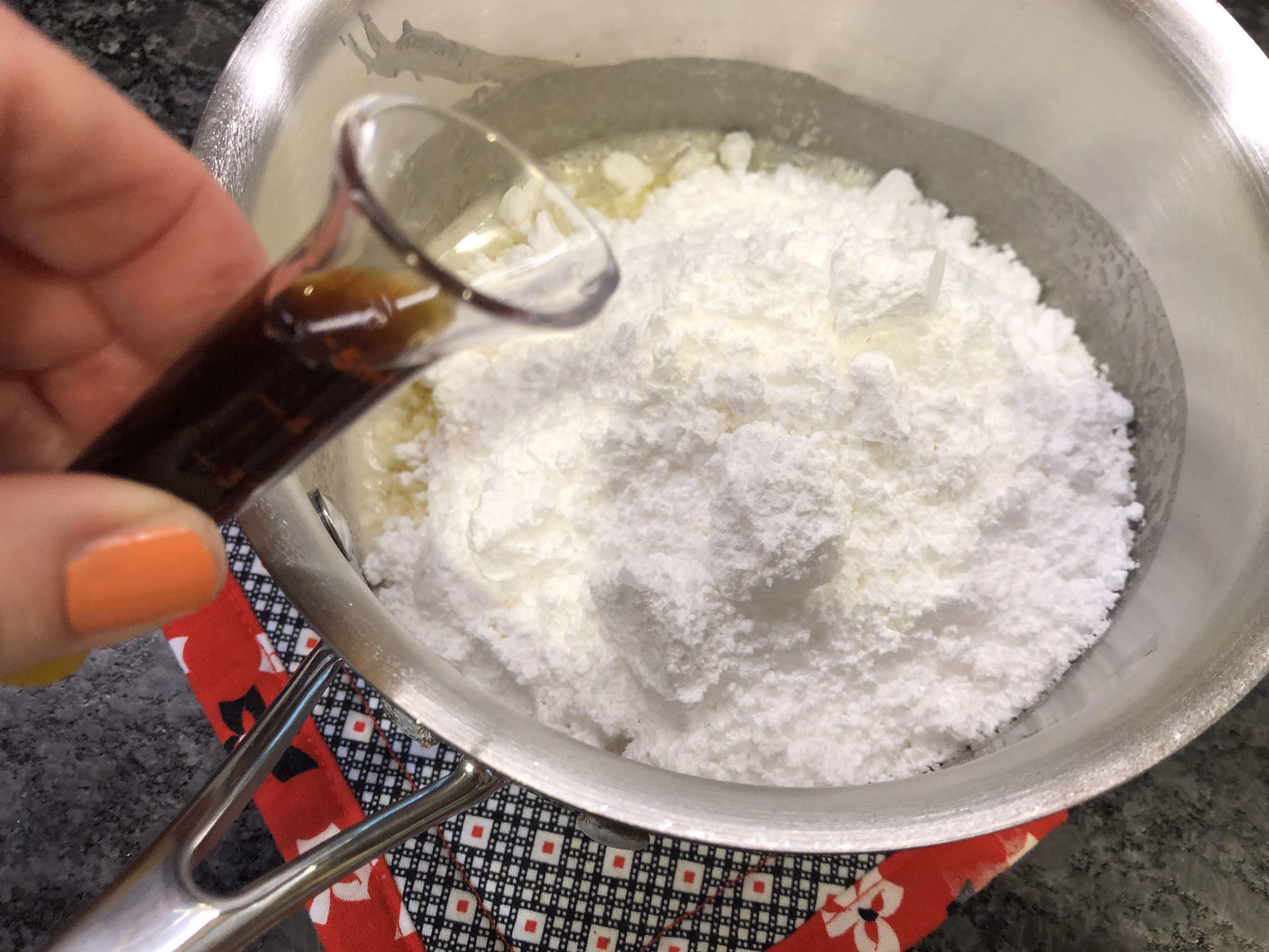 Add 2 cups powdered sugar, 1 teaspoon vanilla, and 1 tablespoon milk to the butter. Whisk until smooth. Add more milk to get to desired consistency.