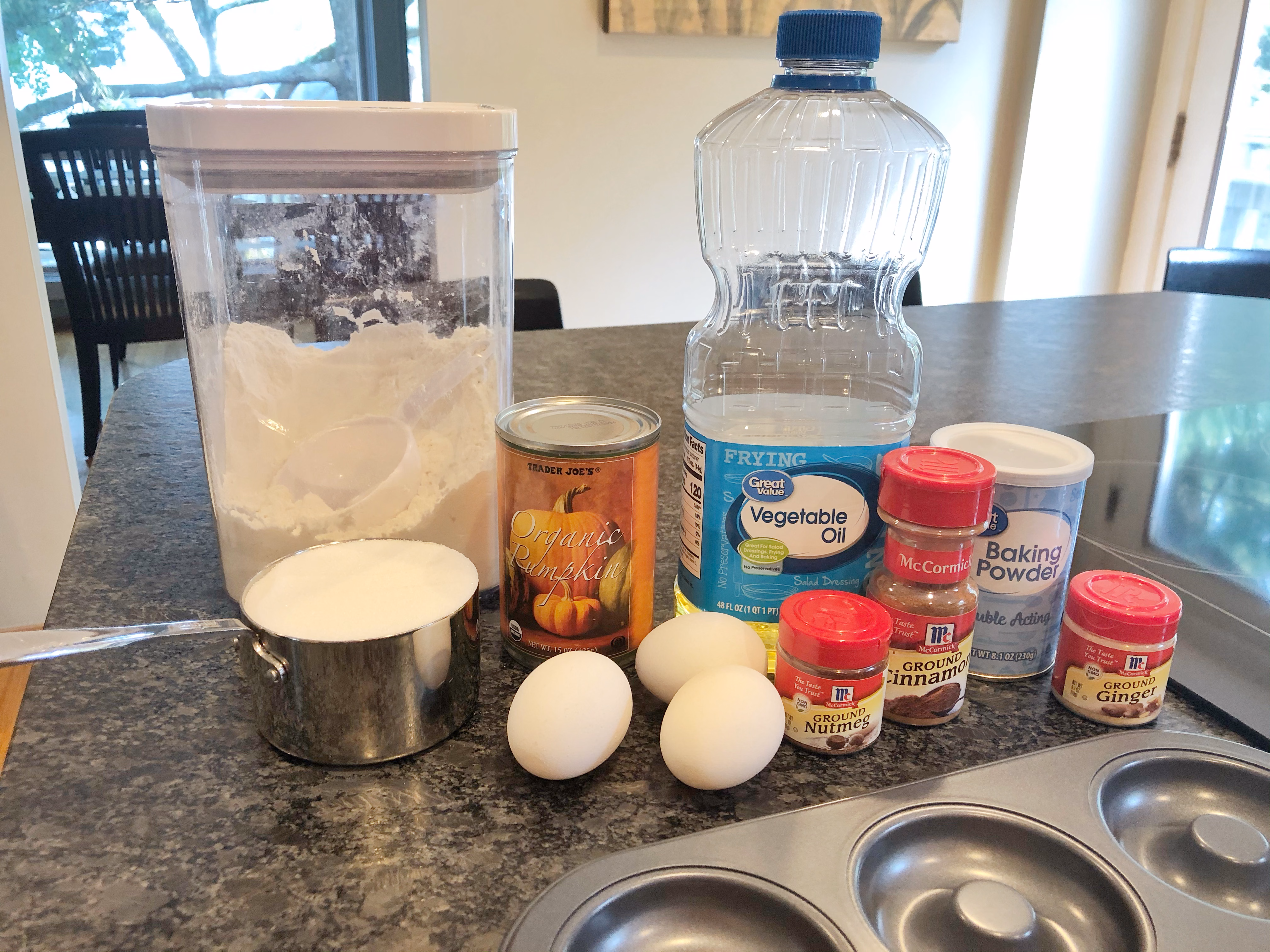 Gather your ingredients. You will need vegetable oil, sugar, eggs, canned pumpkin, cinnamon, nutmeg, ground ginger, baking powder, salt, and gluten free flour. I have found the Bob's Red Mill 1: 1 flour works great in this recipe.
