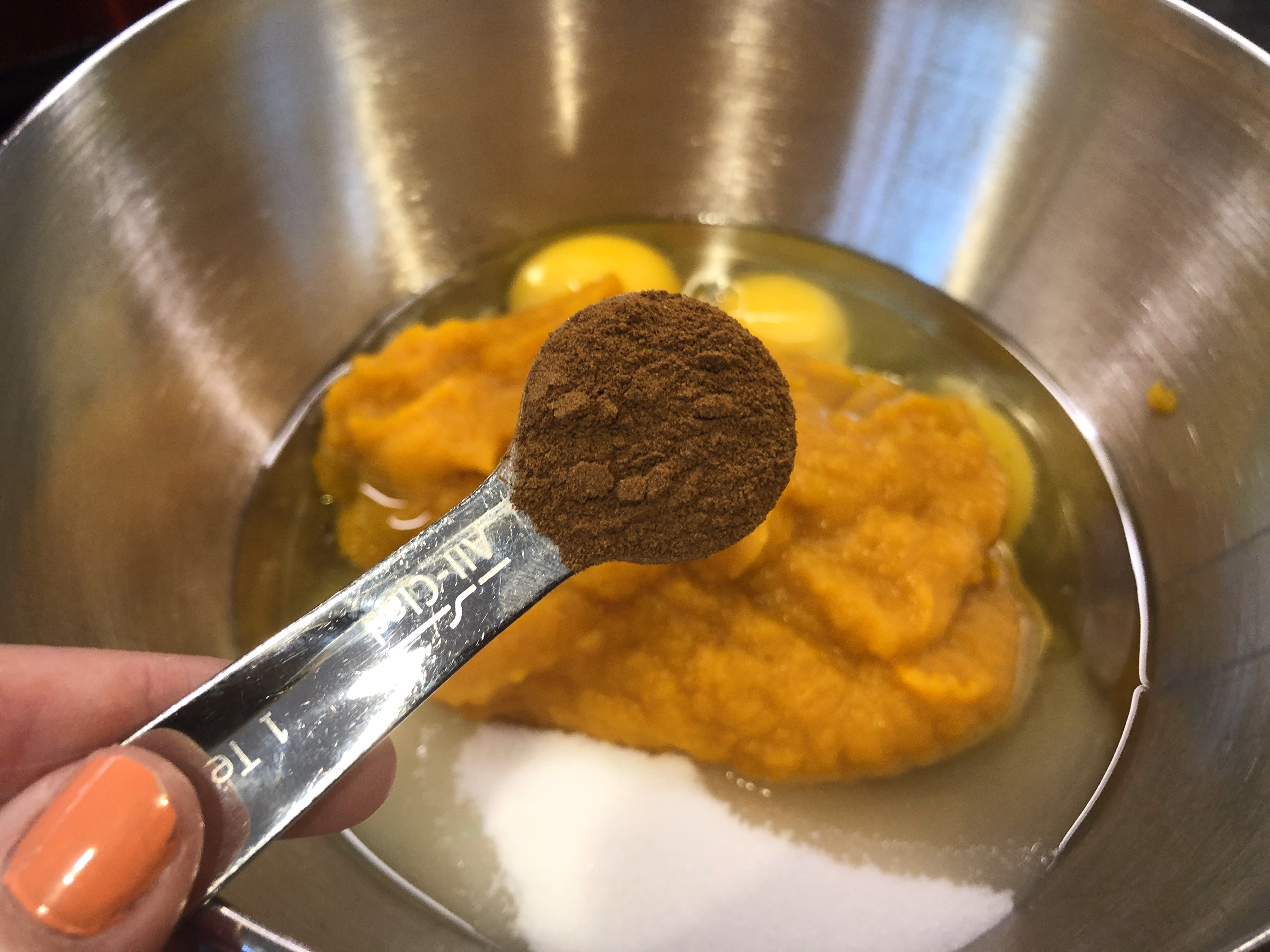 In a mixing bowl, add 3 large eggs, 1 1/2 cups sugar, 1 15-oz. can pumpkin puree, 1 1/4 teaspoons cinnamon.......