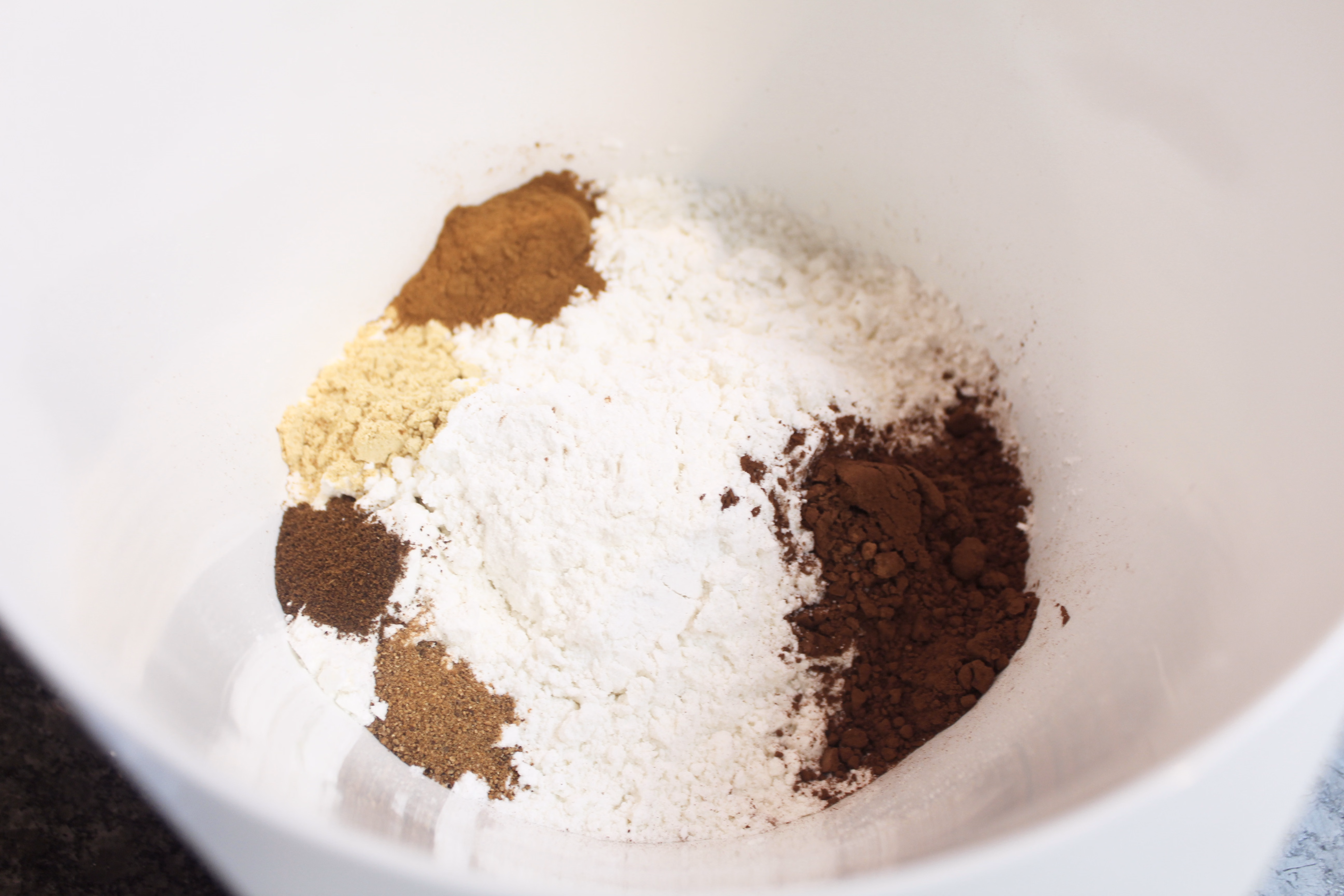 Gather your ingredients. You will need gluten free flour (I recommend one that is a 1: 1 substitution for regular all-purpose flour and includes xantham gum), cocoa powder, ground ginger, cinnamon, cloves, nutmeg, butter, fresh ginger, brown sugar, molasses, baking soda, semi-sweet chocolate chips, and coarse sugar.