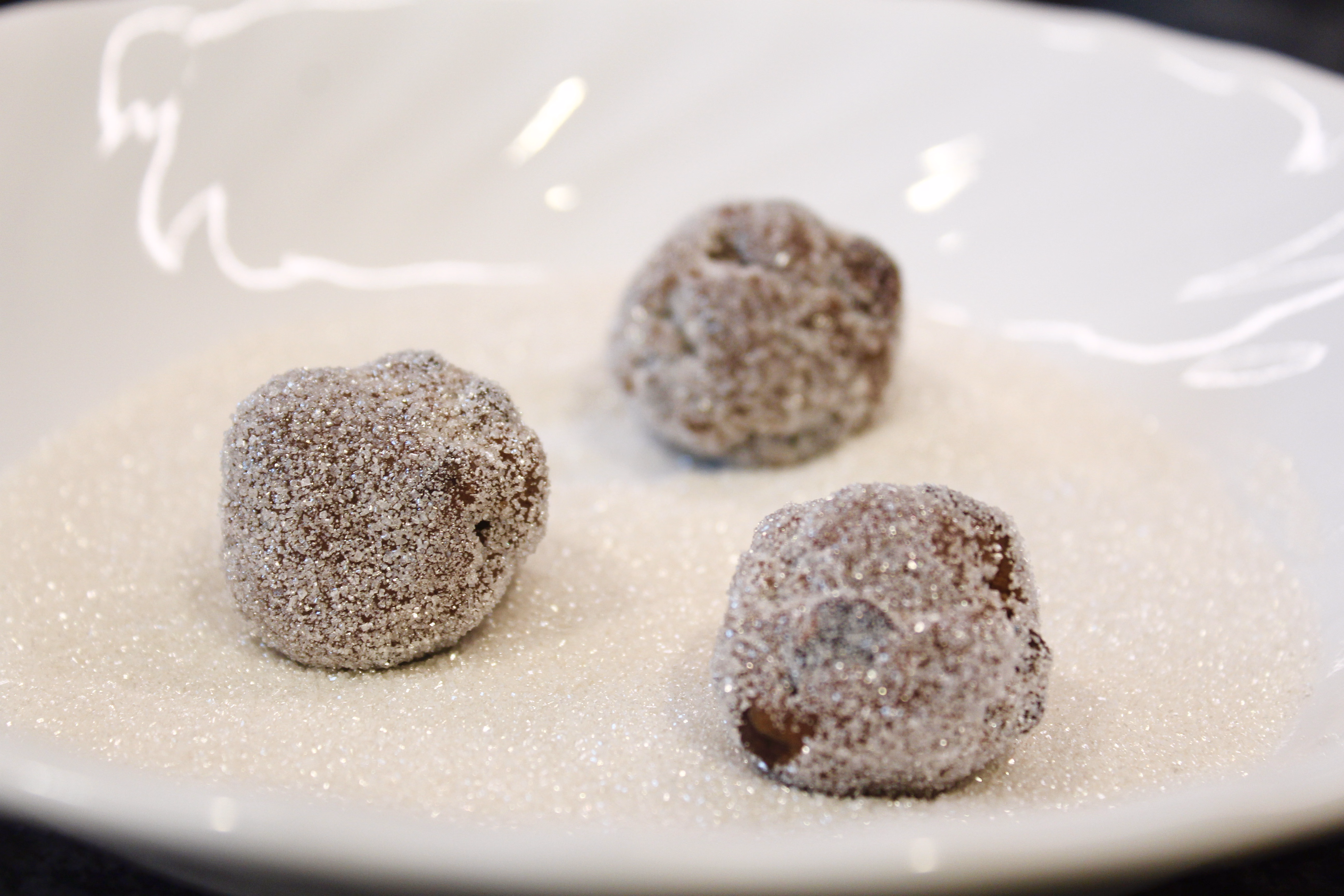Place the sugared dough balls on a baking sheet and bake in a 325°F oven.