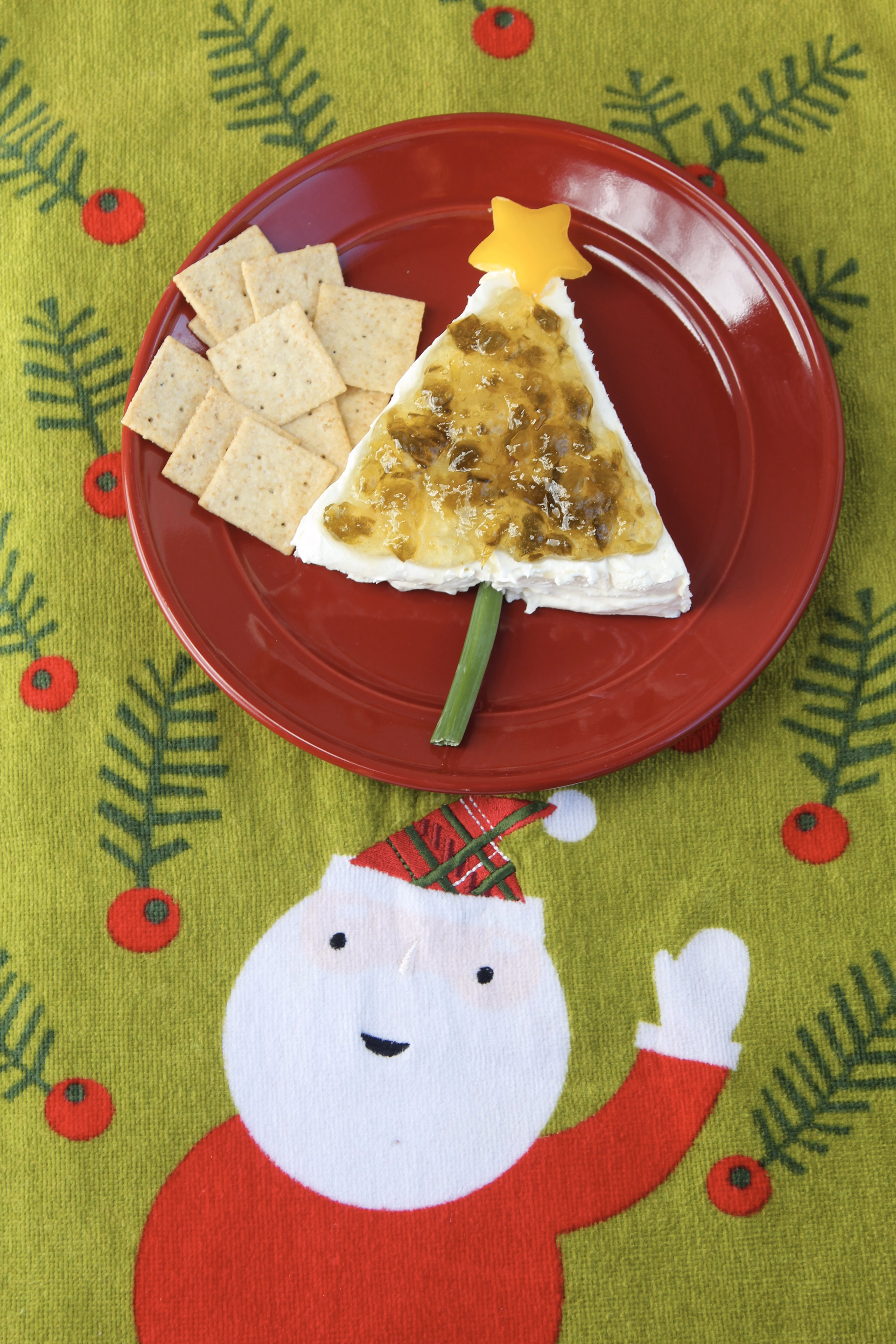 To prepare, place the cream cheese into the freezer for 15 minutes. Open and cut in a diagonal lengthwise. Flip over one of the triangles and put the two together to form a tree shape on a serving plate. Add a piece of a green onion for the trunk. Cut a star from a yellow pepper and place at the top. Heat about 1/2 cup jalapeño jelly for 20 seconds in the microwave to get it pourable (instead of jelly-like). Pour or spoon over the cream cheese. Serve with crackers and/or assorted vegetables.