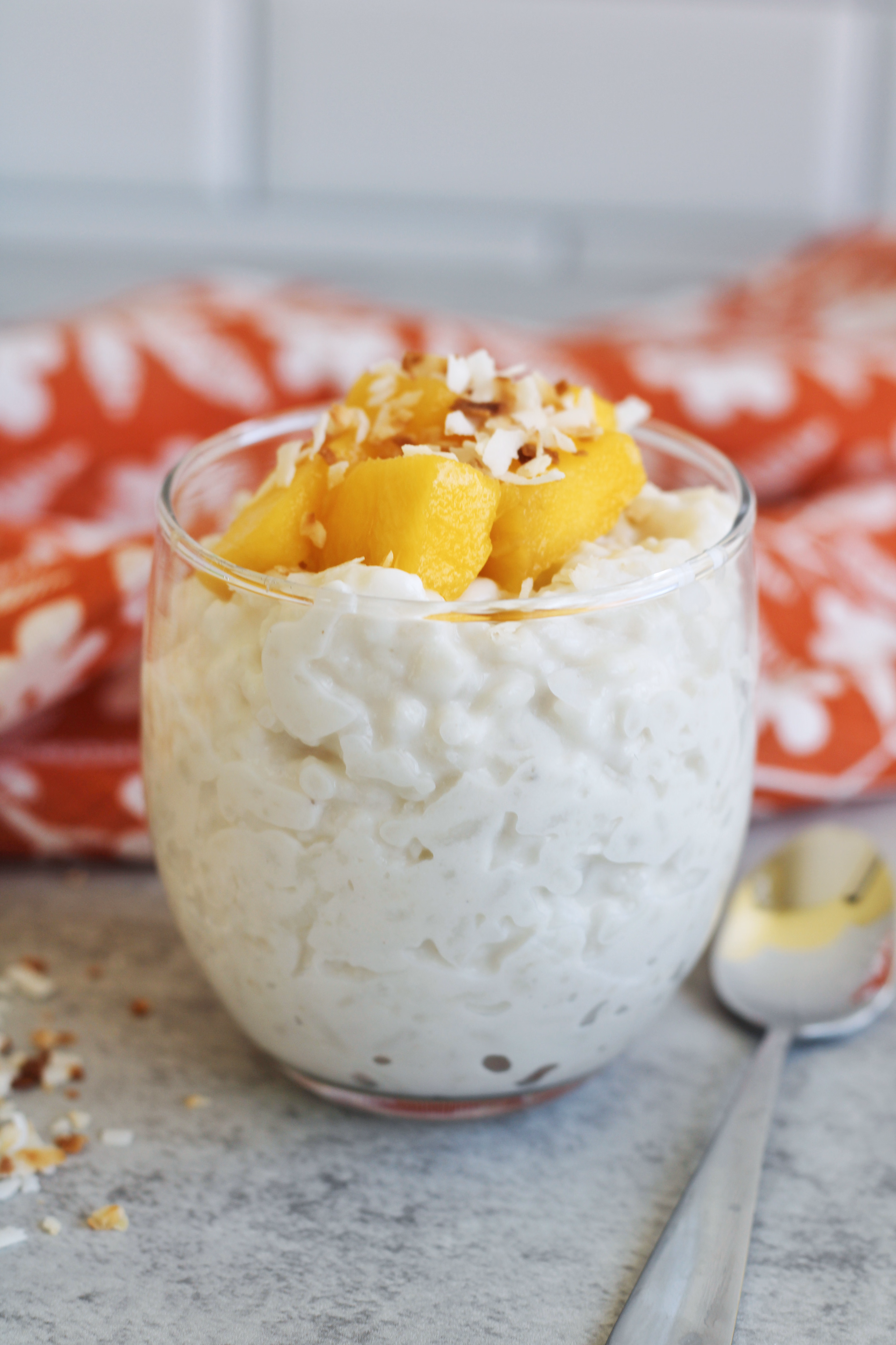 If you know me, you know I LOVE rice pudding. So, when I came across this recipe in a new cookbook I got for Christmas, I was elated! The other great love I have is mango and sticky rice, a dessert we always get at our favorite Thai restaurant. Combining the two is heaven! You will love this creamy rice pudding made with coconut milk then topped with fresh mangos and toasted coconut.