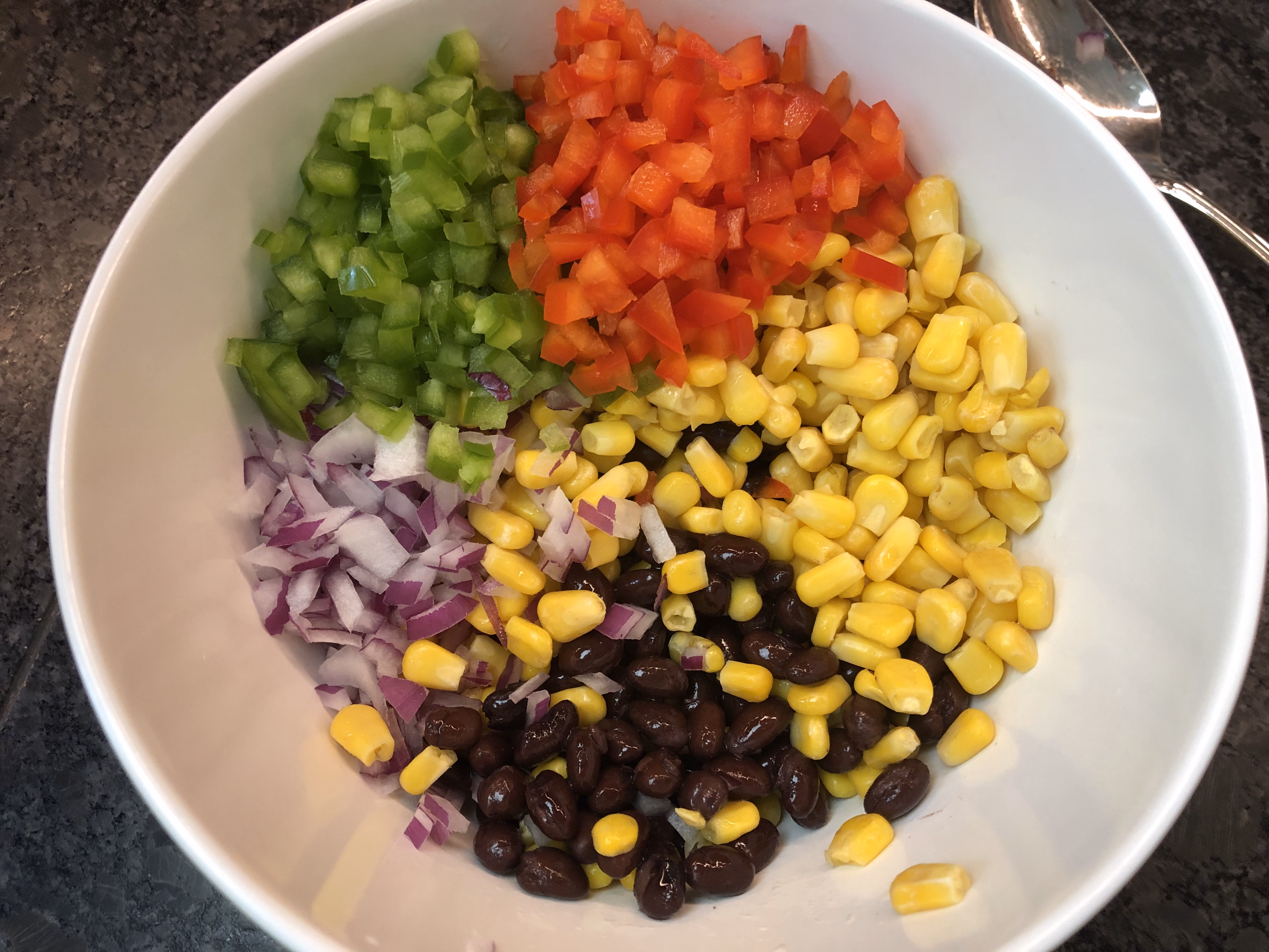 Prepare your vegetables by washing and chopping finely. Drain and rinse the black beans. Run warm water over the frozen corn to thaw. Add all to a big mixing bowl. So many pretty colors!