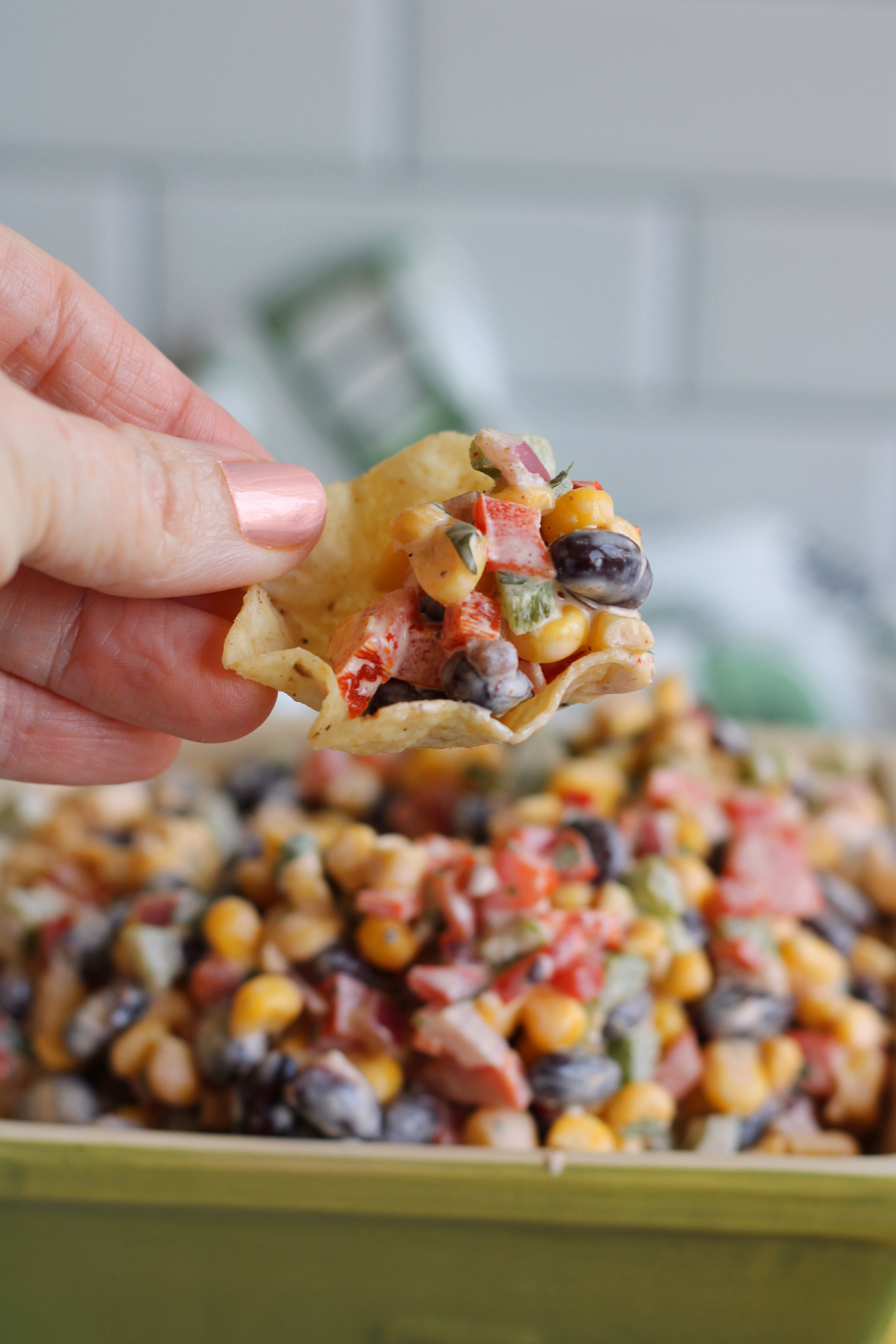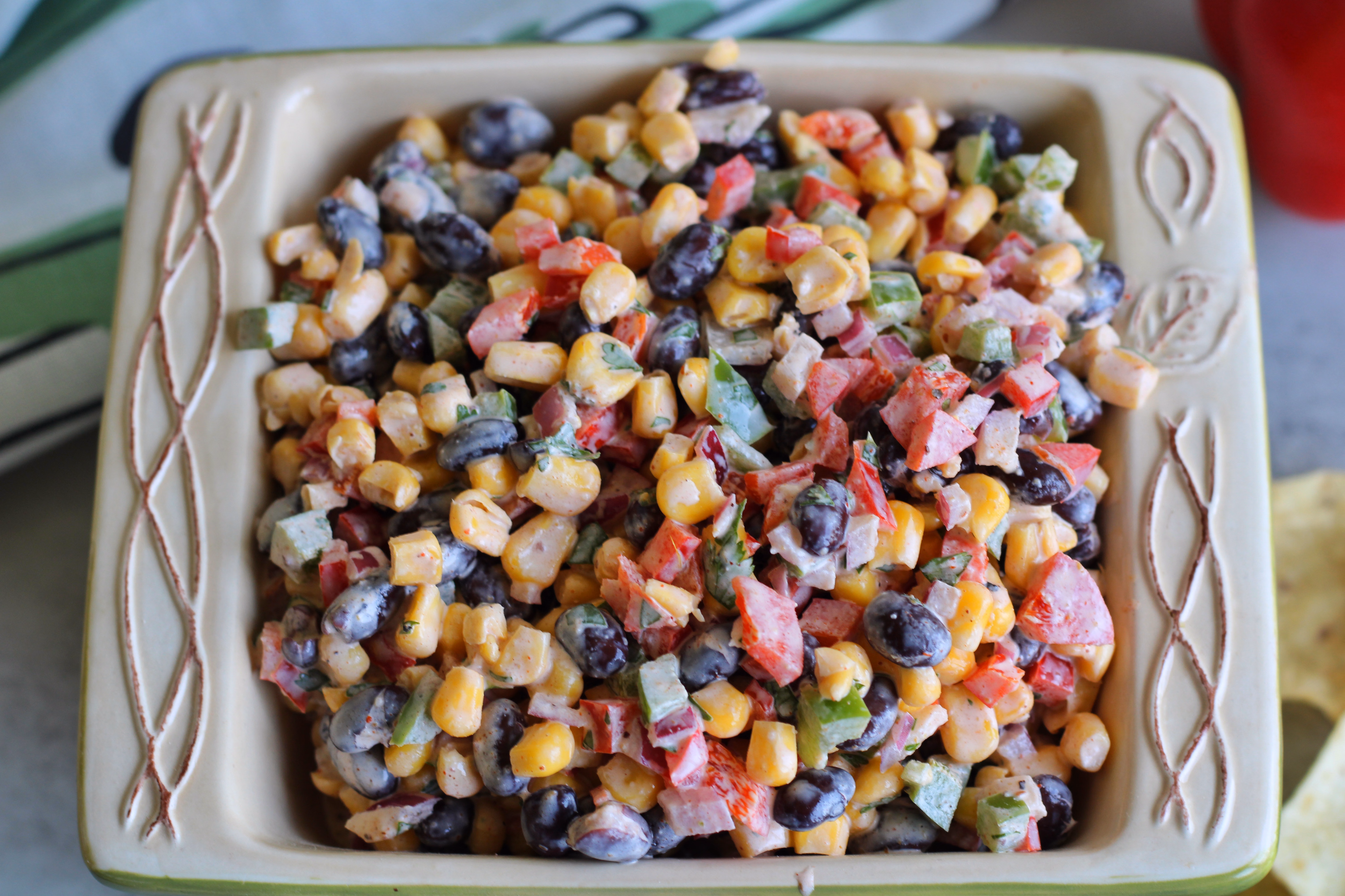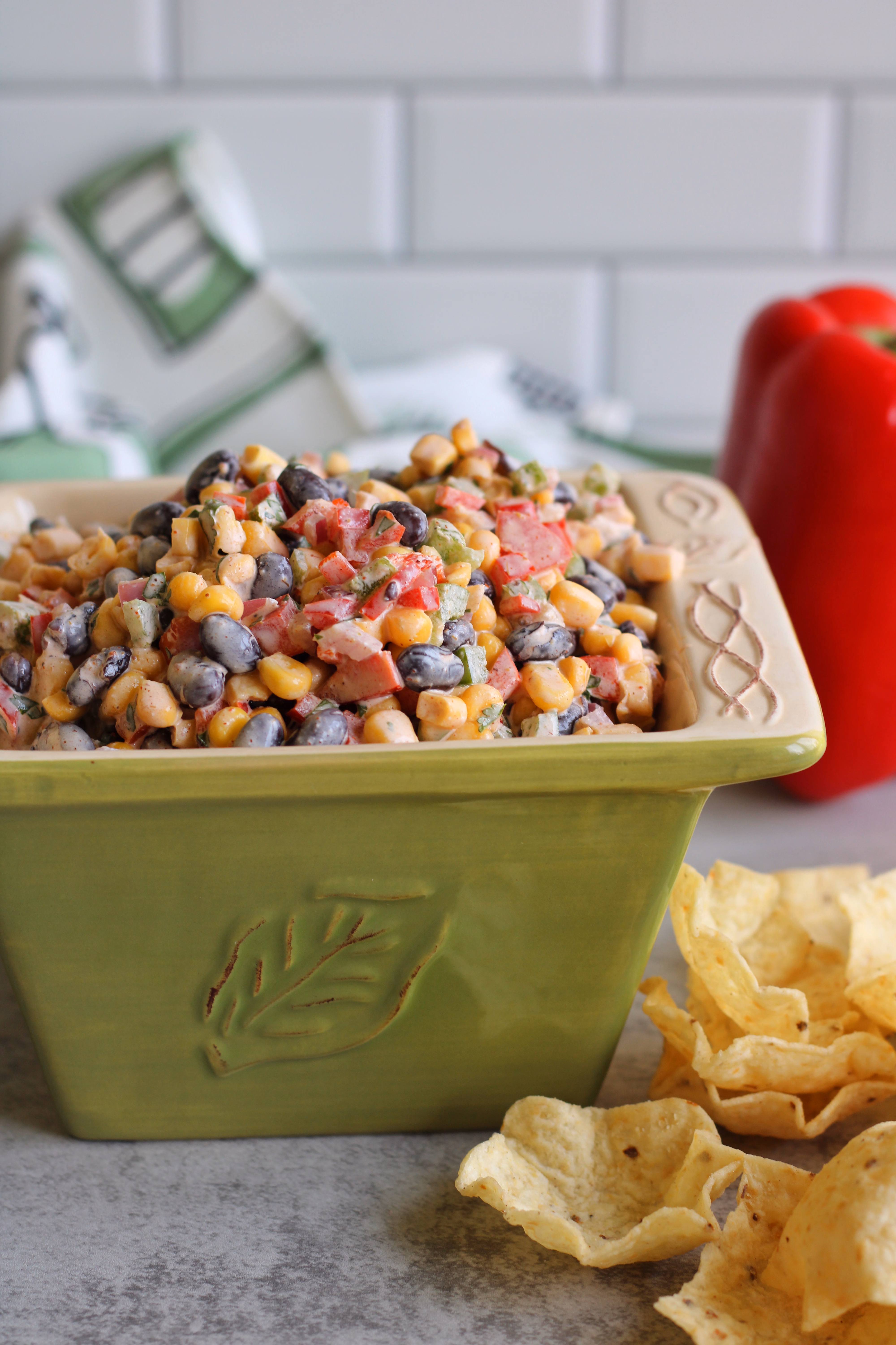 A good black bean salsa is not hard to come by, but I've never found one quite as unique and delicious as this one. Black beans, corn, peppers, onion, cilantro, and a creamy dressing make this side dish a favorite with our family! When you take it to a party, you will leave with an empty bowl and everyone begging for the recipe. Personally, I could eat this by the spoonful and call it a meal because it's so yummy, but our family preference is to serve it with Scoops corn chips. Any way you eat it, you will be glad you did!