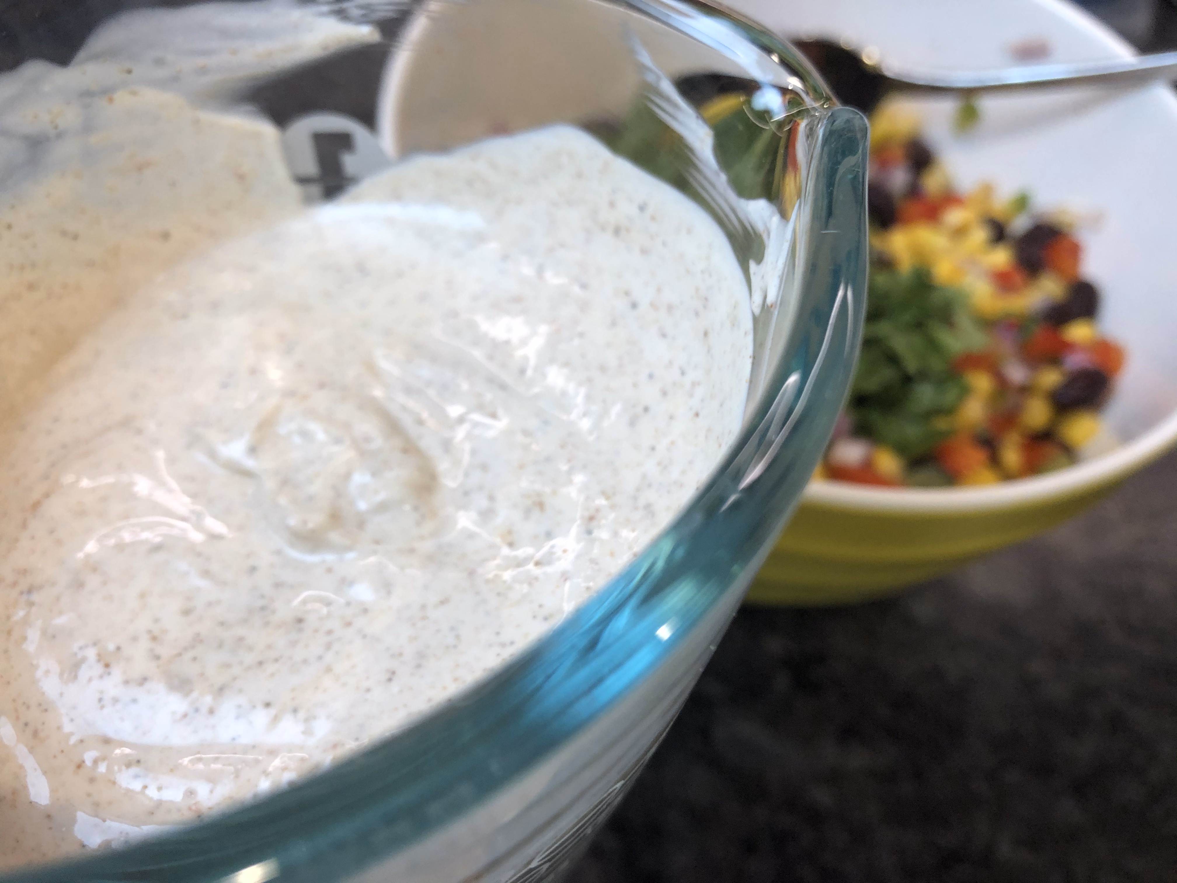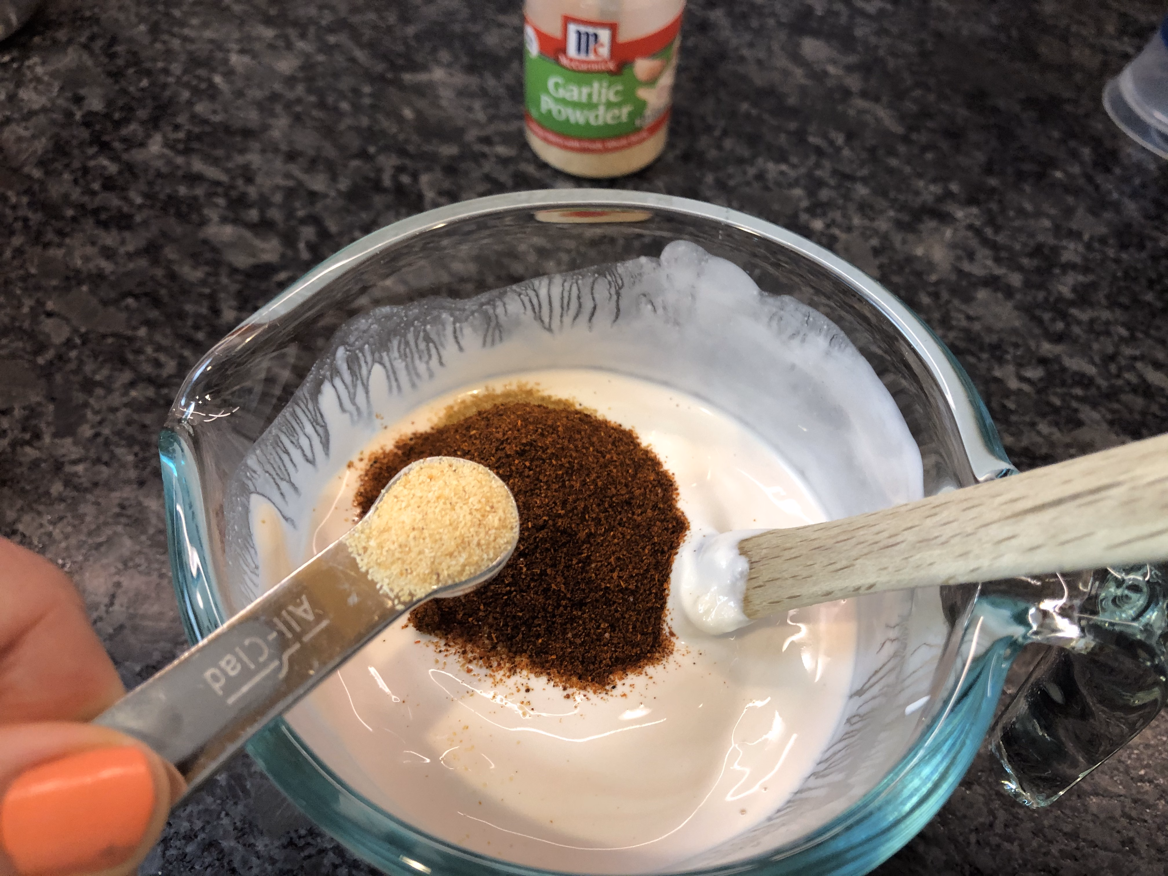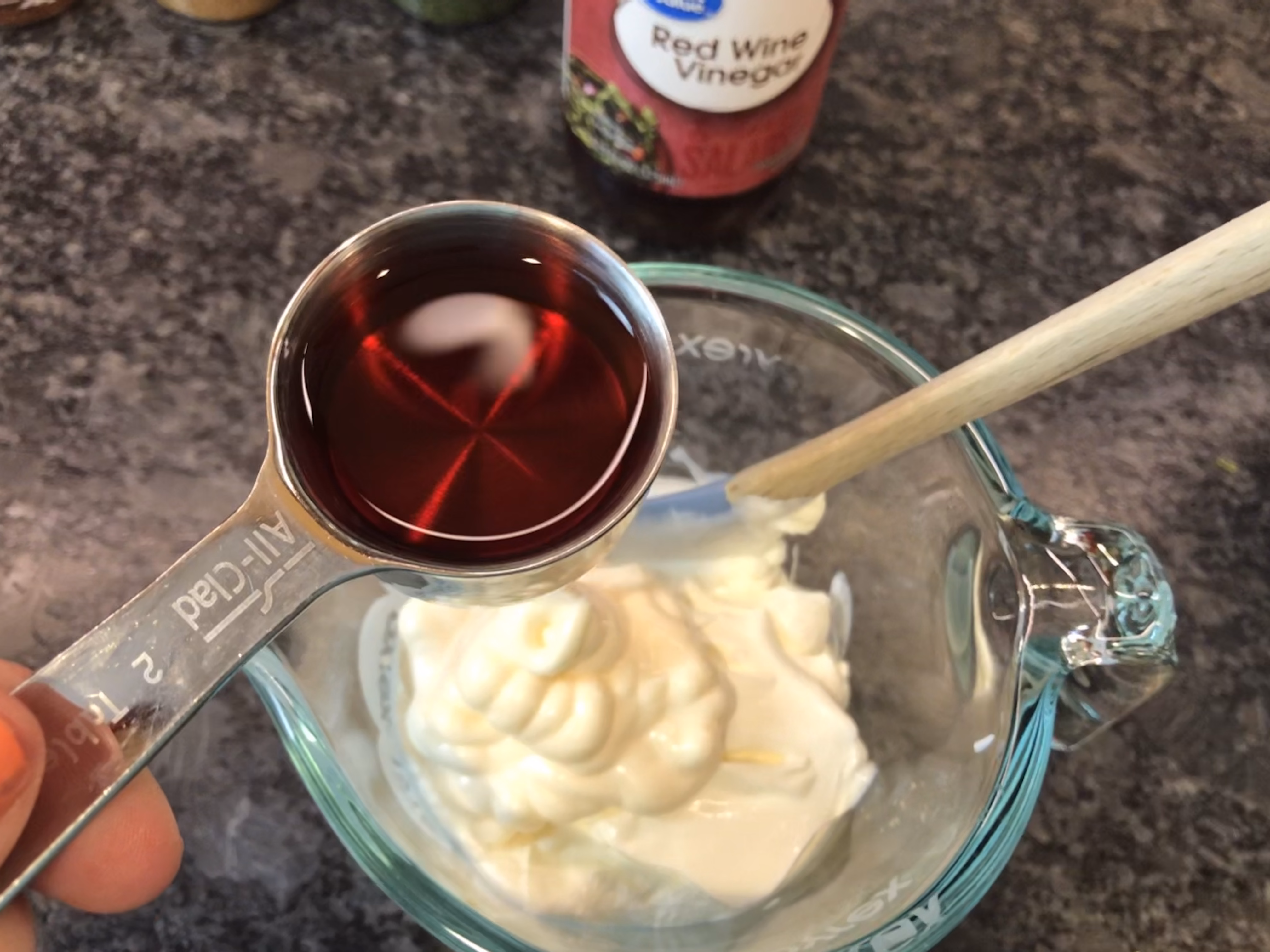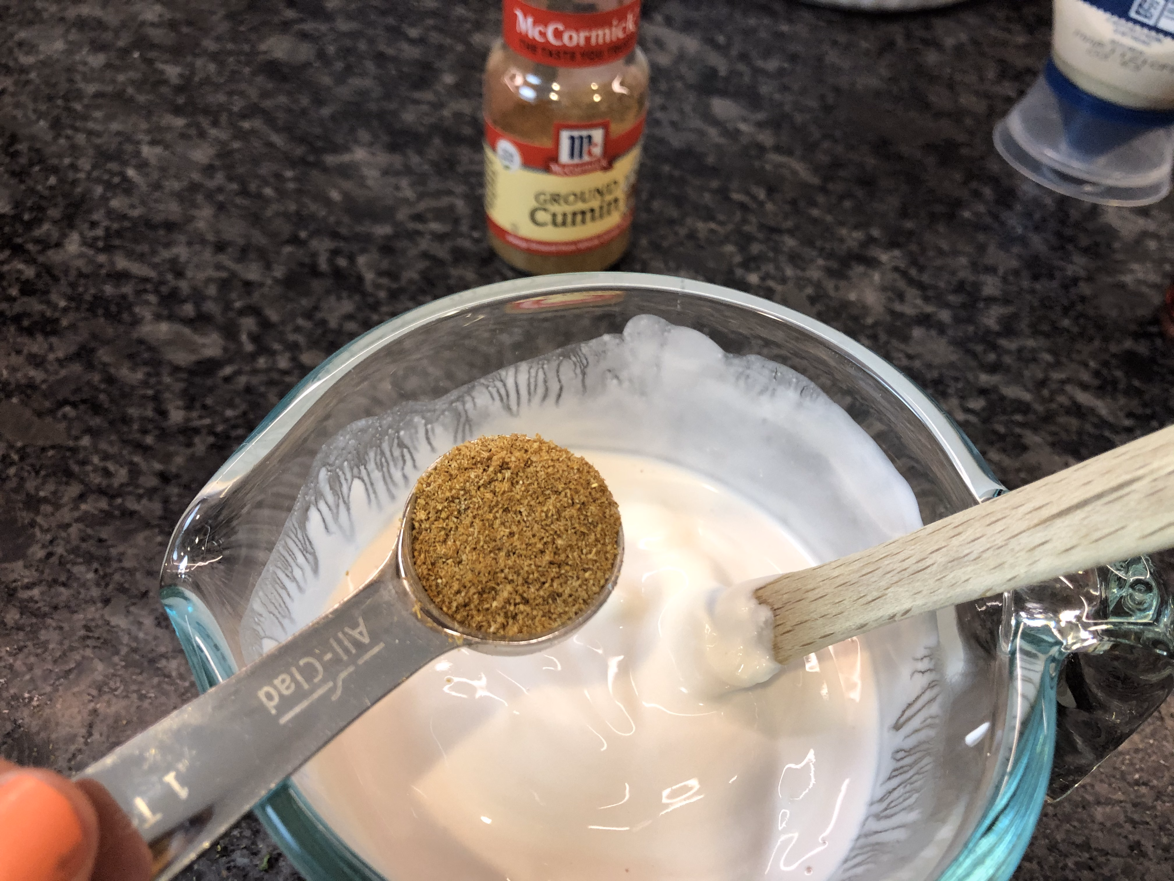 In a liquid measuring cup, combine 1/2 cup sour cream, 1/4 cup mayonnaise, 2 tablespoons red wine vinegar, 1 teaspoon cumin, and 1 teaspoon chili powder.