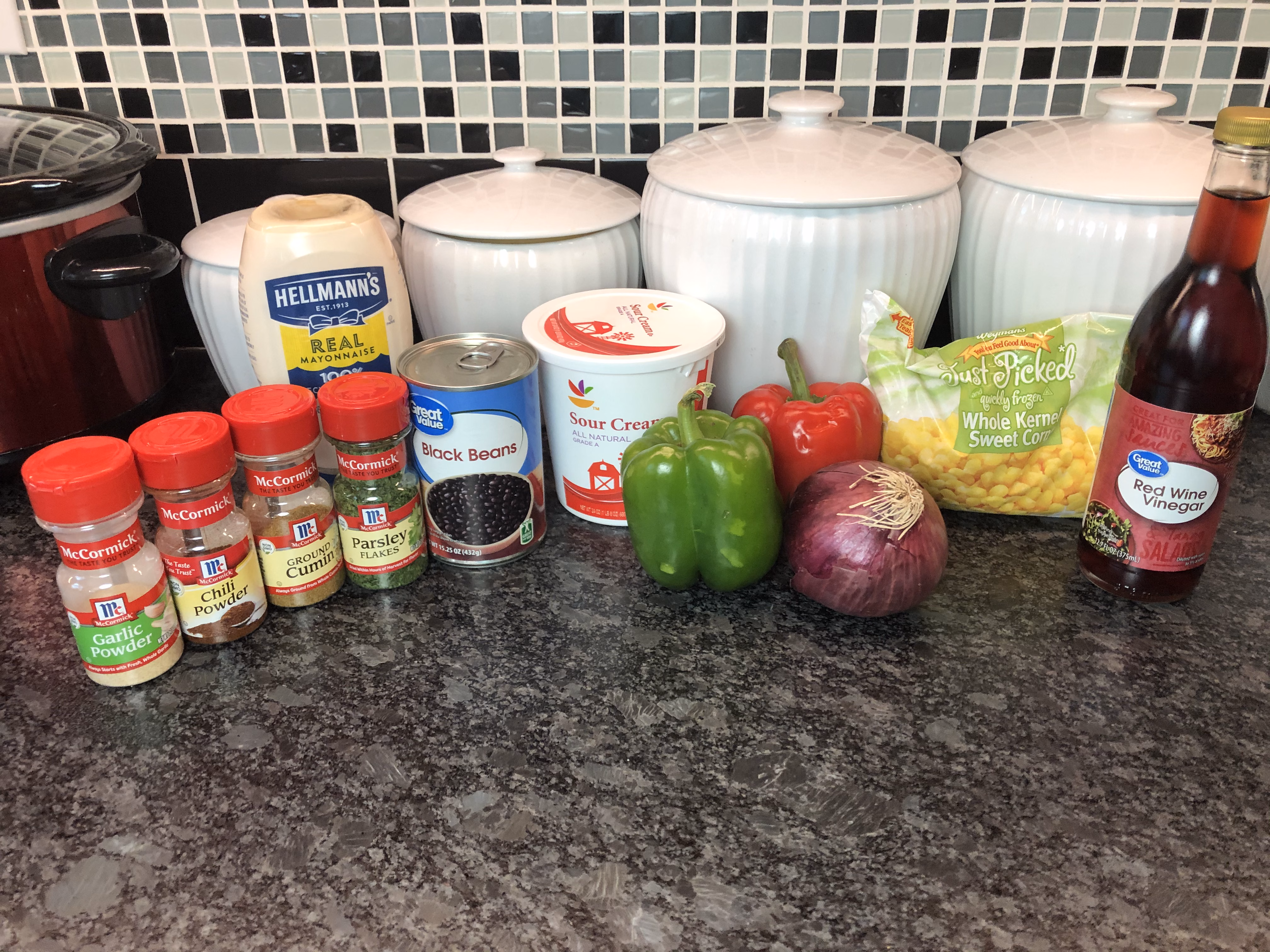 Gather your ingredients. You will need black beans, frozen corn, a red pepper, a green pepper, red onion, cilantro, sour cream, mayonnaise, red wine vinegar, cumin, chili powder, garlic powder, salt and pepper, and cilantro.