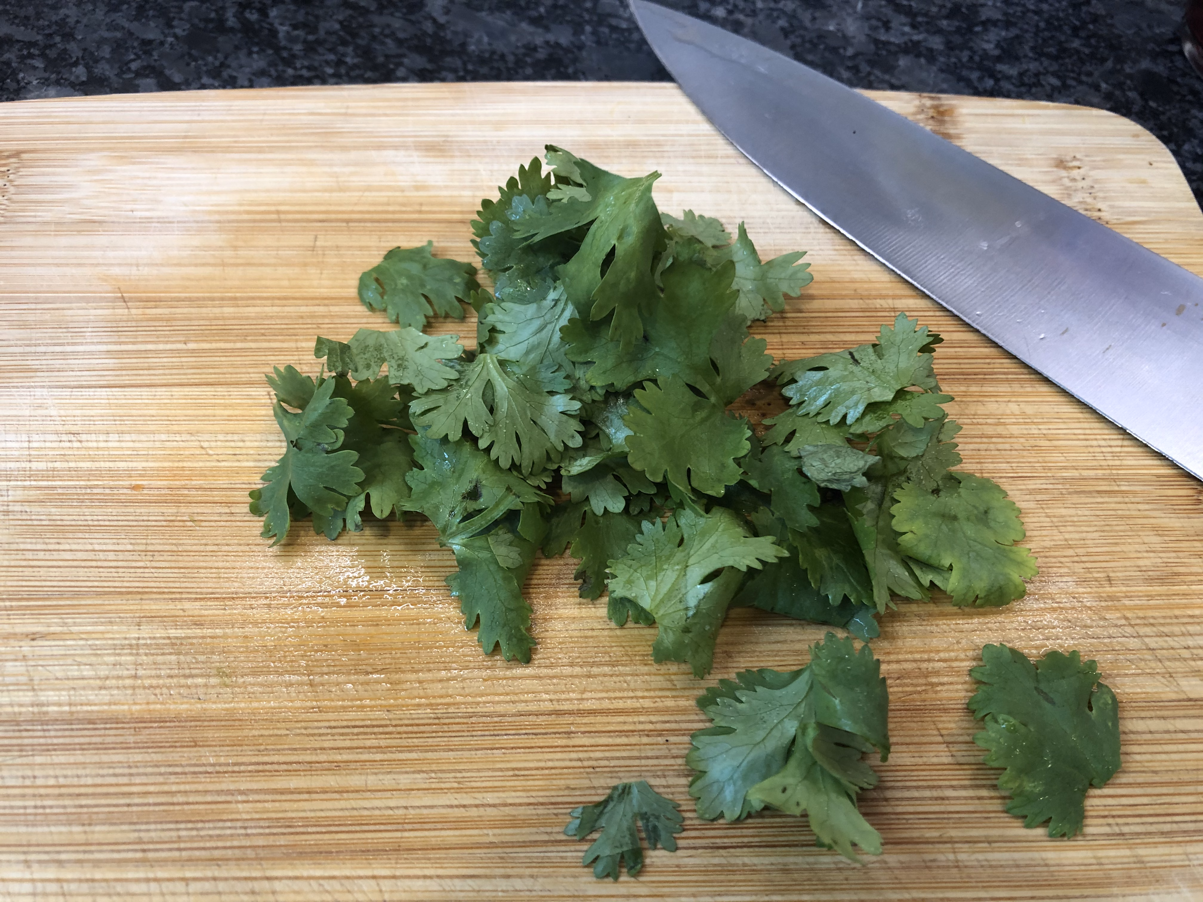 Stir to combine. Wash a handful of cilantro and roughly chop it. Add to the bowl.