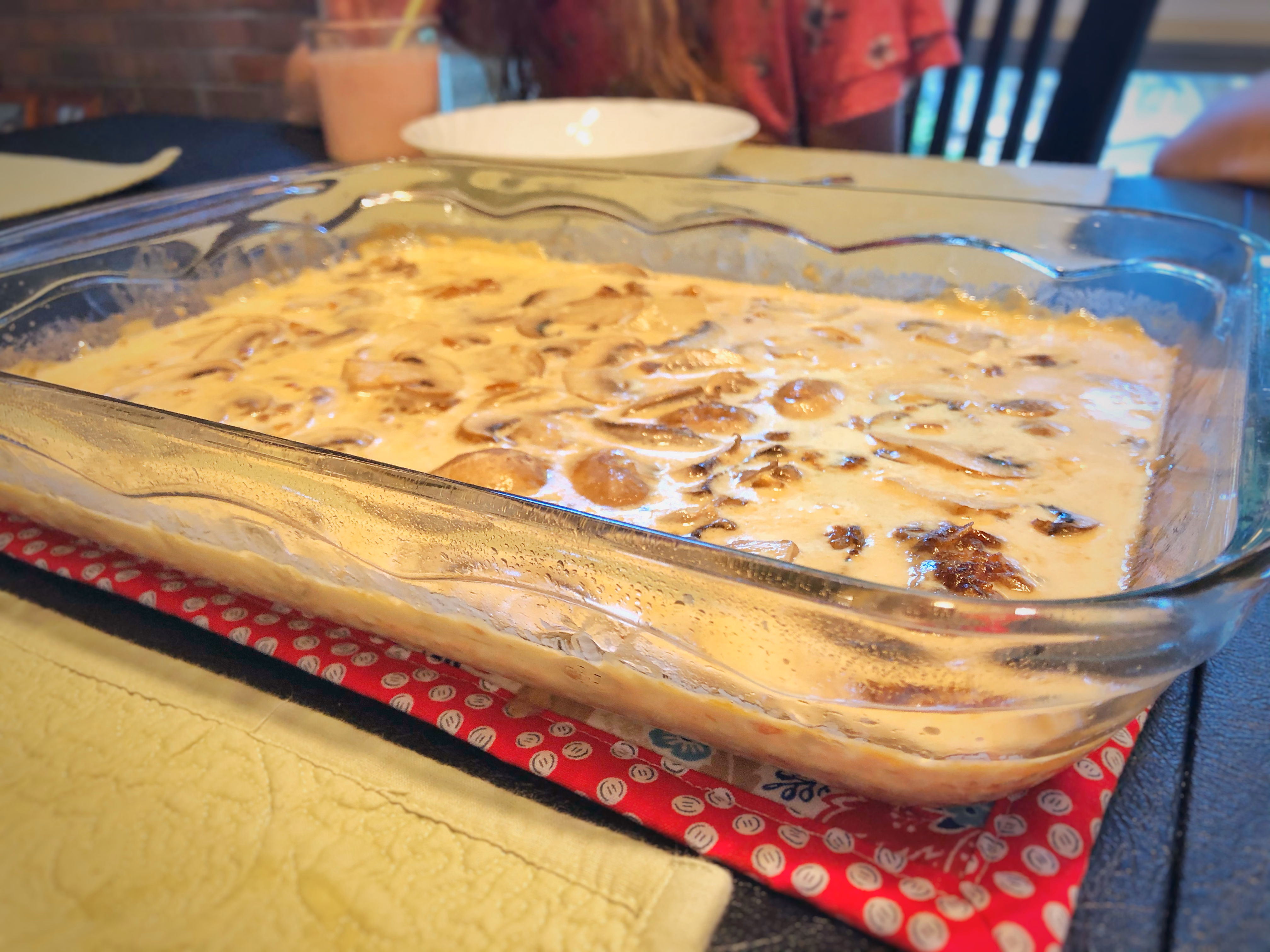 Remove and add 2 cups freshly sliced mushrooms. Stir the mushrooms into the cream. Recover with foil and bake 10 minutes.