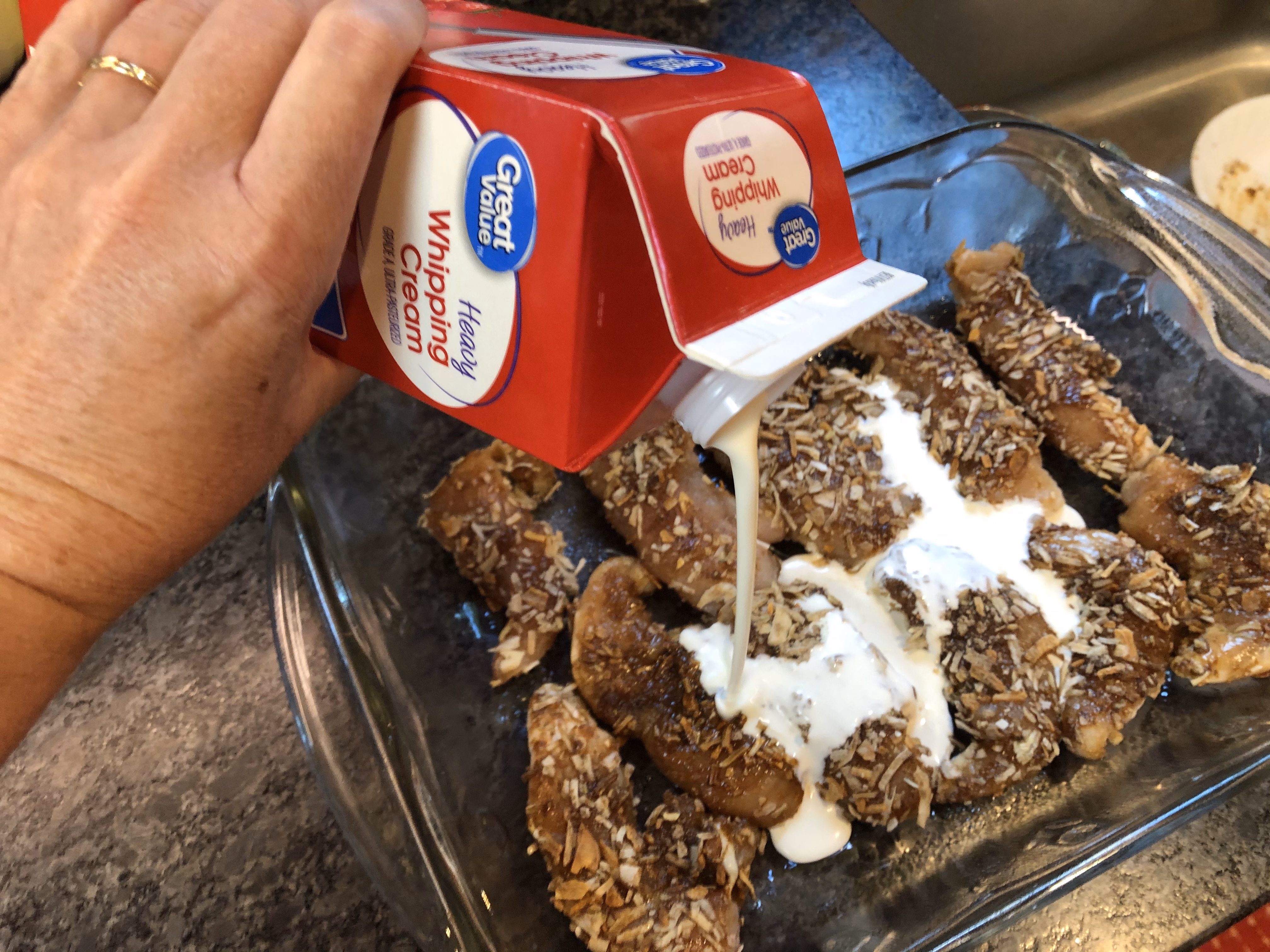 Pour 2 cups heavy whipping cream over and around the chicken.