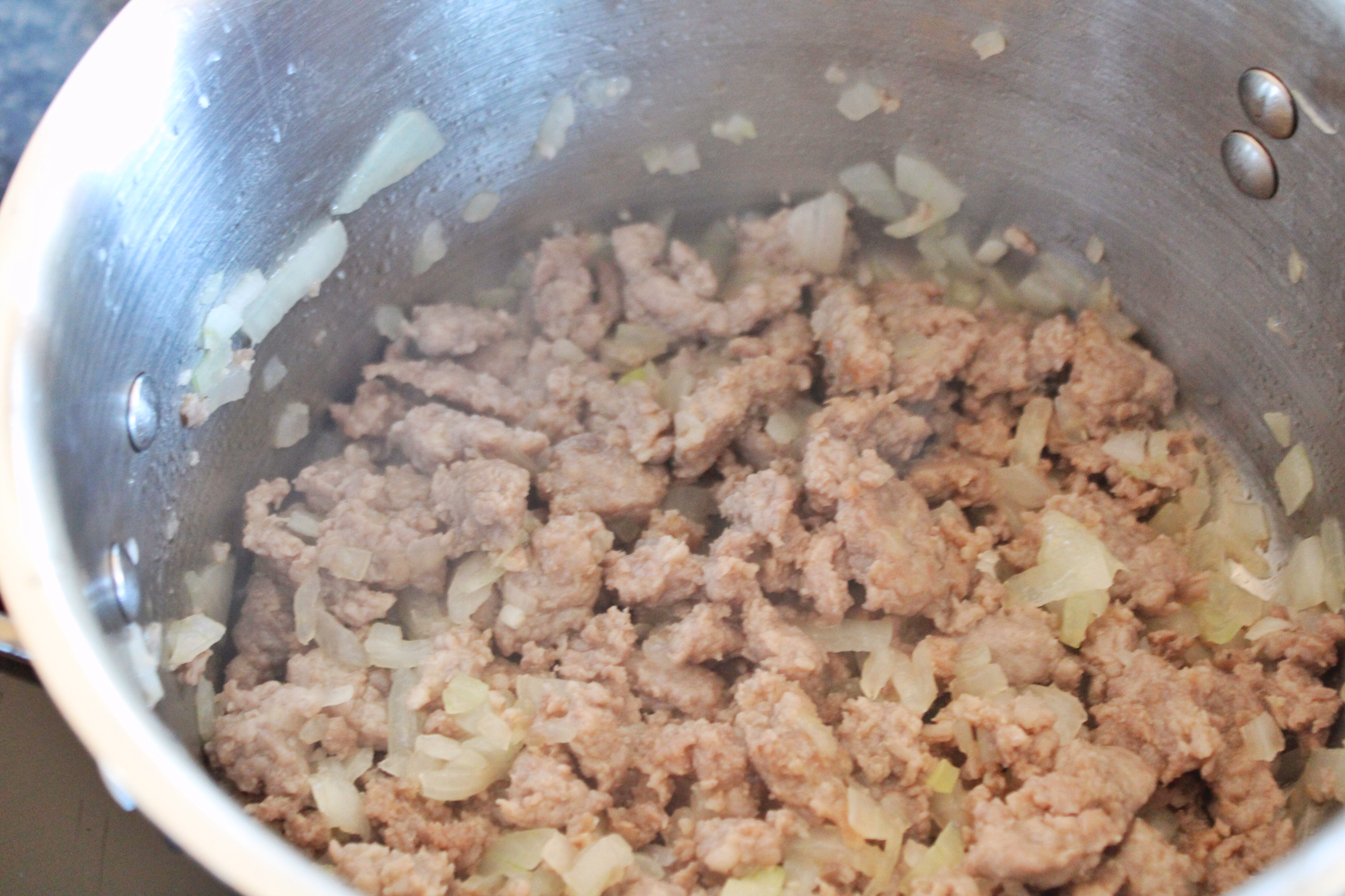 Gather your ingredients. You will need Italian sausage (I like using the breakfast sausage patties, but if you use sausage links, remove the casings), an onion, garlic, fennel seeds (or ground fennel if you can find it), red pepper flakes, chicken broth, petite diced tomatoes, your favorite gluten free pasta, Italian seasoning, Parmesan cheese, cream cheese, and heavy cream.