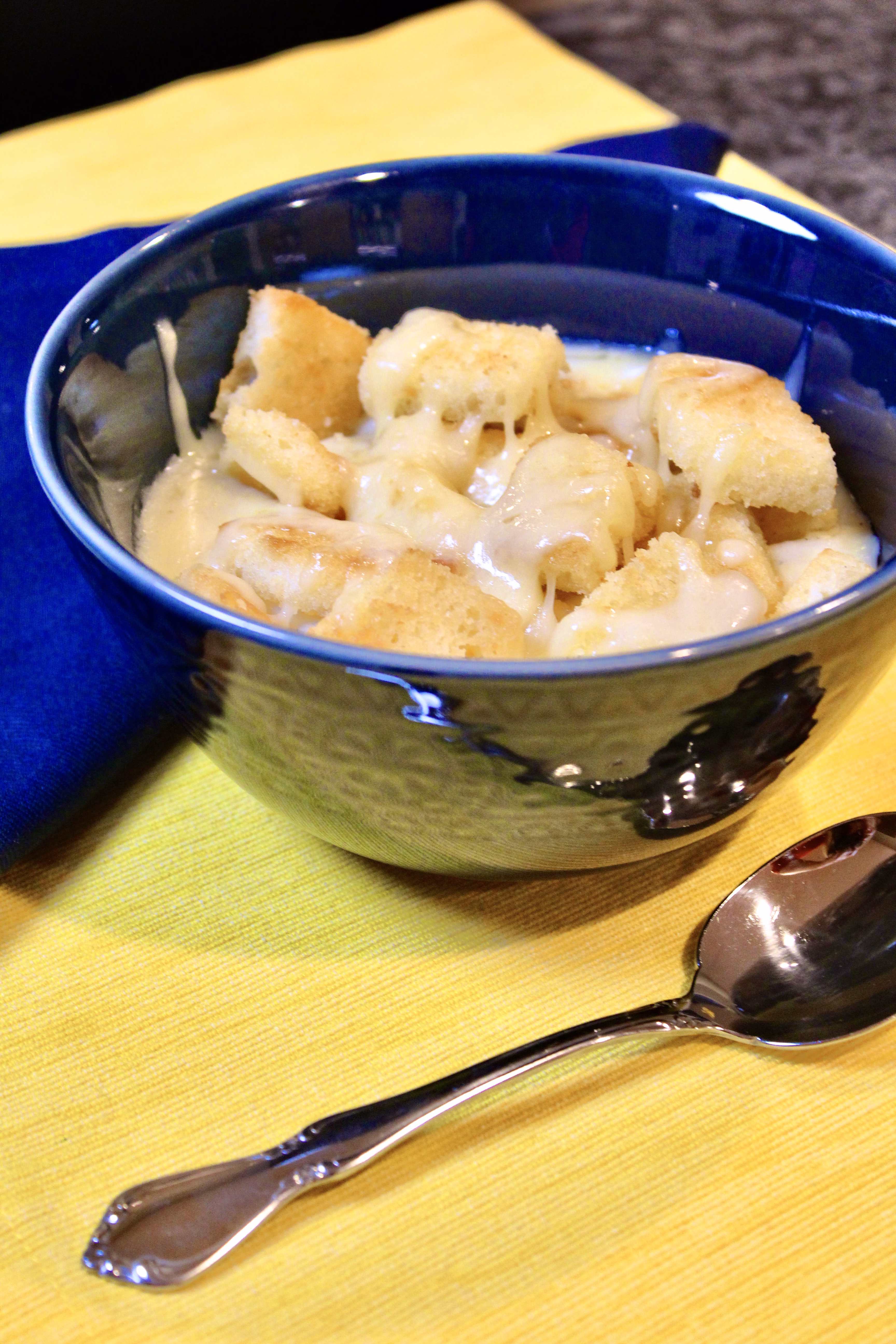 This variation on the famous French Onion Soup is perfect for kiddos! Instead of a brothy soup full of onions that you can't hide, this soup is creamy, cheesy, and covered in toasted bread cubes with melted Swiss over all! Don't worry, those delicious caramelized onions are in there, but they are disguised as cheese and will never reveal themselves unless need be. This soup is just so delicious..... I can't wait for you to try it and tell me what you think!
