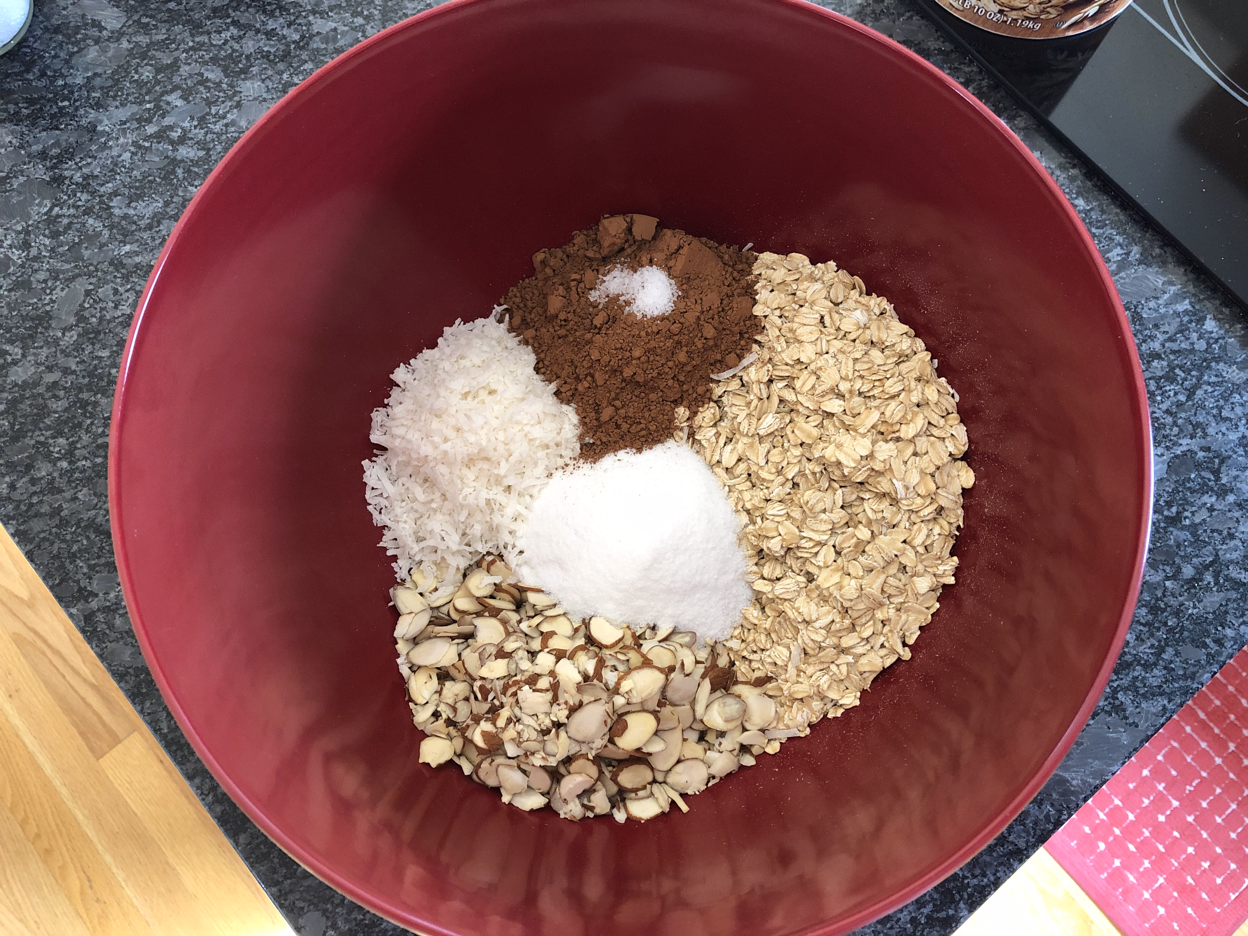 In a large bowl, combine 3 cups of oats, 1 1/4 cups sliced almonds, 3/4 cup coconut flakes, 1/2 cup cocoa powder, 1/4 teaspoon salt, and 1/3 cup sugar.