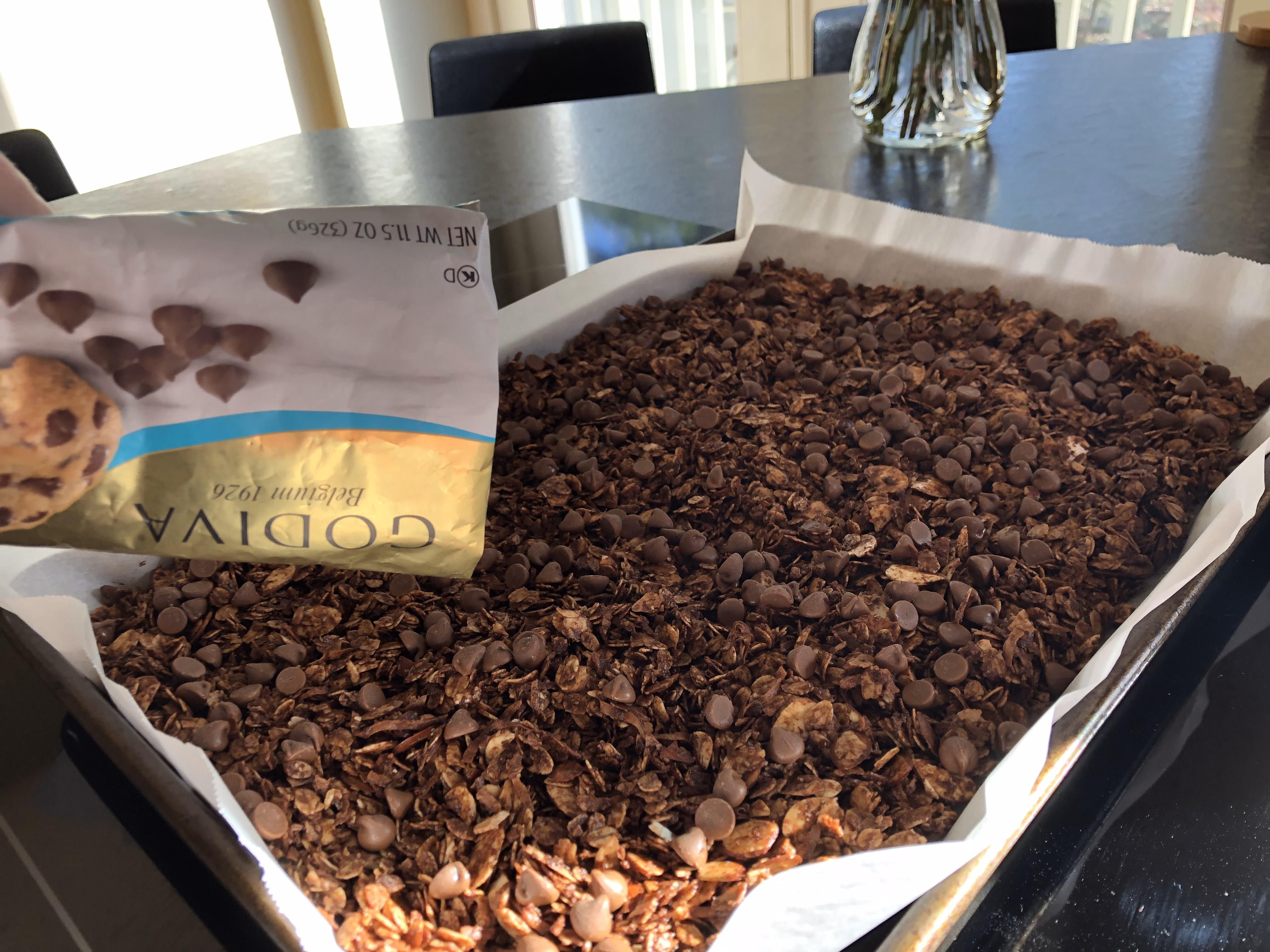 Let the granola stand for 1-2 hours. Gently scoop the granola into an airtight container for storing. You can also leave the granola out overnight or for several hours until the chocolate chips are fully cooled and hardened if you want to preserve the shape of the individual chocolate chip pieces in the granola. Store at room temperature or in the refrigerator.