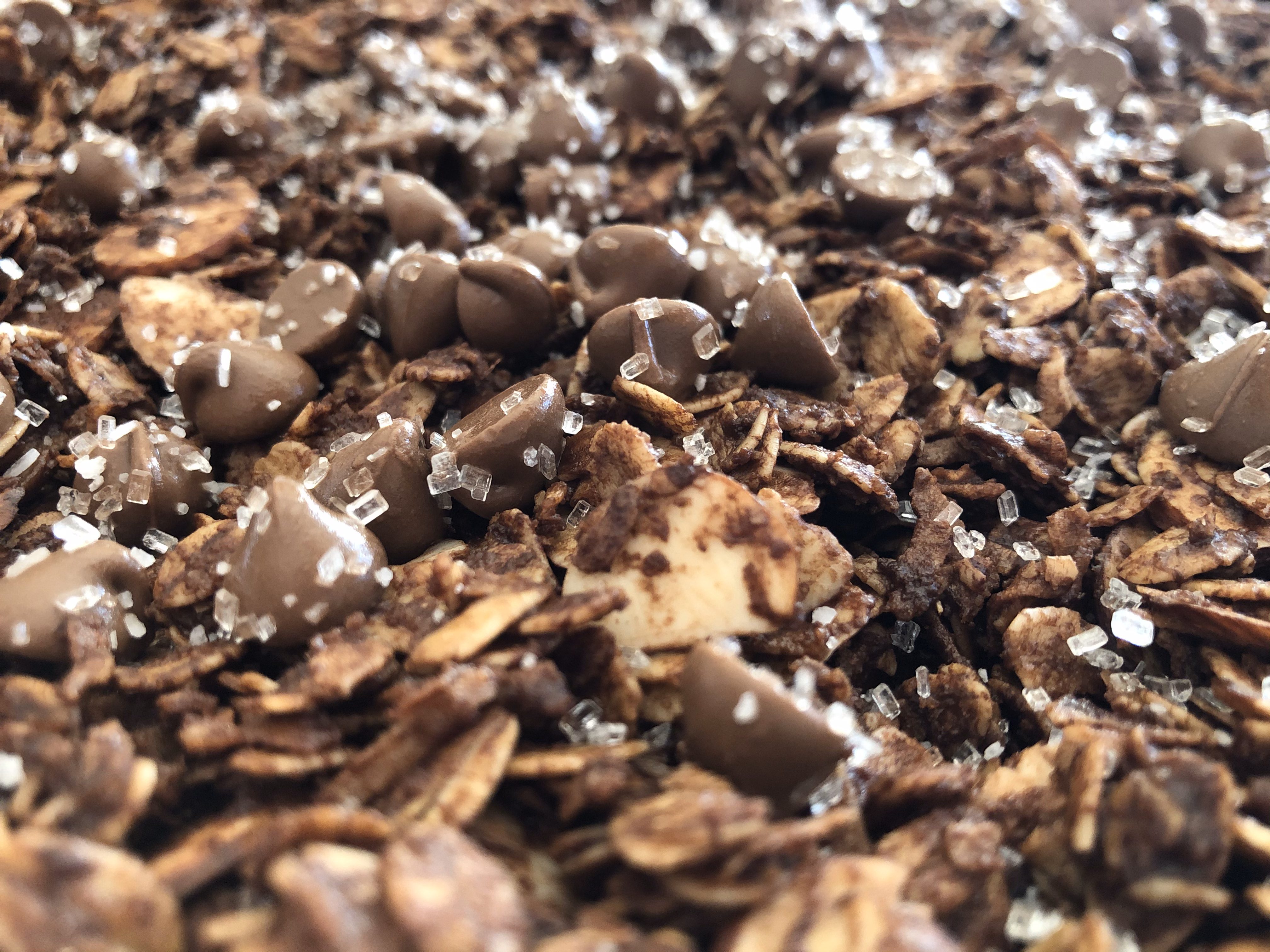 Preheat oven to 250°F. Toss the oats, almonds, coconut, cocoa, salt, and sugar in a large bowl. Whisk the melted coconut oil, maple syrup, and vanilla together. Pour the liquids over the dry ingredients and stir to combine. Spread the granola onto a baking sheet pan covered with parchment. Bake for 25 minutes, then stir. Return to the oven for 25 more minutes (50 minutes total). Remove from the oven and sprinkle the chocolate chips over the top of the granola. Return to the oven for 5-10 more minutes until chocolate chips are very soft. Sprinkle with coarse sugar and coarse kosher salt to taste. The added sugar and salt should stick to the surface of the melted chocolate chips. Now don't touch or stir!