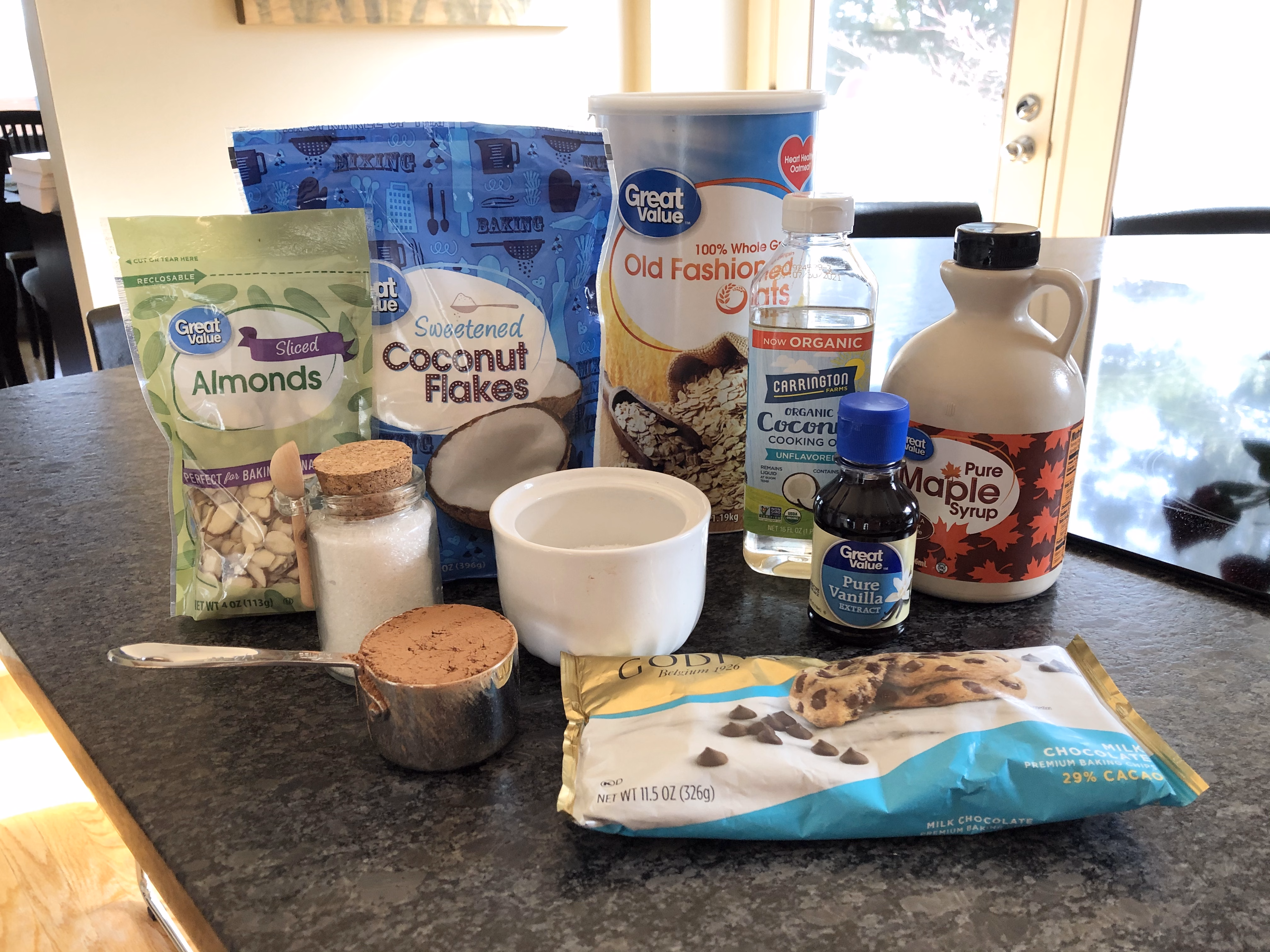 Gather your ingredients. You will need oats, almonds, coconut, cocoa powder, sugar, salt, coconut oil, maple syrup, vanilla, and chocolate chips.