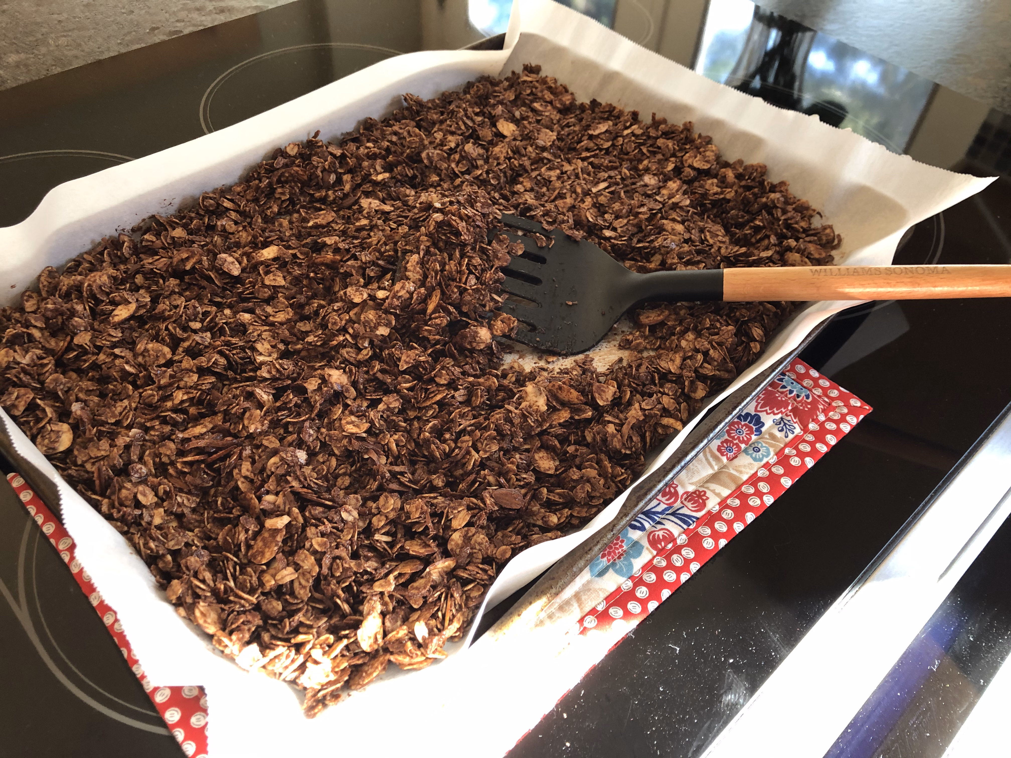 Sprinkle both sugar and salt generously over the granola, letting it stick to the melted chocolate chips. Oh yes! Now the hard part..... let it cool on the pan for 2 hours or up to overnight.
