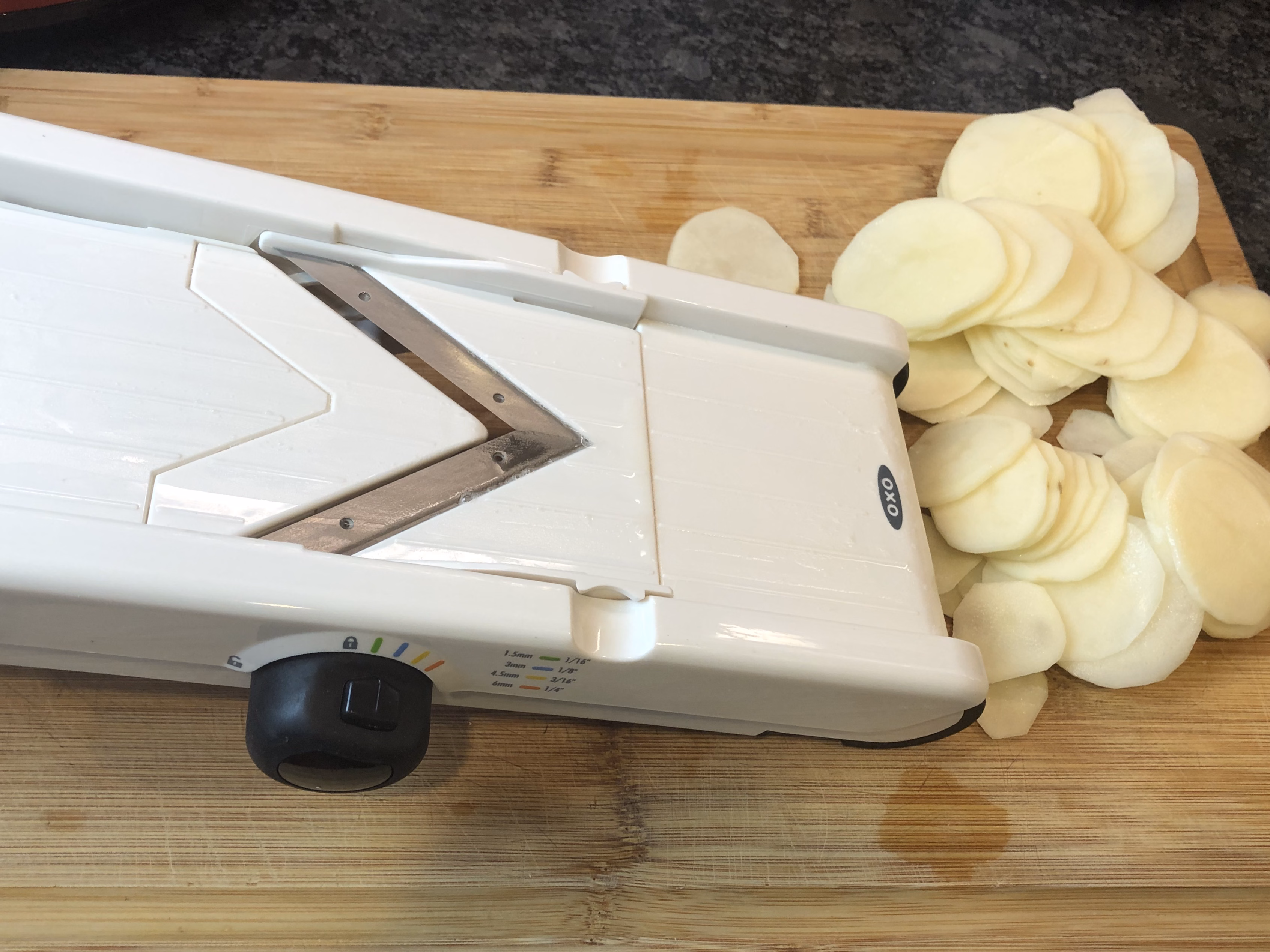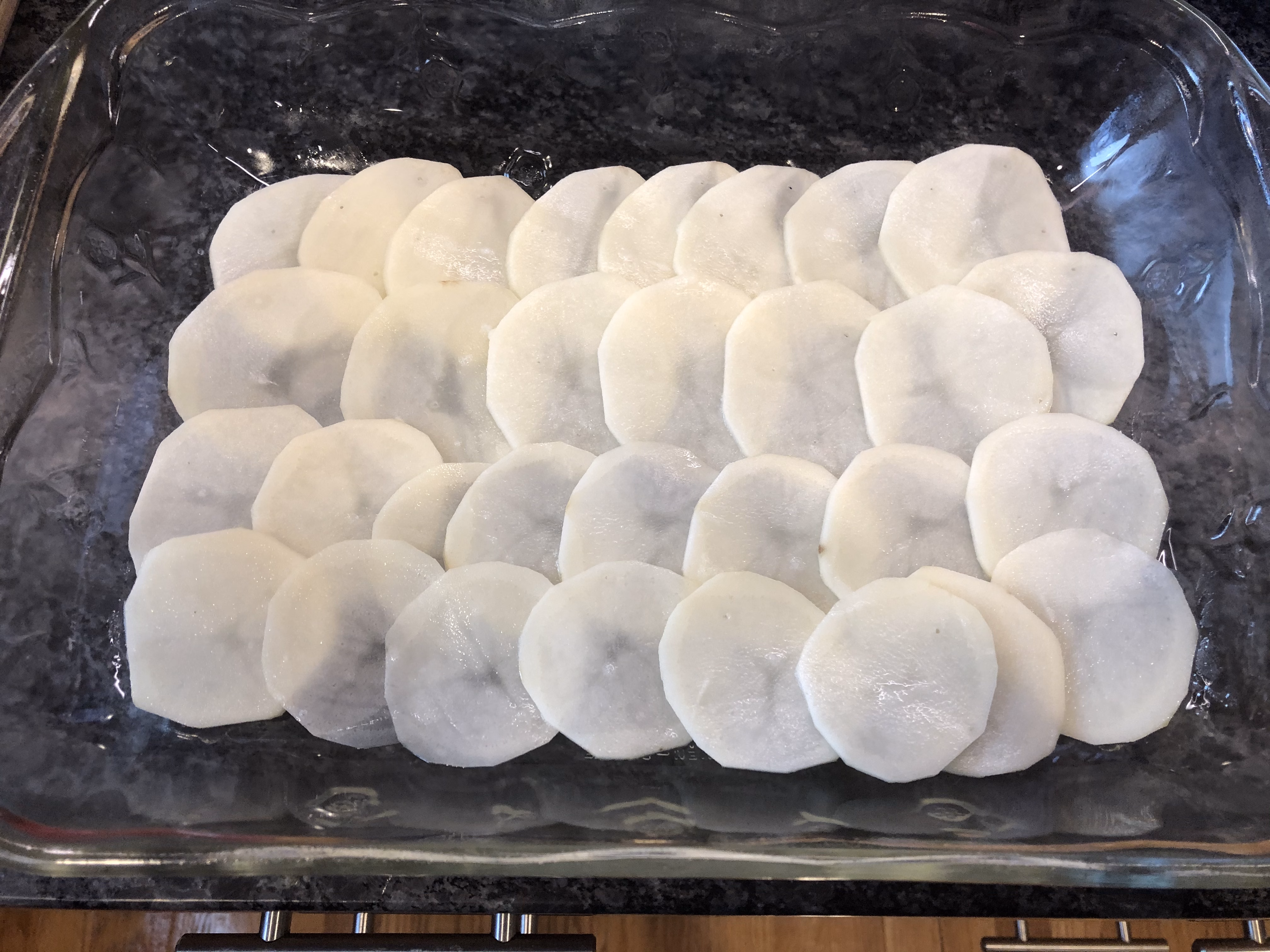 Right before assembling, I slice my potatoes on a mandolin so the slices are nice and uniform. If you do it early, the potatoes can be put in a bowl of water to keep them from turning an off-color.