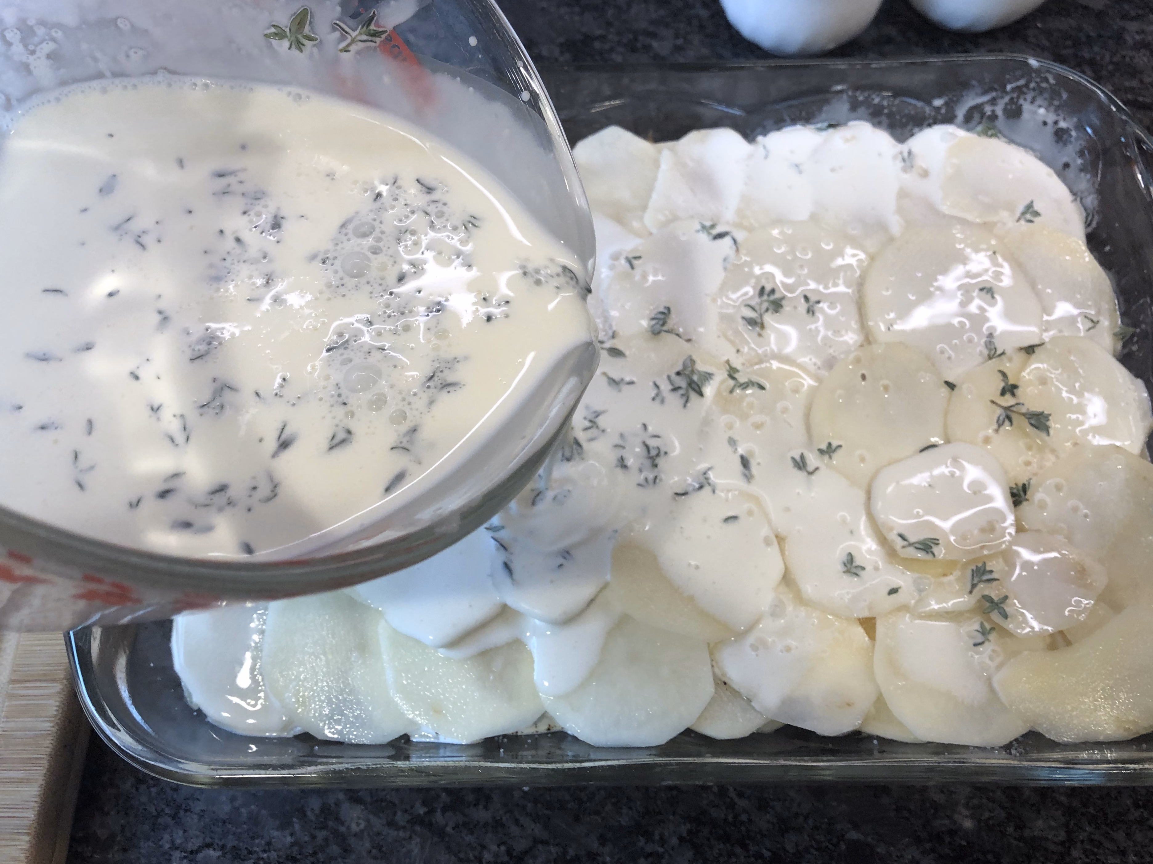 Pour the cream mixture on top of the potatoes.