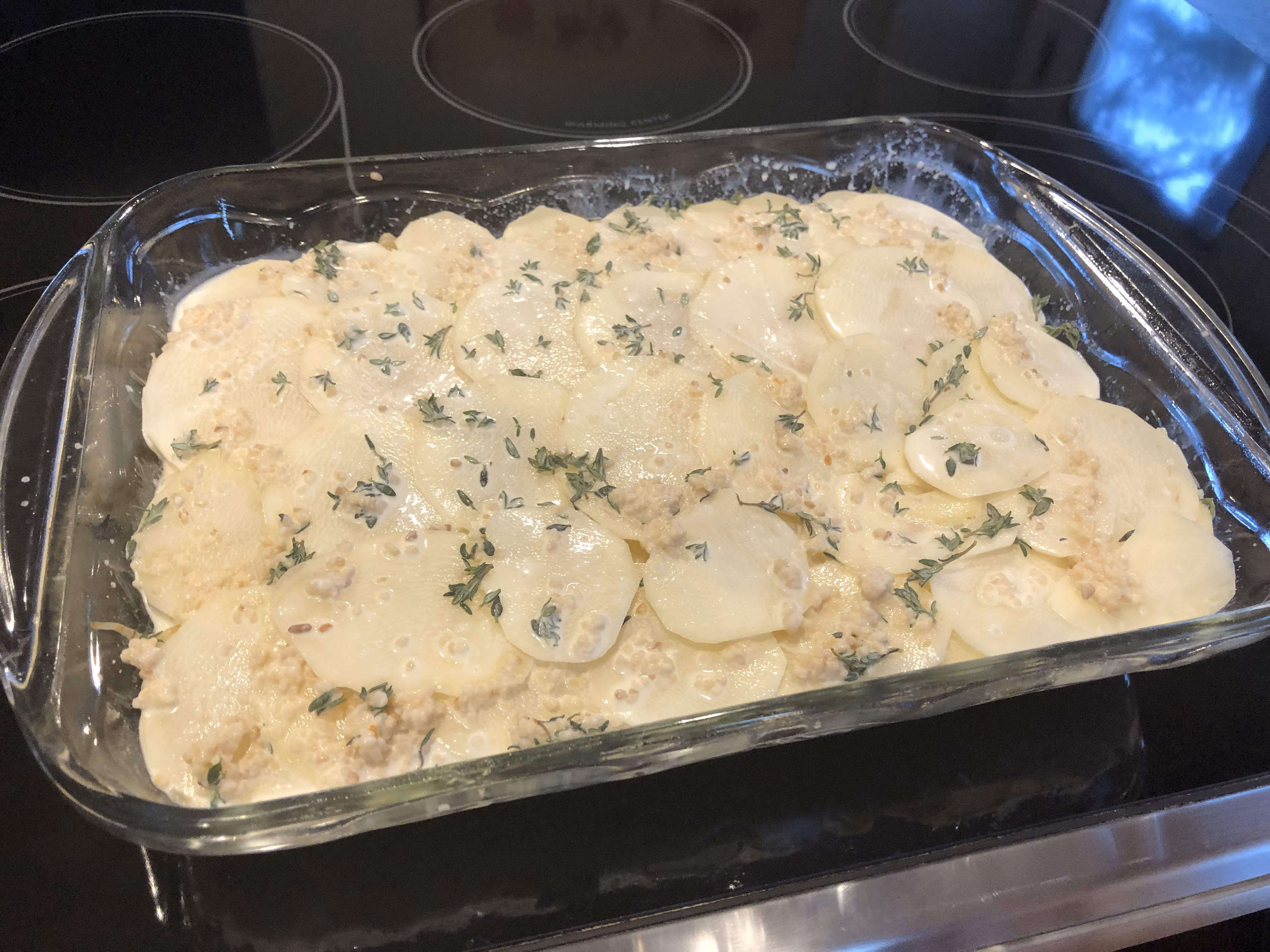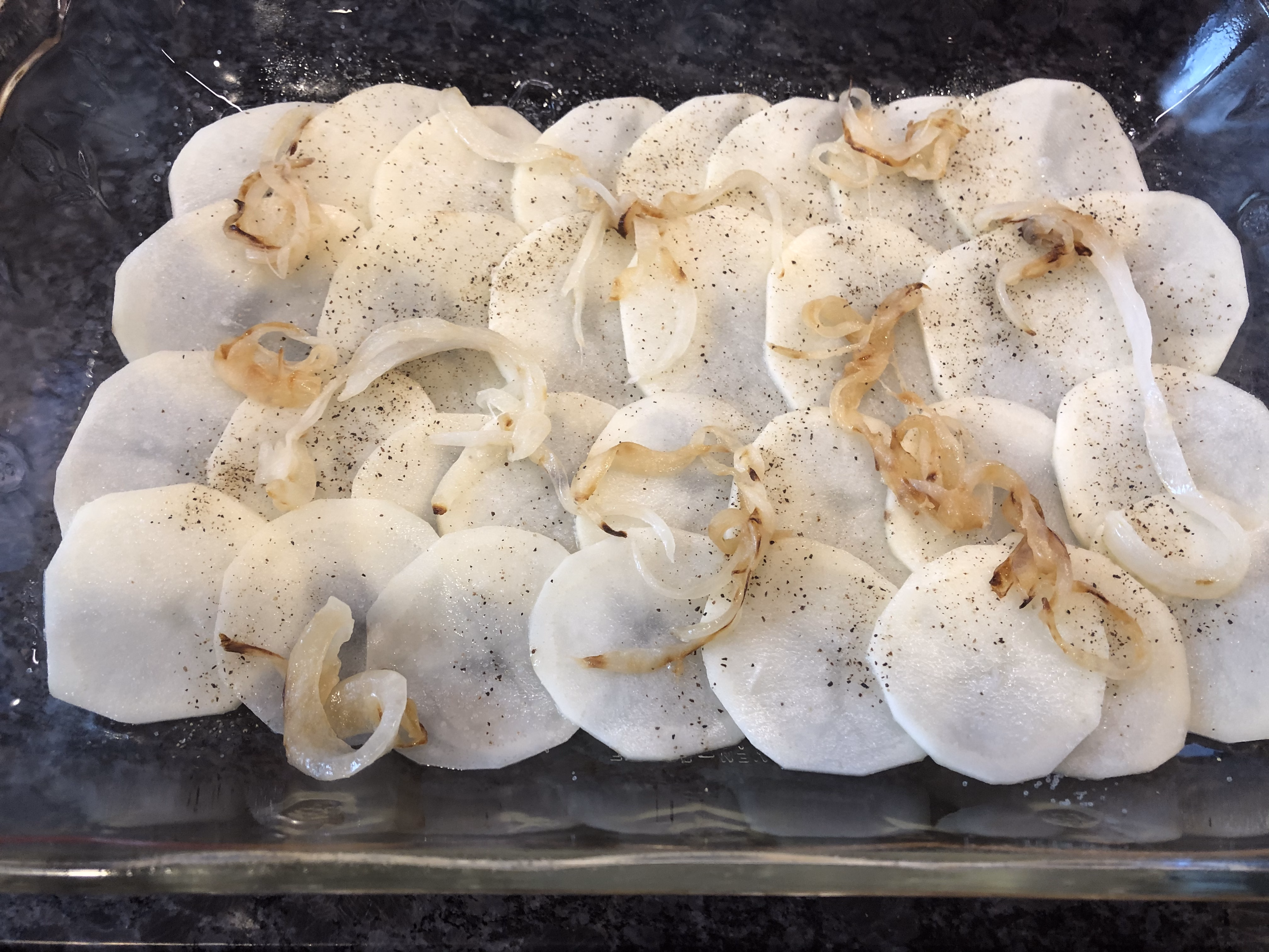 Sprinkle the potatoes with salt and pepper, then top with some of the grilled onions. Continue making layers and repeating until the dish is 3/4 full. End with a layer of potatoes on top.