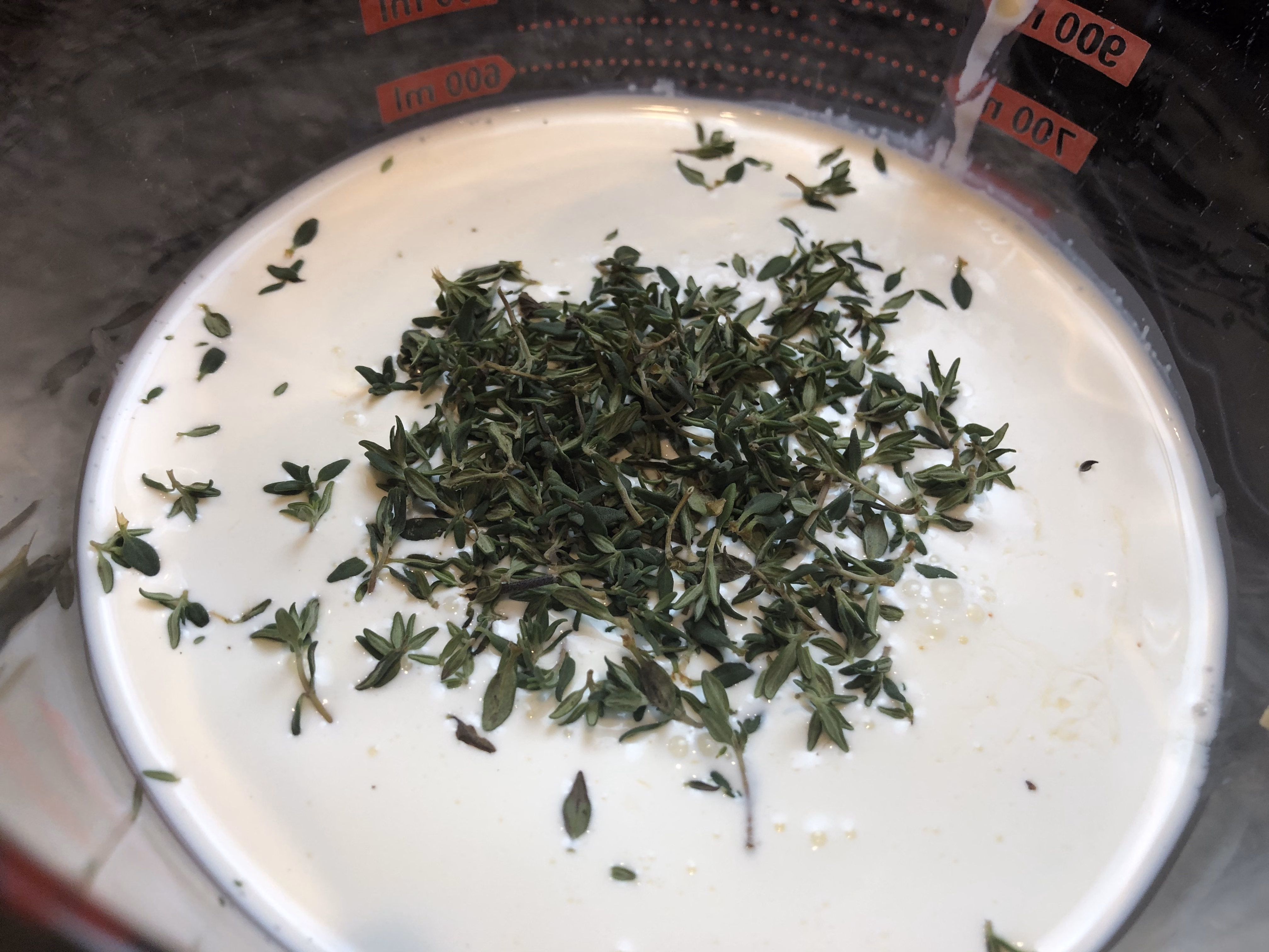 In a mixing bowl, add the 2 cups heavy cream. Strip thyme leaves from the sprigs and add about 2 tablespoons thyme leaves (no need to chop).