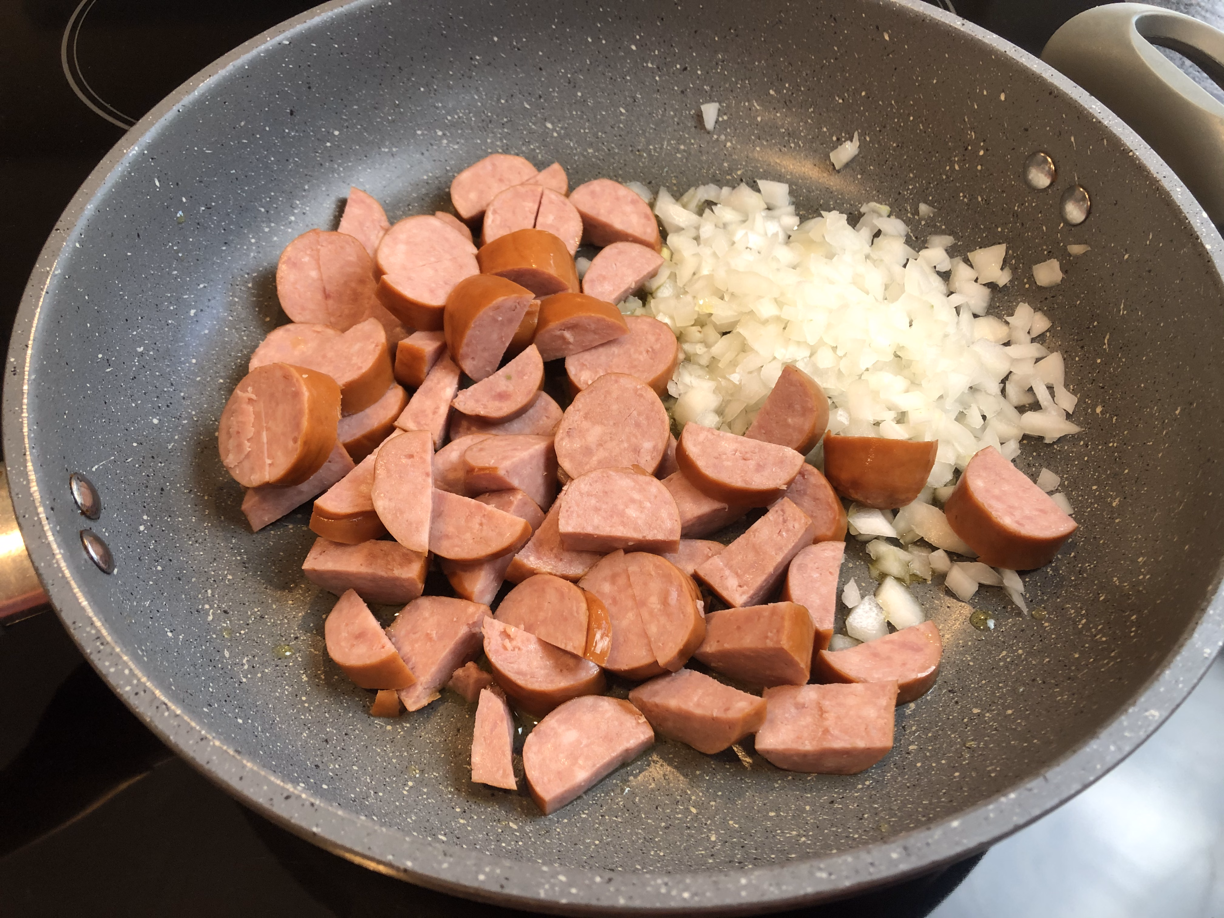 In a large skillet, heat some olive oil over medium heat. Add the kielbasa and onion; sauté until onion is tender.