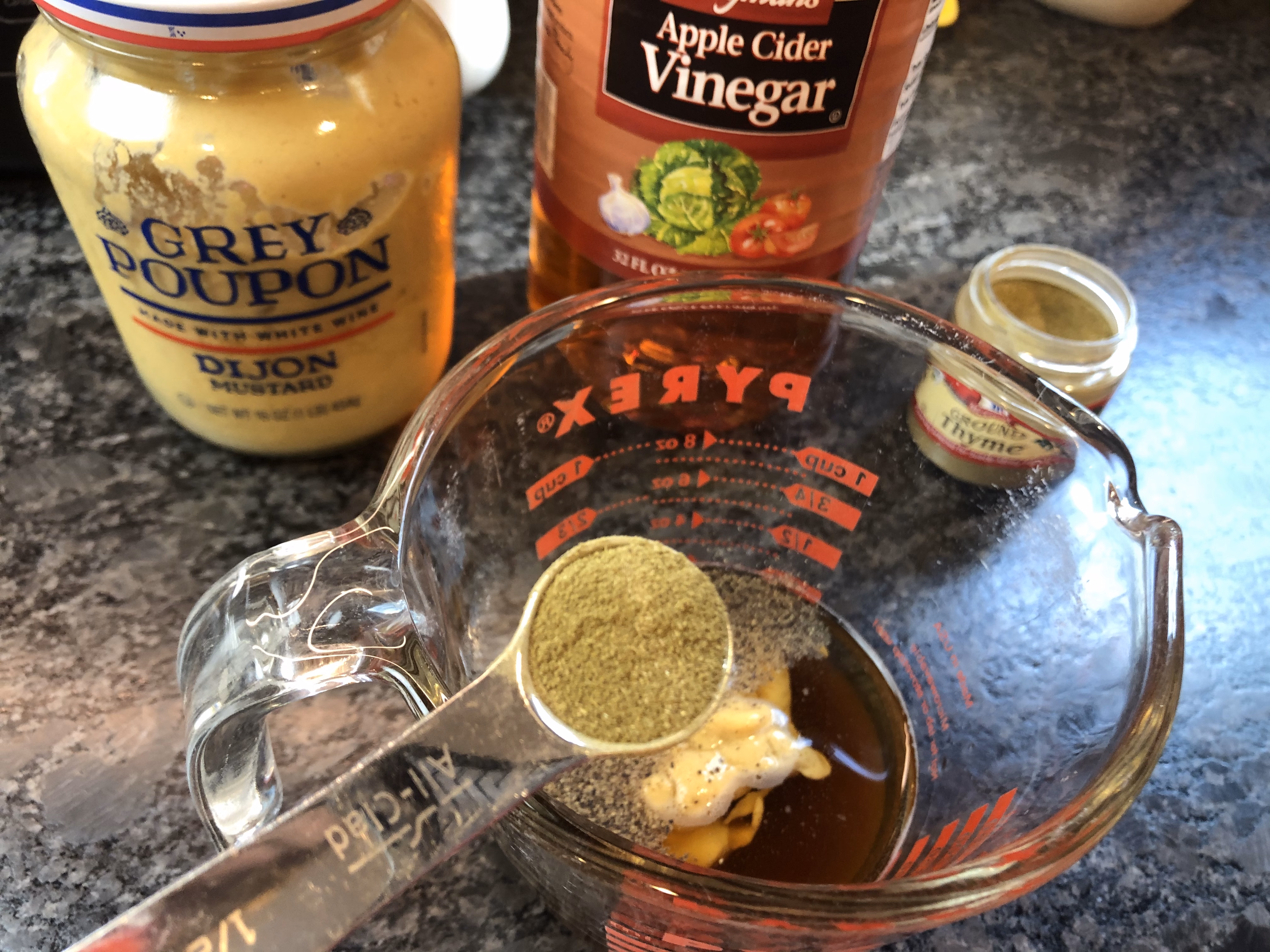 For the sauce, in a small bowl combine 2 tablespoons brown sugar, 2 tablespoons apple cider vinegar, 1 tablespoon Dijon mustard, 1/2 teaspoon dried thyme, and 1/4 teaspoon black pepper. Whisk to combine. Set aside.