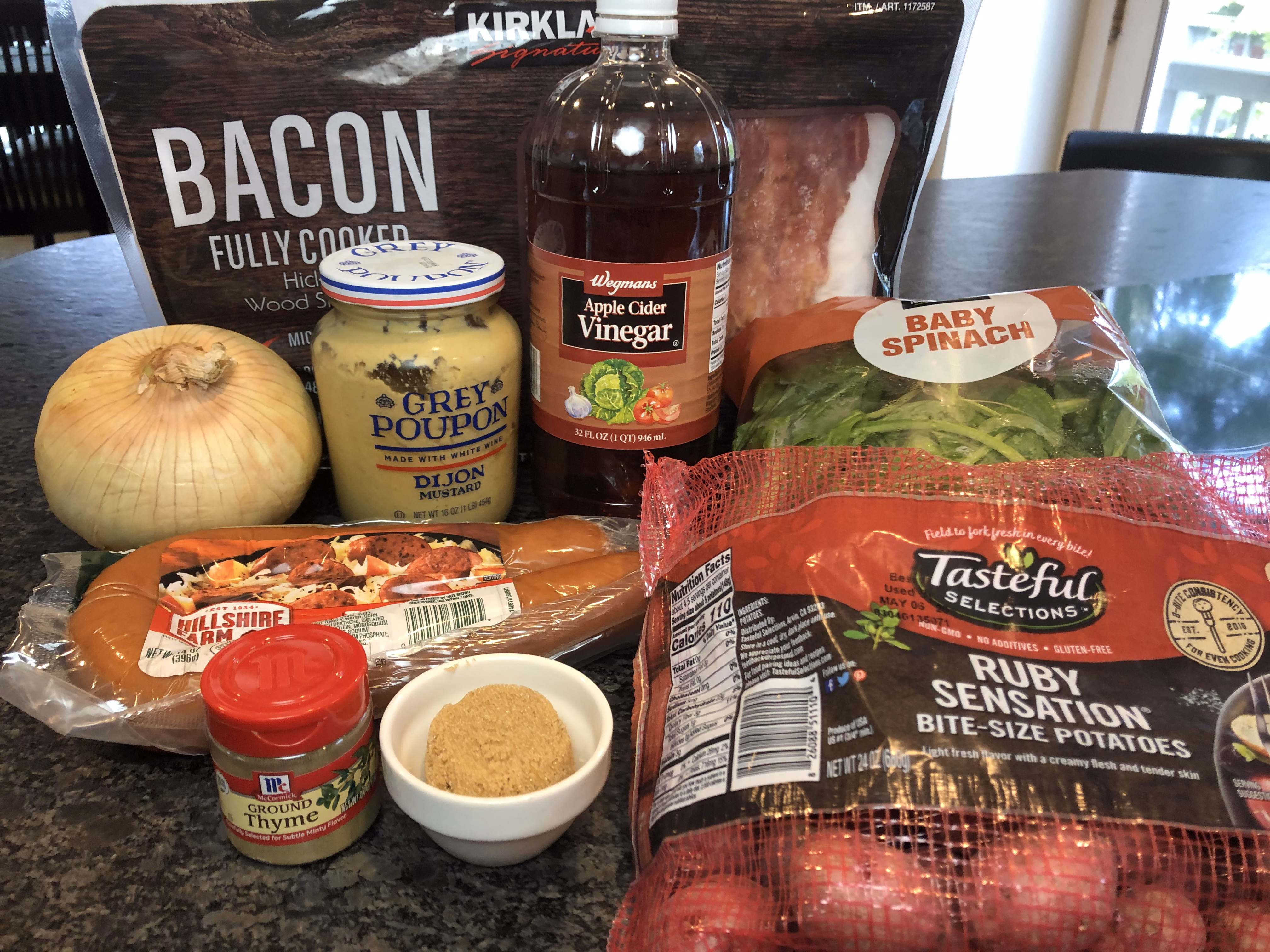 Gather your ingredients. You will need a smoked sausage, red potatoes, an onion, baby spinach, cooked bacon, brown sugar, apple cider vinegar, Dijon mustard, and thyme.