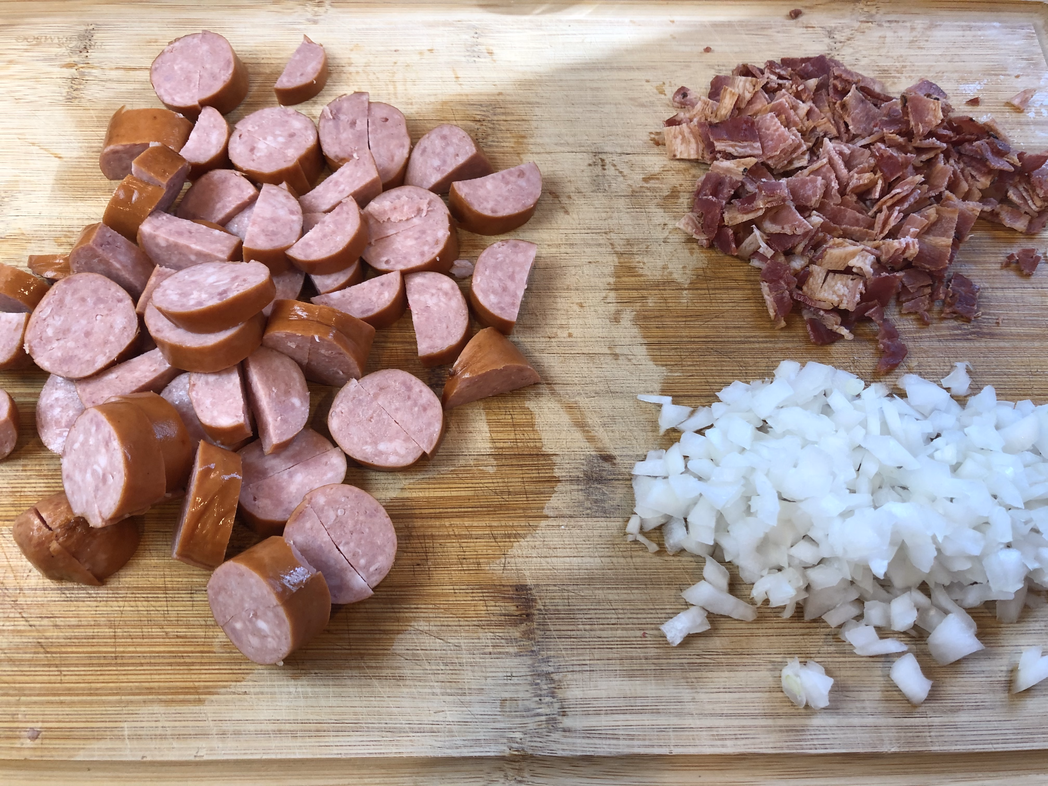 Prepare your other ingredients by cutting the kielbasa in half lengthwise, then slicing. Cut 8 slices cooked bacon and dice the 1/2 cup onion.