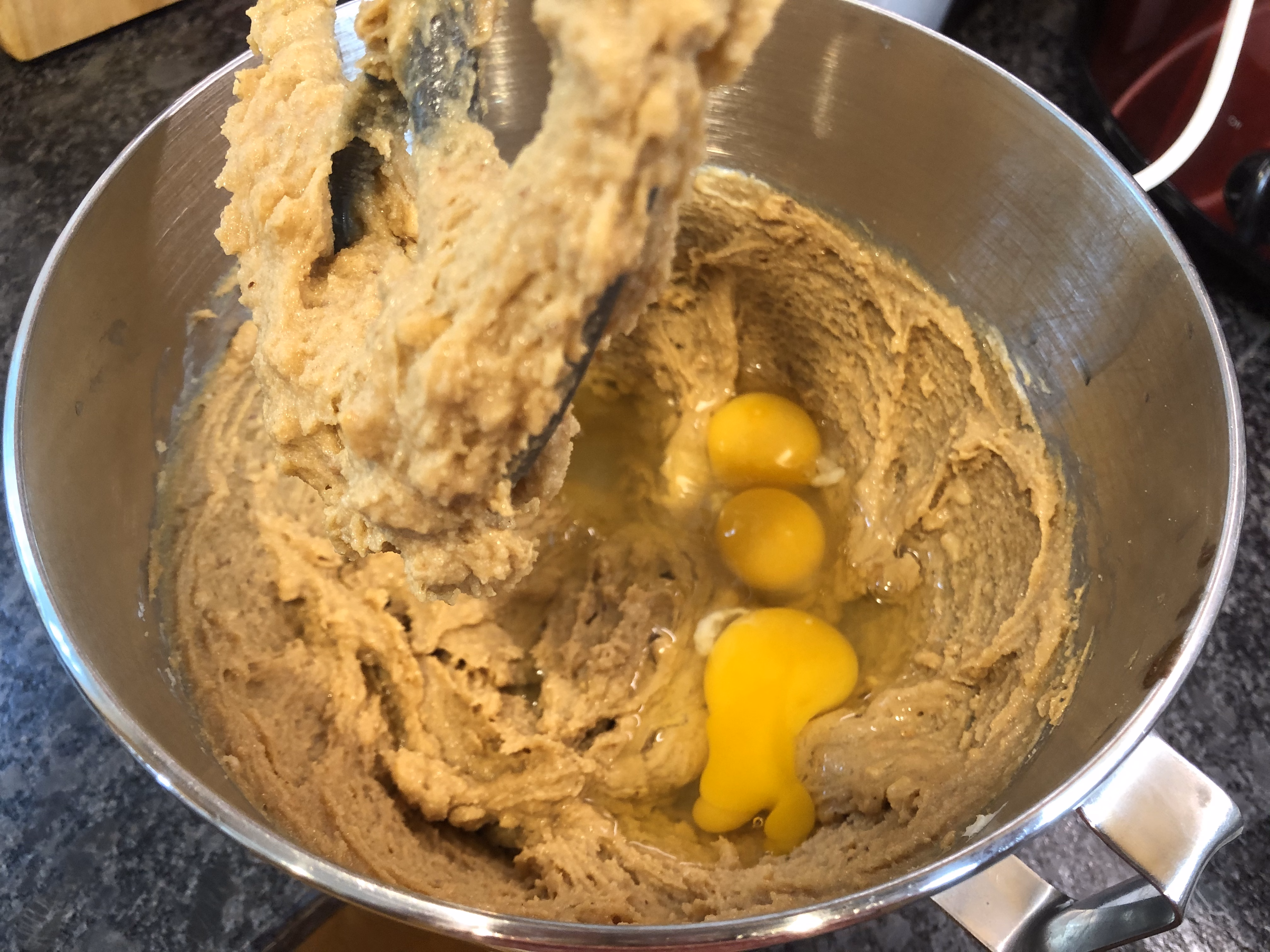 In a large mixing bowl, cream together the stick of butter, 1 1/2 cups peanut butter, 1 cup sugar, and 1 cup packed brown sugar. Add 3 eggs and 1 1/2 teaspoons vanilla and beat until creamed.