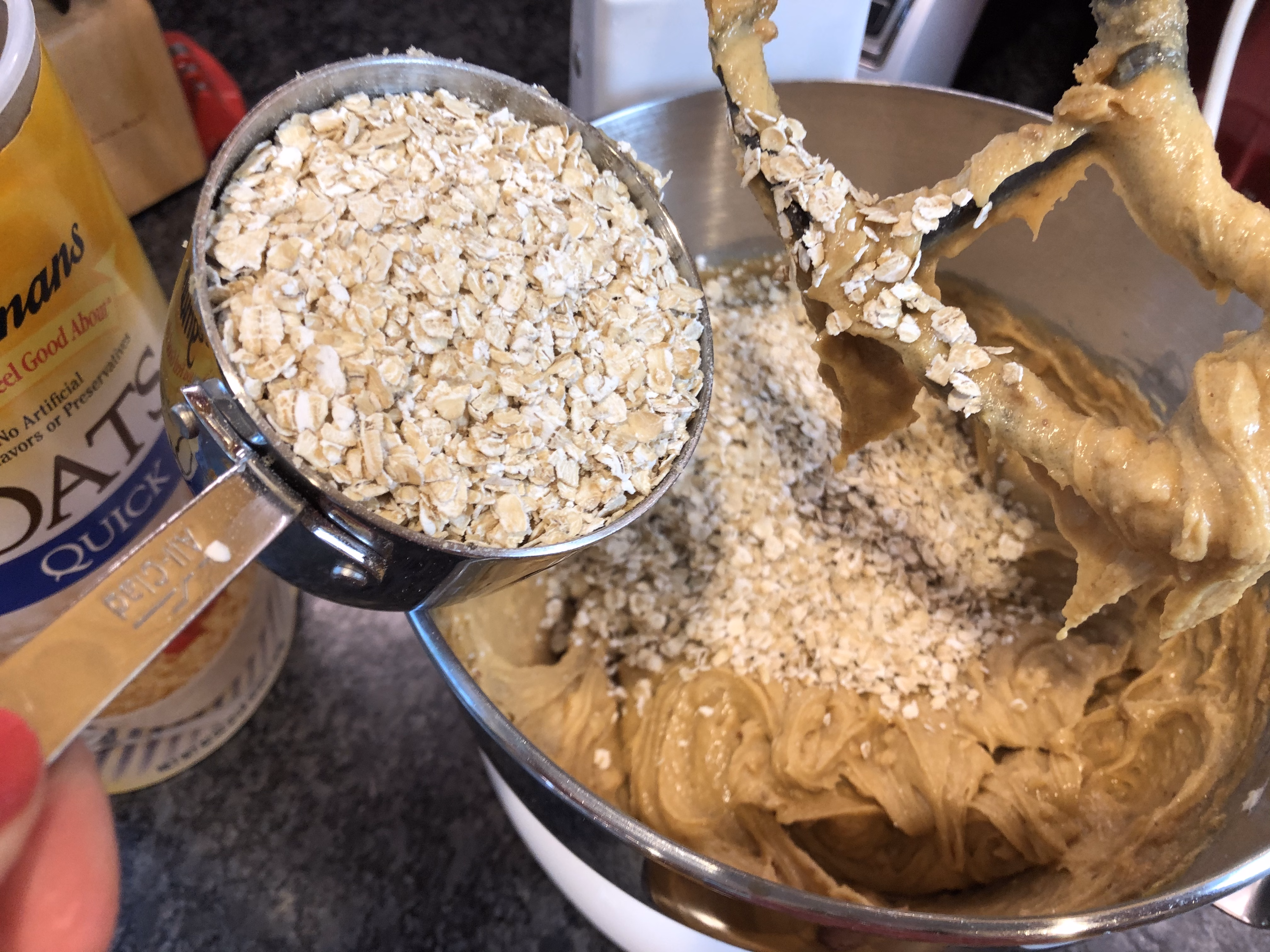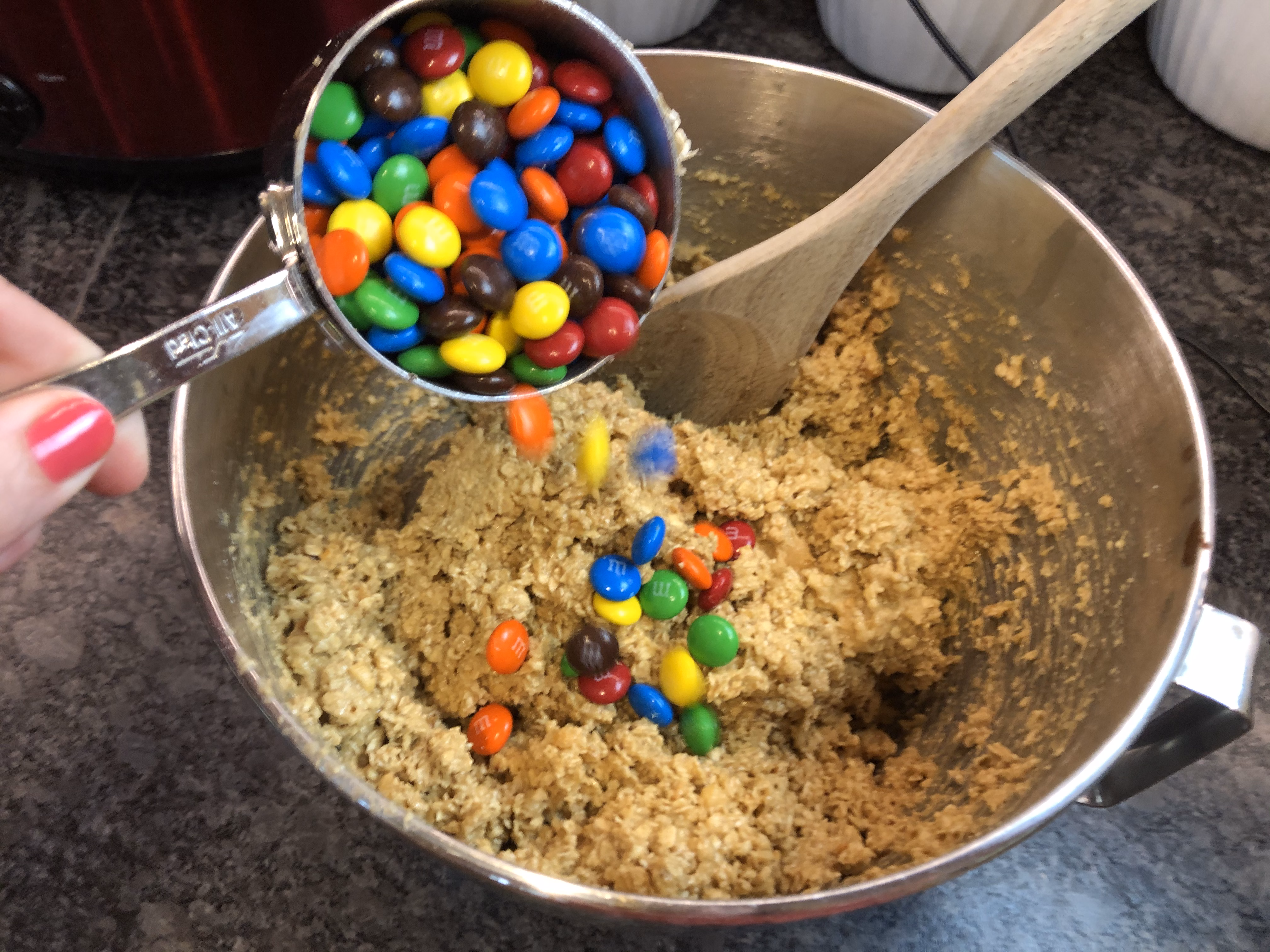 Add 4 1/2 cups quick oats and 2 teaspoons baking soda. Mix until well combined. Remove from mixer and stir in 2 cups M&M's carefully with a wooden spoon.