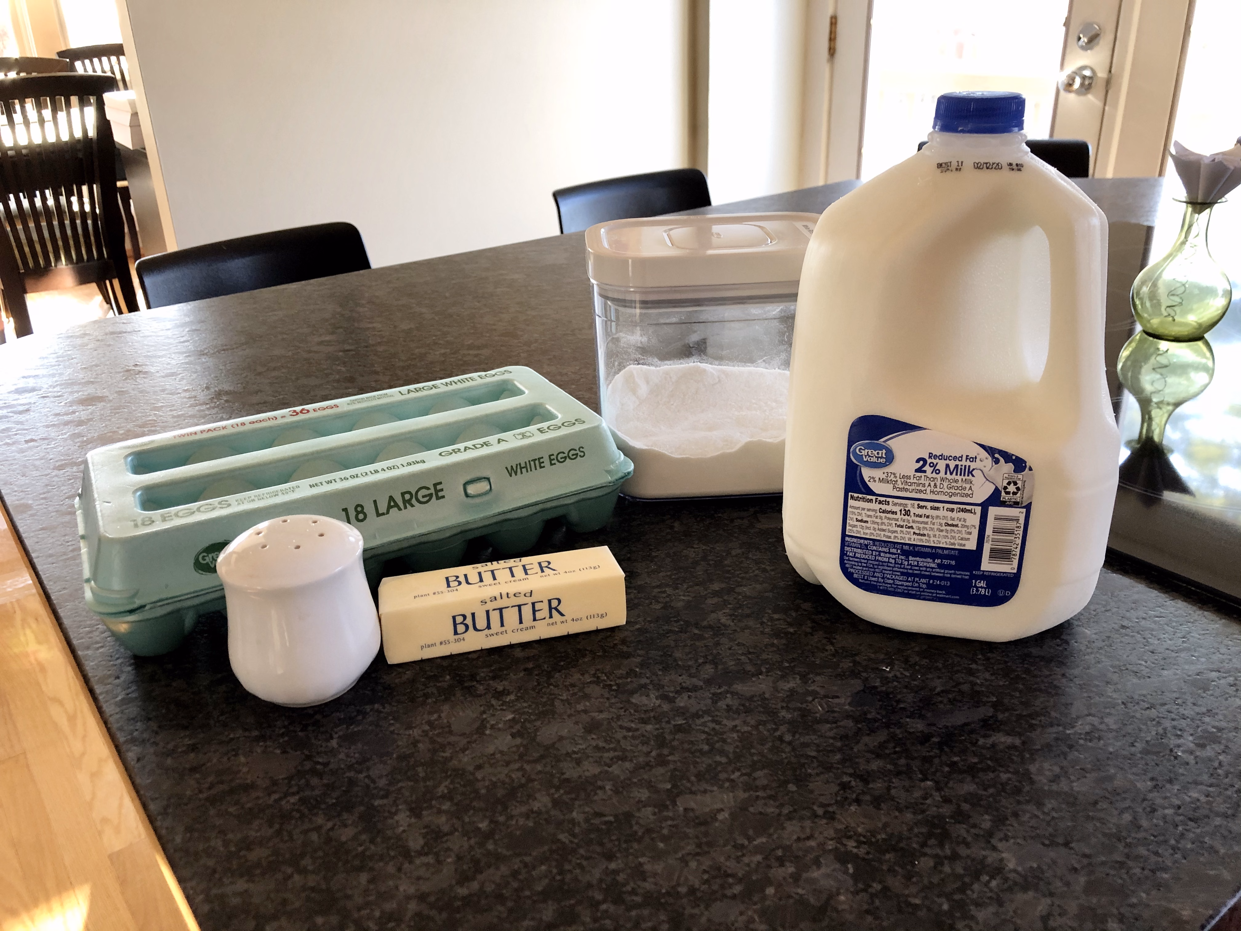 Preheat your oven to 400° F. Lightly grease two muffin tins. Gather your ingredients. You will need 1 cup white rice flour, 6 eggs, 1 cup milk, 1/4 cup melted butter, and a dash of salt. Using an all-purpose GF flour with gum doesn't give the same consistency in this recipe. You could experiment with other combinations of flours, but using just white rice flour makes these most similar to making them with regular flour.