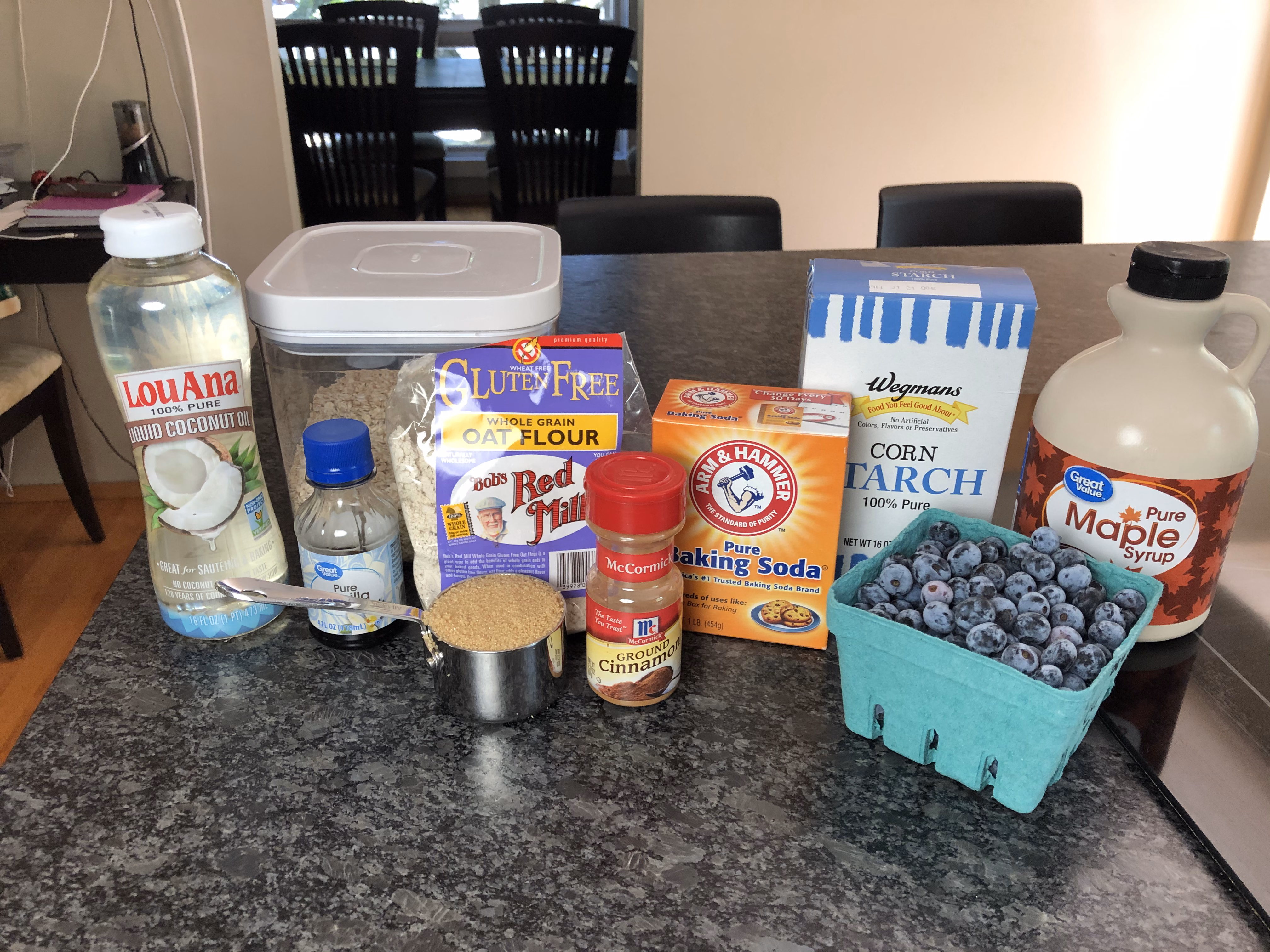 Preheat oven to 350°F. Gather your ingredients. You will need oat flour, quick oats, brown sugar, cinnamon, baking soda, salt, coconut oil, fresh blueberries, maple syrup, cornstarch, and vanilla.