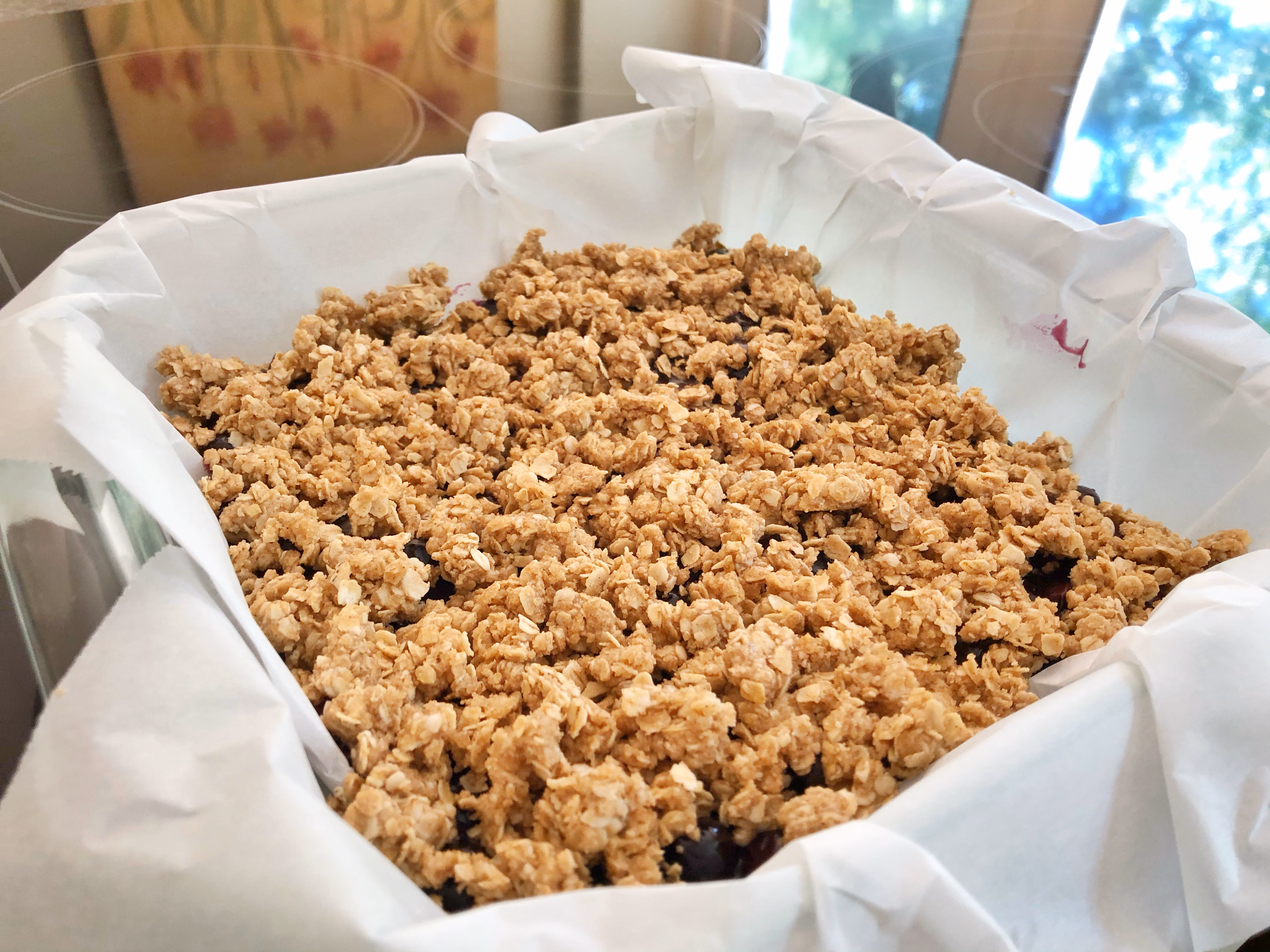 Take the remaining crust and sprinkle it on top like a crumble. Bake for 30-35 minutes or until blueberry filling is bubbling and top is golden.