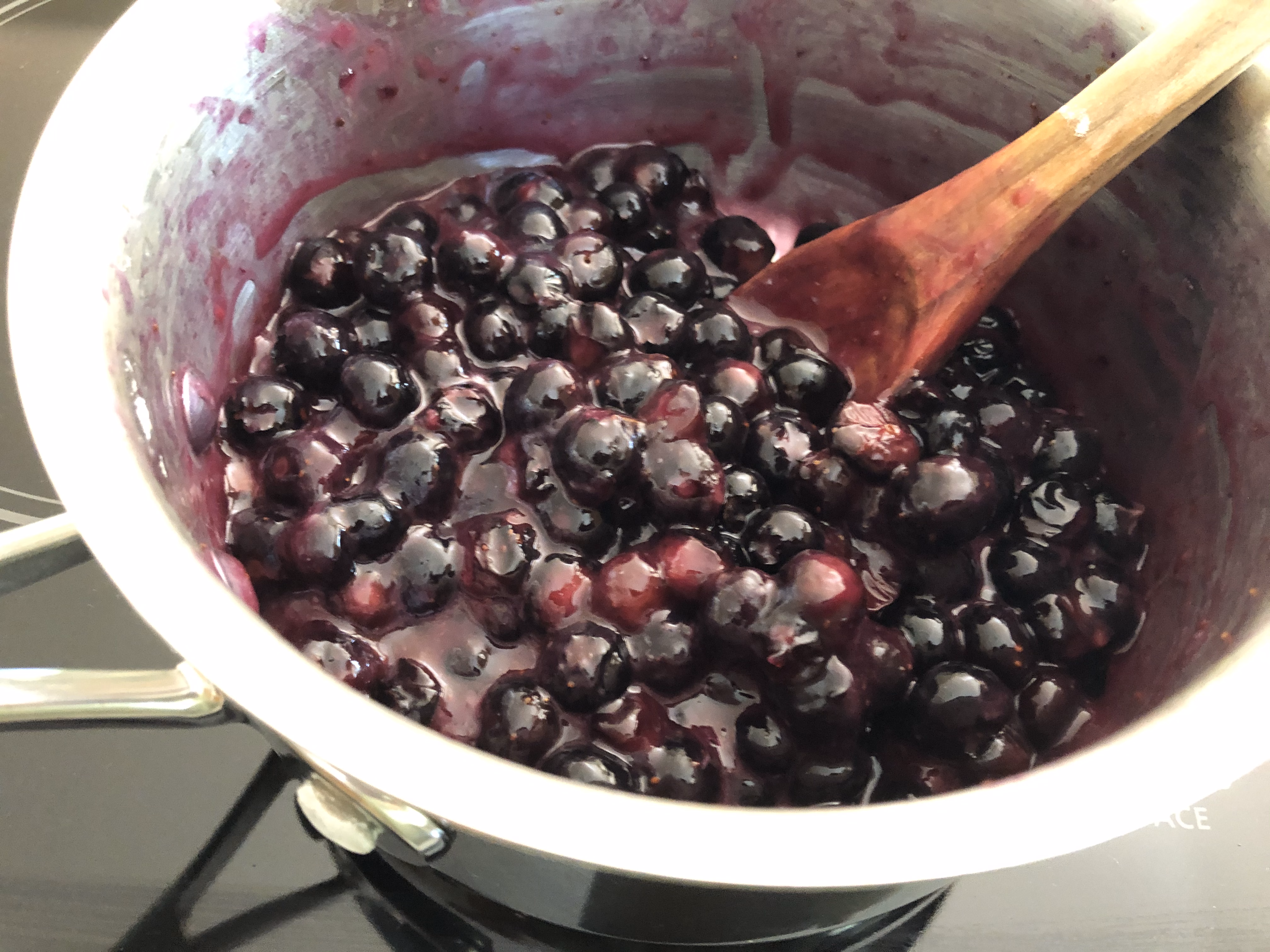For the blueberry pie filling, in a saucepan combine 2 1/2 cups fresh blueberries with 3 tablespoons pure maple syrup and 1 1/2 tablespoons cornstarch. Stir over medium heat until it comes to a boil. Continue stirring until the the blueberries are soft and the juices are thickened.