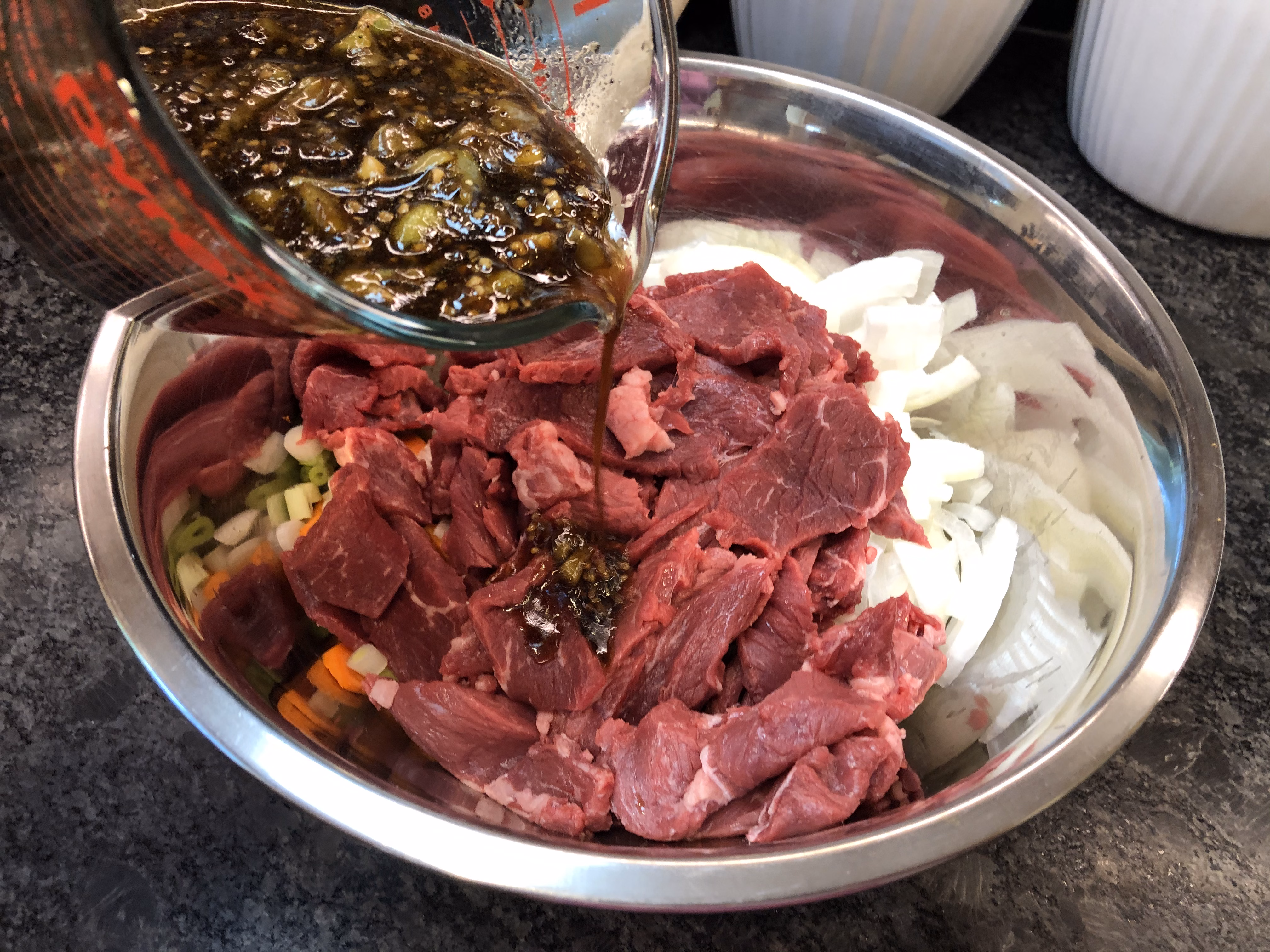When you are ready to cook, heat a large skillet over high heat. No need to add oil, as you will be dumping the entire bowl into the skillet, and the marinade/sauce has oil in it.