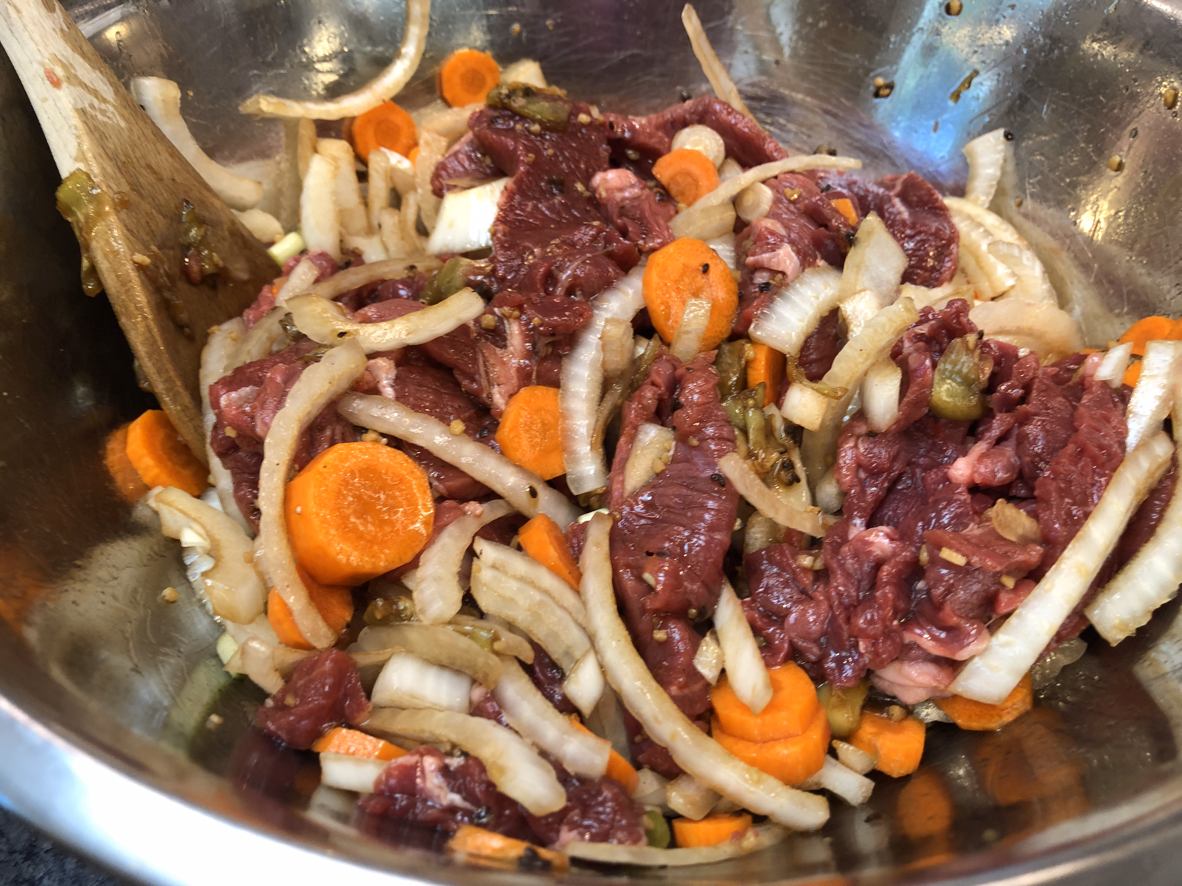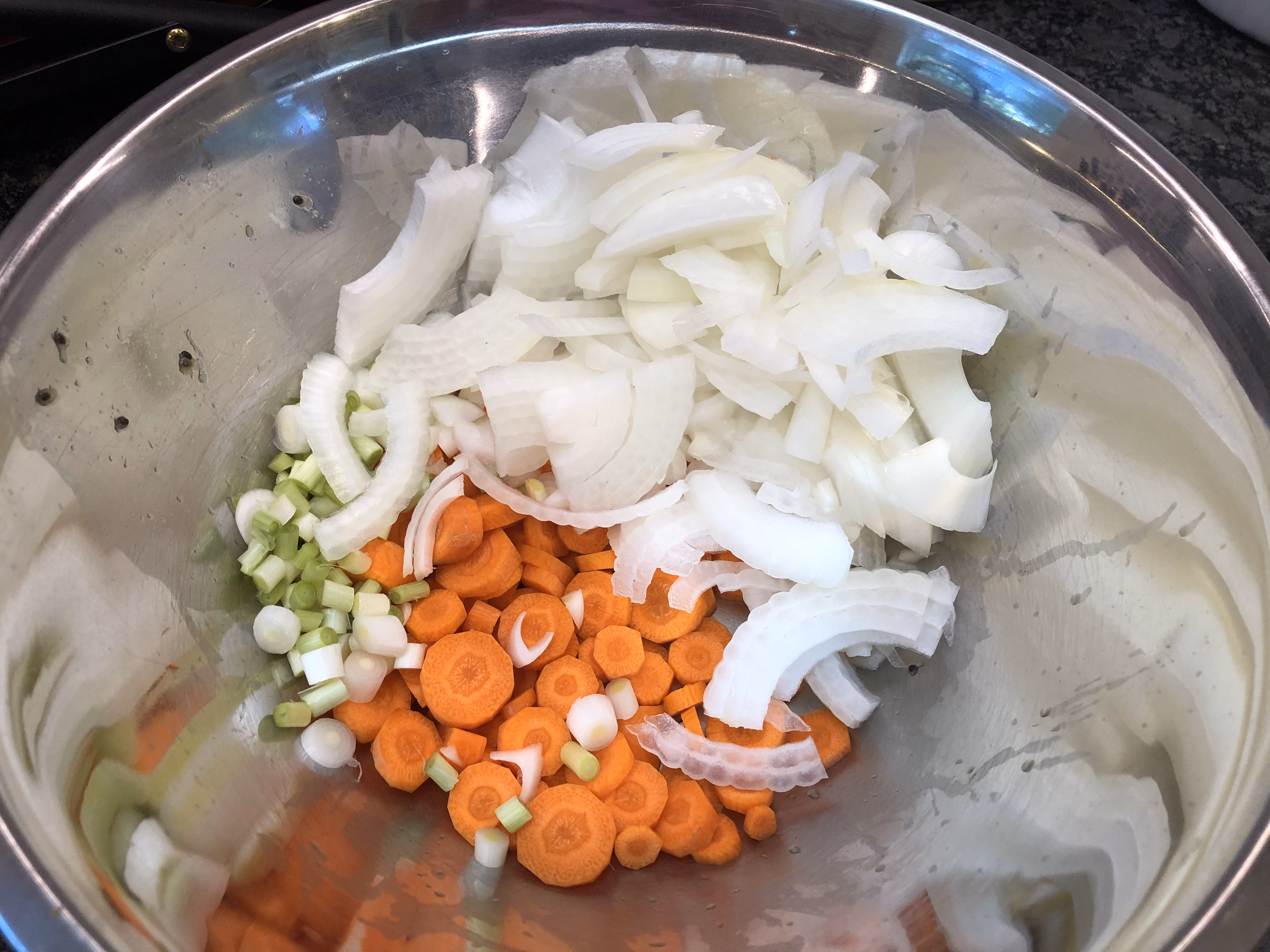 Gather your ingredients. You will need about 1 1/2 lbs. of beef (I used a sirloin steak, but any beef cut can work), carrots, onion, green onion, kiwi, sugar, salt, soy sauce, sesame oil, garlic, and honey.