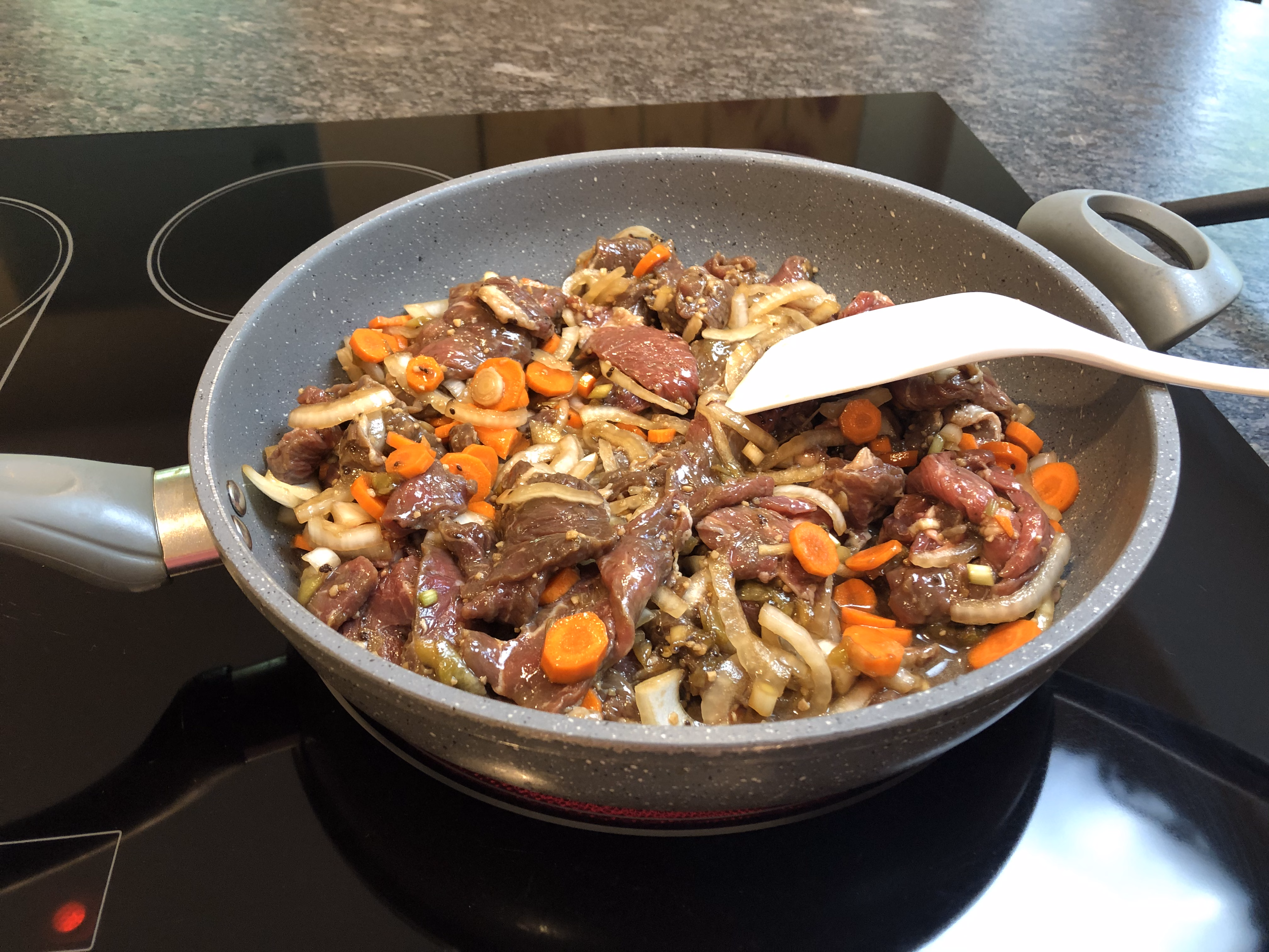 Cook over medium high heat for just a few minutes or until beef is cooked through and vegetables are crisp tender. The liquid will be thin, so I like to make a slurry with cornstarch and water to thicken it up a bit, but that is my preference.