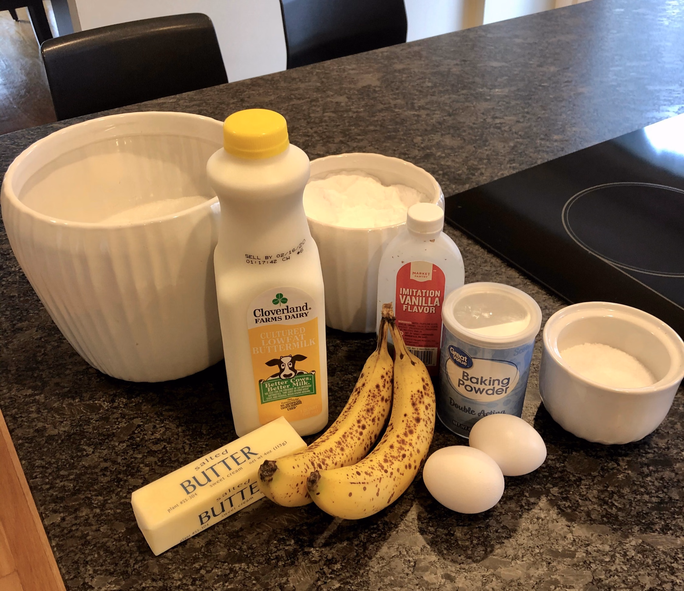 2-3 ripe bananas, buttermilk (if you don't have this, simply make your own by adding a small amount of lemon juice to regular milk in the amount asked for), vanilla (I've used up all my good vanilla and now have to use imitation thanks to crazy prices! ), GF flour of choice (just be sure it has xanthan gum in it; if not, add 1 tsp), baking powder, salt, and baking soda.