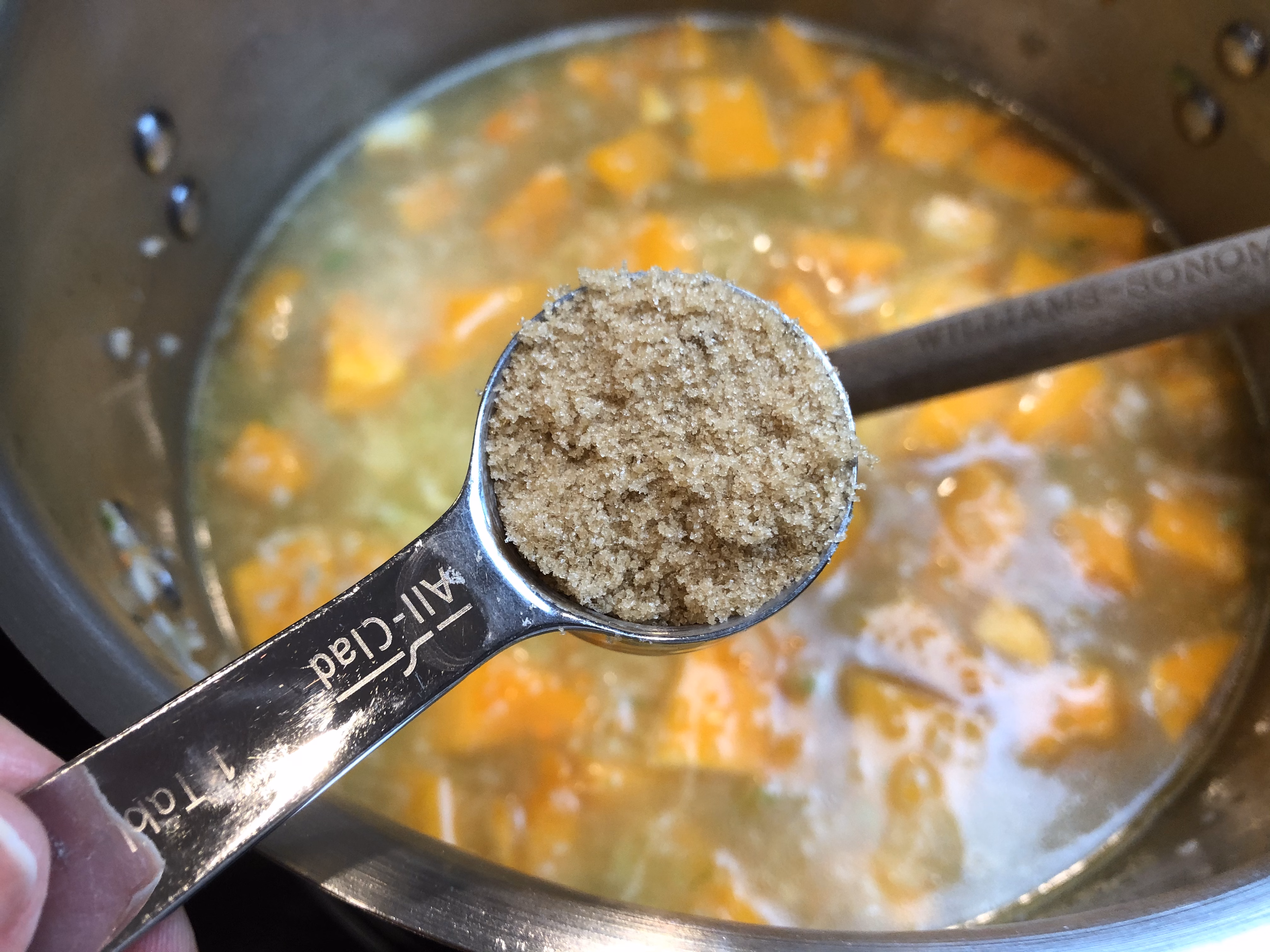 - 1 tablespoon olive oil1 tablespoon butter1/2 cup diced carrots2 stalks celery, diced1 cup diced onion4 garlic cloves, minced1 medium butternut squash, peeled and diced2 cups diced potatoes32 ounces chicken broth1 tablespoon brown sugar1 1/2 teaspoons kosher salt