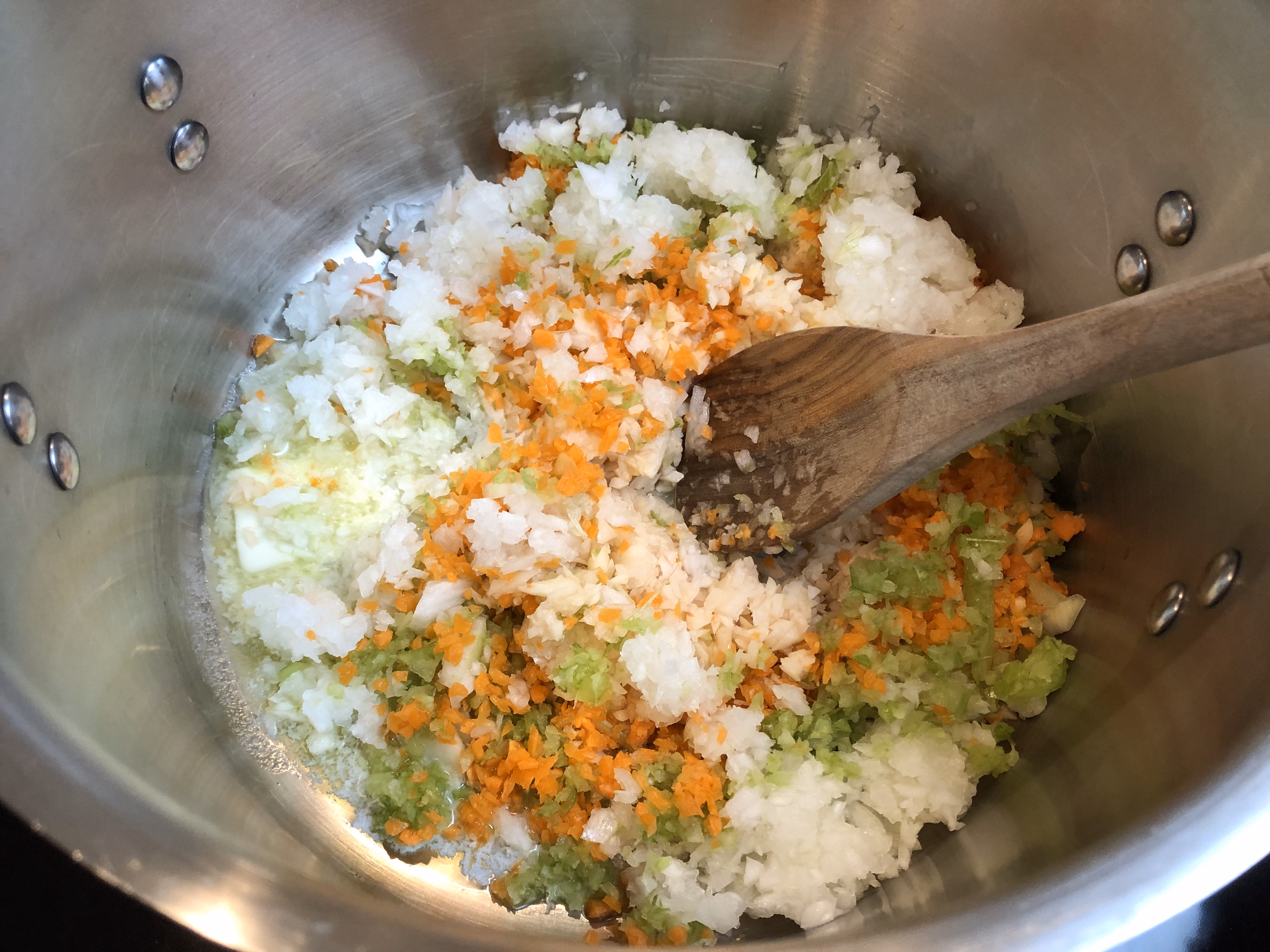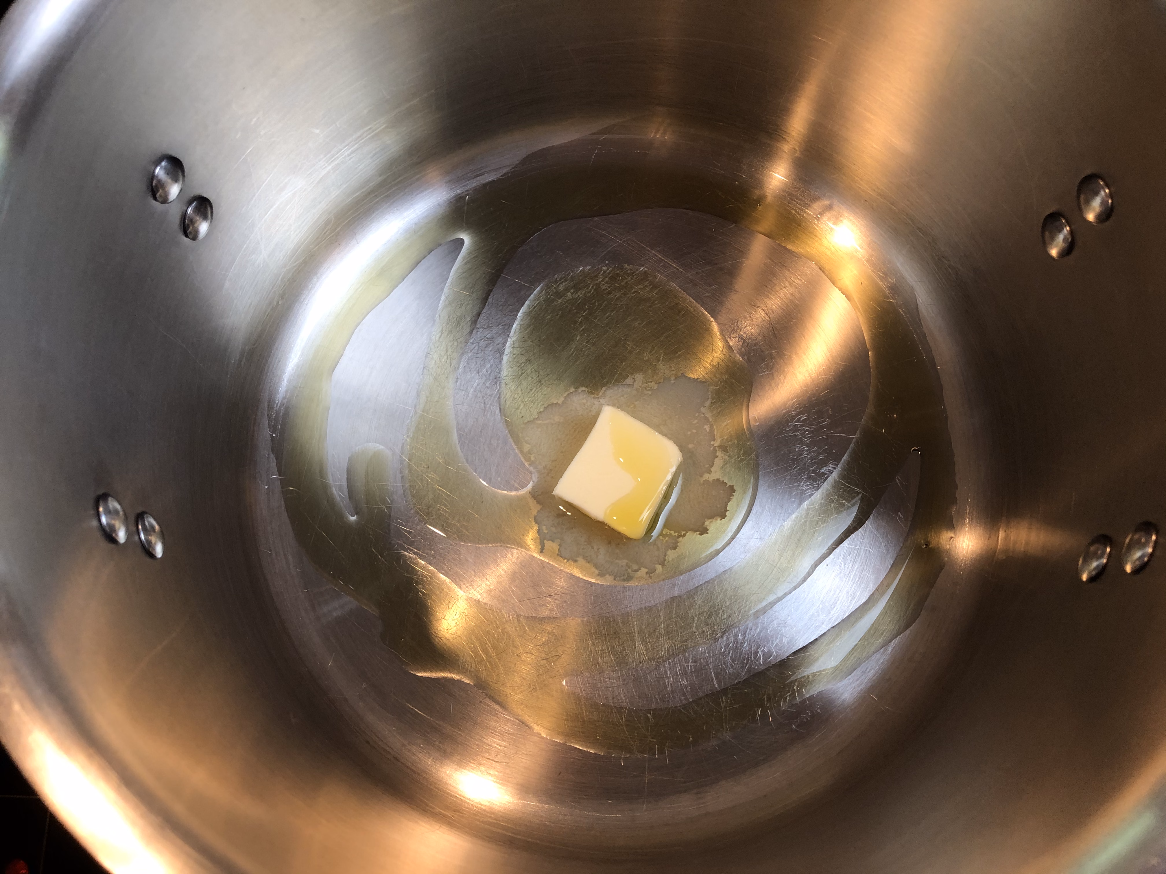 To a large stockpot, add a tablespoon of both butter and olive oil.